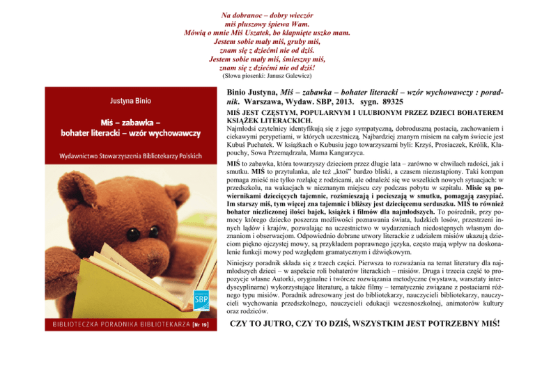 Na dobranoc – dobry wieczór miś pluszowy śpiewa Wam. Mówią o mnie Miś Uszatek, bo klapnięte uszko mam. Jestem sobie mały miś, gruby miś, znam się z dziećmi nie od dziś. Jestem sobie mały miś, śmieszny miś, znam się z dziećmi nie od dziś! (Słowa piosenki: Janusz Galewicz) Binio Justyna, Miś – zabawka – bohater literacki – wzór wychowawczy : poradnik. Warszawa, Wydaw. SBP, 2013. sygn. 89325 MIŚ JEST CZĘSTYM, POPULARNYM I ULUBIONYM PRZEZ DZIECI BOHATEREM KSIĄŻEK LITERACKICH. Najmłodsi czytelnicy identyfikują się z jego sympatyczną, dobroduszną postacią, zachowaniem i ciekawymi perypetiami, w których uczestniczą. Najbardziej znanym misiem na całym świecie jest Kubuś Puchatek. W książkach o Kubusiu jego towarzyszami byli: Krzyś, Prosiaczek, Królik, Kłapouchy, Sowa Przemądrzała, Mama Kangurzyca. MIŚ to zabawka, która towarzyszy dzieciom przez długie lata – zarówno w chwilach radości, jak i smutku. MIŚ to przytulanka, ale też „ktoś” bardzo bliski, a czasem niezastąpiony. Taki kompan pomaga znieść nie tylko rozłąkę z rodzicami, ale odnaleźć się we wszelkich nowych sytuacjach: w przedszkolu, na wakacjach w nieznanym miejscu czy podczas pobytu w szpitalu. Misie są powiernikami dziecięcych tajemnic, rozśmieszają i pocieszają w smutku, pomagają zasypiać. Im starszy miś, tym więcej zna tajemnic i bliższy jest dziecięcemu serduszku. MIŚ to również bohater niezliczonej ilości bajek, książek i filmów dla najmłodszych. To pośrednik, przy pomocy którego dziecko poszerza możliwości poznawania świata, ludzkich losów, przestrzeni innych lądów i krajów, pozwalając na uczestnictwo w wydarzeniach niedostępnych własnym doznaniom i obserwacjom. Odpowiednio dobrane utwory literackie z udziałem misiów ukazują dzieciom piękno ojczystej mowy, są przykładem poprawnego języka, często mają wpływ na doskonalenie funkcji mowy pod względem gramatycznym i dźwiękowym. Niniejszy poradnik składa się z trzech części. Pierwsza to rozważania na temat literatury dla najmłodszych dzieci – w aspekcie roli bohaterów literackich – misiów. Druga i trzecia część to propozycje własne Autorki, oryginalne i twórcze rozwiązania metodyczne (wystawa, warsztaty interdyscyplinarne) wykorzystujące literaturę, a także filmy – tematycznie związane z postaciami różnego typu misiów. Poradnik adresowany jest do bibliotekarzy, nauczycieli bibliotekarzy, nauczycieli wychowania przedszkolnego, nauczycieli edukacji wczesnoszkolnej, animatorów kultury oraz rodziców. CZY TO JUTRO, CZY TO DZIŚ, WSZYSTKIM JEST POTRZEBNY MIŚ!