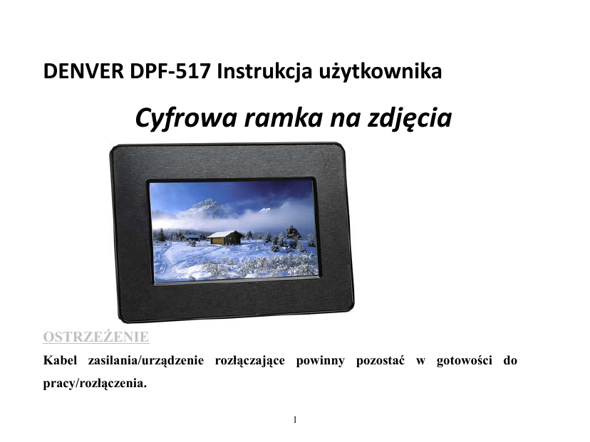 DENVER DPF‐517 Instrukcja użytkownika Cyfrowa ramka na zdjęcia OSTRZEŻENIE Kabel zasilania/urządzenie rozłączające powinny pozostać w gotowości do pracy/rozłączenia. 1 Wprowadzenie Gratulujemy zakupu cyfrowej ramki na zdjęcia Digital Photo Frame. Przed uruchomieniem urządzenia prosimy dokładnie zapoznać się z instrukcją i zachować ją na przyszłość. Dzięki instrukcji będzie można skorzystać z wszystkich atrakcyjnych funkcji urządzenia i oglądanie cyfrowej ramki na zdjęcia Digital Photo Frame będzie sprawiało większą przyjemność. Cyfrowa ramka na zdjęcia Digital Photo Frame umożliwia oglądanie cyfrowych zdjęć bezpośrednio z karty pamięci aparatu. Można także utworzyć pokaz slajdów z różnorodnymi efektami przejścia. Nie jest wymagane żadne połączenie z komputerem, aparatem cyfrowym ani Internetem. ●Odtwarza zdjęcia zapisane na urządzeniach do przechowywania danych poprzez port USB 2.0, różne czytniki kart lub z pamięci wbudowanej. 2 ●Obsługa kart SD, MMC oraz MS (Opcjonalnie). ●Urządzenie kompatybilne z większością aparatów cyfrowych zapisujących zdjęcia jako pliki JPEG. ●Automatyczny pokaz slajdów z różnorodnymi efektami przejścia oraz regulowanym czasem wyświetlania. ●Kartę pamięci należy wkładać rowkami w kierunku do siebie. Nie wkładaj karty pamięci do gniazda na siłę. ●Jeśli nie można łatwo włożyć karty pamięci do końca, być może jest włożona niewłaściwą stroną. Uwaga: DPF = Cyfrowa ramka na zdjęcia Digital Photo Frame. Środki zapobiegawcze i konserwacja • Wyłącznie do użytku w pomieszczeniach. • Aby uniknąć uszkodzenia plików lub porażenia elektrycznego, nie należy narażać tego 3 urządzenia na wilgoć. • Aby uniknąć przegrzania, nigdy nie należy blokować otworów wentylacyjnych z tyłu ramki. • Multimedialną cyfrową ramkę na zdjęcia należy trzymać z dala od bezpośredniego światła słonecznego. Bezpośrednie światło słoneczne może ją uszkodzić. • Nie należy rozmontowywać multimedialnej cyfrowej ramki na zdjęcia. Istnieje zagrożenie porażeniem elektrycznym. W środku nie ma części, które użytkownik mógłby serwisować samodzielnie. Rozmontowanie multimedialnej cyfrowej ramki na zdjęcia unieważni gwarancję. • Nie należy używać multimedialnej cyfrowej ramki na zdjęcia, jeśli warunki mogłyby doprowadzić do kondensacji lub uszkodzenia. 4 Ramka DPF widok z boku ●DC (+12V): Wejście DC przewodu zasilającego odtwarzacz DPF. ●Karta SD/MMC: Gniazdo w odtwarzaczu DPF na kartę SD/MMC oraz kartę MS (Opcjonalnie). ●Gniazdo USB: Gniazdo w odtwarzaczu DPF na pamięć USB (Opcjonalnie). 5 DC Karta SD/MMC Gniazdo USB Przegląd odtwarzacza Przyciski kontrolne i funkcyjne: 1. PRZYCISK ENTER: Zatwierdza wybór. Służy także do rozpoczęcia lub wstrzymania odtwarzania. 2. PRZYCISK ZMIANY W LEWO(e): Lewy kursor wybierający funkcję i następne zdjęcie. 6 3. PRZYCISK ZMIANY W PRAWO (f): Prawy kursor wybierający funkcję i poprzednie zdjęcie. 4. PRZYCISK MENU: Pokazuje menu wyboru. 5. PRZYCISK DO GÓRY (▲): Przycisk wyboru funkcji oraz kursor obracania od dołu do góry. 6. PRZYCISK W DÓŁ(▼): Przycisk wyboru funkcji oraz kursor czasu/daty od góry do dołu. 7. PRZYCISK STANU GOTOWOŚCI: WŁĄCZANIE/WYŁĄCZANIE odtwarzania. 8. Gniazdko na podpórkę. 7 Opis przycisków funkcyjnych pilota (element opcjonalny) 1. SETUP: Menu kontrolne do ustawiania odtwarzacza. 2. ENTER: Zatwierdza wybraną funkcję. 3. STRZAŁKA W LEWO: Kursor wyboru funkcji w lewo. 4. EXIT: Wyjście z bieżącej funkcji. 5. STRZAŁKA W DÓŁ: Kursor wyboru funkcji z góry do dołu 6. ZOOM: Pomniejszenie podglądu zdjęcia. 7. ROTATE: Obracanie podglądu zdjęcia. 8. SLIDE SHOW: Przycisk wyboru slajdu. 9. STRZAŁKA W PRAWO: Kursor wyboru funkcji w prawo. 10. STRZAŁKA W GÓRĘ: Kursor wyboru funkcji z dołu do góry. 8 11. POWER: Używany do włączania/wyłączania odtwarzacza. 9 Czynności wstępne Umieść podpórkę w ramce Digital Photo Frame, aby podeprzeć ramkę. Podłącz wtyczkę zasilacza DC najpierw do odtwarzacza DPF, a następnie podłącz przewód zasilający do standardowego gniazdka w ścianie. Po włożeniu do ramki karty pamięci lub pamięci flash USB, zdjęcia zapisane na karcie pamięci lub pamięci flash USB automatycznie zaczną się pojawiać na ekranie. Zasilacz sieciowy DPF Gniazdko 10 11 Funkcje DPF ●WYBÓR KARTY W modelu z pokazem slajdów naciśnij trzykrotnie przycisk Standby, aby wyświetlić menu wyboru urządzenia. Naciśnij przyciski strzałek, aby wybrać kartę, tarczę U albo pamięć wbudowaną (karta MS lub USB opcjonalnie). Naciśnij przycisk Enter, aby zatwierdzić (Rys.1). Rys.1 Rys.2 12 ●GŁÓWNE FUNKCJE Po wybraniu urządzenia, za pomocą przycisków strzałek można wybrać główne funkcje, takie jak Pokaz slajdów, Zdjęcie oraz Kalendarz (Rys.2). Naciśnij przycisk Enter wybierając określony tryb funkcji. 1. Pokaz slajdów: W tej funkcji menu naciśnięcie przycisku Enter włącza tryb pokazu slajdów, odtwarzacz wyświetli zdjęcie automatycznie. 2. Zdjęcie: Ta funkcja pozwala przeglądać zdjęcia w pojedynczym oknie albo sześciu oknach. 3. Kalendarz: Ta funkcja wyświetla użytkownikowi kalendarz oraz zegar. ●FUNKCJA ZDJĘCIA W tym trybie funkcji (Rys.3). 1. Naciśnij przyciski strzałek, aby wybrać przegląd zdjęć w sześciu oknach. 13 2. Naciśnij przycisk Enter, aby wyświetlić obrazki. 3. Naciśnij przycisk Menu, aby wyświetlić menu ustawień w pauzie pokazu slajdów. 4. Naciśnij przycisk Standby, aby wyjść do Rys.3 głównego trybu funkcji. ●FUNKCJA KALENDARZA Funkcja ta służy do wyświetlania kalendarza oraz zegara (Rys.4). 1. Za pomocą przycisków strzałek można przeglądać kalendarz pokazywany po lewej stronie Rys.4 ramki DPF. 2. Jeśli na wybranej karcie znajdują się pliki jpg, można przeglądać zdjęcia w małym oknie. 3. Naciśnięcie przycisku Standby oznacza w