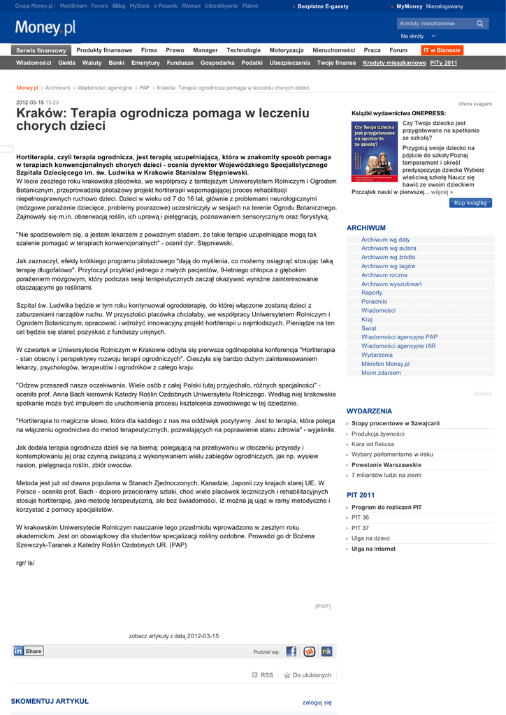 Grupa Money.pl : MenStream Favore BBlog MyStock e-Prawnik iWoman Interaktywnie Platine Bezpłatne E-gazety MyMoney Niezalogowany Kredyty mieszkaniowe Na skróty Serwis finansowy Wiadomości Money.pl Giełda Archiwum Produkty finansowe Waluty Banki Firma Emerytury Wiadomości agencyjne PAP Prawo Manager Fundusze Technologie Gospodarka Motoryzacja Podatki Nieruchomości Ubezpieczenia Twoje finanse Praca Forum IT w Biznesie Kredyty mieszkaniowe PITy 2011 Kraków: Terapia ogrodnicza pomaga w leczeniu chorych dzieci 2012-03-15 13:23 Oferta księgarni Kraków: Terapia ogrodnicza pomaga w leczeniu chorych dzieci Książki wydawnictwa ONEPRESS: Czy Twoje dziecko jest przygotowane na spotkanie ze szkołą? Hortiterapia, czyli terapia ogrodnicza, jest terapią uzupełniającą, która w znakomity sposób pomaga w terapiach konwencjonalnych chorych dzieci - ocenia dyrektor Wojewódzkiego Specjalistycznego Szpitala Dziecięcego im. św. Ludwika w Krakowie Stanisław Stępniewski. W lecie zeszłego roku krakowska placówka, we współpracy z tamtejszym Uniwersytetem Rolniczym i Ogrodem Botanicznym, przeprowadziła pilotażowy projekt hortiterapii wspomagającej proces rehabilitacji niepełnosprawnych ruchowo dzieci. Dzieci w wieku od 7 do 16 lat, głównie z problemami neurologicznymi (mózgowe porażenie dziecięce, problemy pourazowe) uczestniczyły w sesjach na terenie Ogrodu Botanicznego. Zajmowały się m.in. obserwacją roślin, ich uprawą i pielęgnacją, poznawaniem sensorycznym oraz florystyką. Przygotuj swoje dziecko na pójście do szkoły Poznaj temperament i określ predyspozycje dziecka Wybierz właściwą szkołę Naucz się bawić ze swoim dzieckiem Początek nauki w pierwszej... więcej » Kup książkę ARCHIWUM "Nie spodziewałem się, a jestem lekarzem z poważnym stażem, że takie terapie uzupełniające mogą tak szalenie pomagać w terapiach konwencjonalnych" - ocenił dyr. Stępniewski. Jak zaznaczył, efekty krótkiego programu pilotażowego "dają do myślenia, co możemy osiągnąć stosując taką terapię długofalowo". Przytoczył przykład jednego z małych pacjentów, 9-letniego chłopca z głębokim porażeniem mózgowym, który podczas sesji terapeutycznych zaczął okazywać wyraźne zainteresowanie otaczającymi go roślinami. Szpital św. Ludwika będzie w tym roku kontynuował ogrodoterapię, do której włączone zostaną dzieci z zaburzeniami narządów ruchu. W przyszłości placówka chciałaby, we współpracy Uniwersytetem Rolniczym i Ogrodem Botanicznym, opracować i wdrożyć innowacyjny projekt hortiterapii u najmłodszych. Pieniądze na ten cel będzie się starać pozyskać z funduszy unijnych. W czwartek w Uniwersytecie Rolniczym w Krakowie odbyła się pierwsza ogólnopolska konferencja "Hortiterapia - stan obecny i perspektywy rozwoju terapii ogrodniczych". Cieszyła się bardzo dużym zainteresowaniem lekarzy, psychologów, terapeutów i ogrodników z całego kraju. Archiwum wg daty Archiwum wg autora Archiwum wg źródła Archiwum wg tagów Archiwum roczne Archiwum wyszukiwań Raporty Poradniki Wiadomości Kraj Świat Wiadomości agencyjne PAP Wiadomości agencyjne IAR Wydarzenia Mikrofon Money.pl Moim zdaniem "Odzew przeszedł nasze oczekiwania. Wiele osób z całej Polski tutaj przyjechało, różnych specjalności" oceniła prof. Anna Bach kierownik Katedry Roślin Ozdobnych Uniwersytetu Rolniczego. Według niej krakowskie spotkanie może być impulsem do uruchomienia procesu kształcenia zawodowego w tej dziedzinie. WYDARZENIA "Hortiterapia to magiczne słowo, która dla każdego z nas ma oddźwięk pozytywny. Jest to terapia, która polega na włączeniu ogrodnictwa do metod terapeutycznych, pozwalających na poprawienie stanu zdrowia" - wyjaśniła. Jak dodała terapia ogrodnicza dzieli się na bierną: polegającą na przebywaniu w otoczeniu przyrody i kontemplowaniu jej oraz czynną związaną z wykonywaniem wielu zabiegów ogrodniczych, jak np. wysiew nasion, pielęgnacja roślin, zbiór owoców. Stopy procentowe w Szwajcarii Produkcja żywności Kara od fiskusa Wybory parlamentarne w iraku Powstanie Warszawskie 7 miliardów ludzi na ziemi Metoda jest już od dawna popularna w Stanach Zjednoczonych, Kanadzie, Japonii czy krajach starej UE. W Polsce - oceniła prof. Bach - dopiero przecieramy szlaki, choć wiele placówek leczniczych i rehabilitacyjnych stosuje hortiterapię, jako metodę terapeutyczną, ale bez świadomości, iż można ją ująć w ramy metodyczne i korzystać z pomocy specjalistów. PIT 2011 Program do rozliczeń PIT PIT 36 W krakowskim Uniwersytecie Rolniczym nauczanie tego przedmiotu wprowadzono w zeszłym roku akademickim. Jest on obowiązkowy dla studentów specjalizacji rośliny ozdobne. Prowadzi go dr Bożena Szewczyk-Taranek z Katedry Roślin Ozdobnych UR. (PAP) PIT 37 Ulga na dzieci Ulga na internet rgr/ ls/ (PAP) zobacz artykuły z datą 2012-03-15 Share Podziel się: RSS SKOMENTUJ ARTYKUŁ Do ulubionych zaloguj się Tytuł: Re: Kraków: Terapia ogrodnicza pomaga w leczeniu chorych dzieci 5 Komentarz: 6 Autor: E-mail: Wyślij b Poinformuj mnie mailem o pierwszej odpowiedzi. c d e f g © 2012 Money.pl Sp. z o.o. O nas Centrum prasowe Reklama Mapa serwisu Regulamin Praca w Money.pl Na skróty Kontakt Pomoc Dla webmasterów iMoney w Twoim iPhonie Wersja dla komórek RSS Akademia Money.pl Portal finansowy Produkty finansowe Serwis dla firm Nieruchomości Motoryzacja Kalkulatory Prawo Praca Monetized by Program TV Pogoda GPW Kurs Euro Kurs Dolara Rejestr Firm PITy 2011 Raporty Wydarzenia