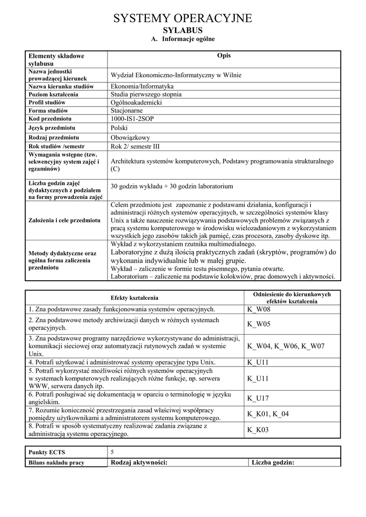 SYSTEMY OPERACYJNE SYLABUS A. Informacje ogólne Elementy składowe sylabusu Nazwa jednostki prowadzącej kierunek Nazwa kierunku studiów Poziom kształcenia Profil studiów Forma studiów Kod przedmiotu Język przedmiotu Rodzaj przedmiotu Rok studiów /semestr Wymagania wstępne (tzw. sekwencyjny system zajęć i egzaminów) Liczba godzin zajęć dydaktycznych z podziałem na formy prowadzenia zajęć Założenia i cele przedmiotu Metody dydaktyczne oraz ogólna forma zaliczenia przedmiotu Opis Wydział Ekonomiczno-Informatyczny w Wilnie Ekonomia/Informatyka Studia pierwszego stopnia Ogólnoakademicki Stacjonarne 1000-IS1-2SOP Polski Obowiązkowy Rok 2/ semestr III Architektura systemów komputerowych, Podstawy programowania strukturalnego (C) 30 godzin wykładu + 30 godzin laboratorium Celem przedmiotu jest zapoznanie z podstawami działania, konfiguracji i administracji różnych systemów operacyjnych, w szczególności systemów klasy Unix a także nauczenie rozwiązywania podstawowych problemów związanych z pracą systemu komputerowego w środowisku wielozadaniowym z wykorzystaniem wszystkich jego zasobów takich jak pamięć, czas procesora, zasoby dyskowe itp. Wykład z wykorzystaniem rzutnika multimedialnego. Laboratoryjne z dużą ilością praktycznych zadań (skryptów, programów) do wykonania indywidualnie lub w małej grupie. Wykład – zaliczenie w formie testu pisemnego, pytania otwarte. Laboratorium – zaliczenie na podstawie kolokwiów, prac domowych i aktywności. Efekty kształcenia Odniesienie do kierunkowych efektów kształcenia 1. Zna podstawowe zasady funkcjonowania systemów operacyjnych. K_W08 2. Zna podstawowe metody archiwizacji danych w różnych systemach operacyjnych. K_W05 3. Zna podstawowe programy narzędziowe wykorzystywane do administracji, komunikacji sieciowej oraz automatyzacji rutynowych zadań w systemie Unix. 4. Potrafi użytkować i administrować systemy operacyjne typu Unix. 5. Potrafi wykorzystać możliwości różnych systemów operacyjnych w systemach komputerowych realizujących różne funkcje, np. serwera WWW, serwera danych itp. 6. Potrafi posługiwać się dokumentacją w oparciu o terminologię w języku angielskim. 7. Rozumie konieczność przestrzegania zasad właściwej współpracy pomiędzy użytkownikami a administratorem systemu komputerowego. 8. Potrafi w sposób systematyczny realizować zadania związane z administracją systemu operacyjnego. Punkty ECTS 5 Bilans nakładu pracy Rodzaj aktywności: K_W04, K_W06, K_W07 K_U11 K_U11 K_U17 K_K01, K_04 K_K03 Liczba godzin: studenta Wskaźniki ilościowe Data opracowania: Udział w wykładach Udział w laboratorium Przygotowanie do laboratorium Opracowanie zadań domowych Konsultacje Przygotowanie do kolokwium 30 30 30 15 5 10 Razem: 120 Nakład pracy studenta związany z zajęciami: Liczba godzin Punkty ECTS 65 3 60 3 wymagającymi bezpośredniego udziału nauczyciela o charakterze praktycznym 01.10.2013 Koordynator przedmiotu: Dr Adam Naumowicz SYSTEMY OPERACYJNE - WYKŁAD SYLABUS B. Informacje szczegółowe Elementy składowe sylabusu Nazwa przedmiotu Kod przedmiotu Nazwa kierunku Nazwa jednostki prowadzącej kierunek Język przedmiotu Rok studiów/ semestr Liczba godzin zajęć dydaktycznych oraz forma prowadzenia zajęć Liczba punktów ECTS Prowadzący Treści merytoryczne przedmiotu Efekty kształcenia wraz ze sposobem ich weryfikacji Forma i warunki zaliczenia przedmiotu Wykaz literatury podstawowej i uzupełniającej Opis Systemy operacyjne 1000-IS1-2SOP Informatyka Wydział Ekonomiczno-Informatyczny w Wilnie Polski Rok 1/ semestr III 30 godzin wykładu Dr Adam Naumowicz 1. Ogólna charakterystyka systemów operacyjnych. 2. Identyfikacja użytkowników i dostęp do zasobów w systemie. 3. Mechanizm redirekcji i budowanie potoków poleceń. 4. Unixowe narzędzia do archiwizacji i kompresji danych. 5. Nazwy wieloznaczne i wyrażenia regularne. 6. Przegląd podstawowych programów narzędziowych w Unixie. 7. Skrypty powłoki systemowej. 8. Zarządzanie procesami i wątkami. 9. Proces ładowania i startu systemu. 10. Mechanizmy działania współbieżnego. 11. Algorytmy szeregowania zadań. 12. Urządzenia wejścia-wyjścia i system plików. 13. Działanie systemu w środowisku sieciowym – podstawowe protokoły i usługi. 14. Konfiguracja i kompilacja jądra systemu Linux. 15. Rutynowe prace administracyjne. 1. Zna podstawowe zasady funkcjonowania systemów operacyjnych. 2. Zna podstawowe metody archiwizacji danych w różnych systemach operacyjnych. 3. Zna podstawowe programy narzędziowe wykorzystywane do administracji, komunikacji sieciowej oraz automatyzacji rutynowych zadań w systemie Unix. 4. Potrafi użytkować i administrować systemy operacyjne typu Unix. Weryfikacja efektów w postaci testu pisemnego. Zaliczenie wykładu w postaci testu pisemnego. Lektura podstawowa: W. Stallings, Systemy operacyjne. Robomatic, 2004. E. Nemeth i in., Przewodnik administratora systemu Unix. WNT, 1998. Lektura uzupełniająca: A. Frisch, Unix. Administracja systemu. Wyd. 3. ReadMe / O'Reilly, 2003. Silberschatz, J.L. Peterson, G. Gagne, Podstawy systemów operacyjnych. WNT, 2005. C. Sobaniec, System operacyjny Linux — przewodnik użytkownika. Nakom, 2002. S. Prata, D. Martin, Biblia systemu UNIX V. LT&P,1994. ………………………………. podpis osoby składającej sylabus Systemy operacyjne B. Informacje szczegółowe Elementy składowe przedmiotu Opis Nazwa przedmiotu Systemy operacyjne Kod przedmiotu 1000-IS1-2SOP Nazwa kierunku Informatyka Nazwa jednostki prowadzącej kierunek Wydział Ekonomiczno-Informatyczny w Wilnie Język przedmiotu Polski Liczba godzin zajęć dydaktycznych oraz forma prowadzenia zajęć Laboratorium, 30 godz. Rok studiów / semestr Rok 1/ semestr III Liczba punktów ECTS 5 Prowadzący Mgr inż Mirosław Najbuk Treści merytoryczne przedmiotu Instalacja systemu operacyjnego Linux na przykładzie dystrybucji Debian. Zapoznanie się z drzew