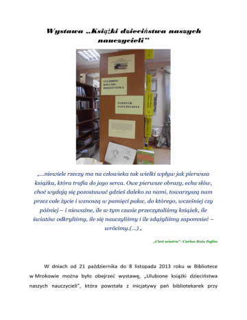 Wystawa „Książki dzieciństwa naszych nauczycieli” „...niewiele rzeczy ma na człowieka tak wielki wpływ jak pierwsza książka, która trafia do jego serca. Owe pierwsze obrazy, echa słów, choć wydają się pozostawać gdzieś daleko za nami, towarzyszą nam przez całe życie i wznoszą w pamięci pałac, do którego, wcześniej czy później – i nieważne, ile w tym czasie przeczytaliśmy książek, ile światów odkryliśmy, ile się nauczyliśmy i ile zdążyliśmy zapomnieć – wrócimy.(...) „ „Cień wiatru”- Carlos Ruiz Zafón W dniach od 21 października do 8 listopada 2013 roku w Bibliotece w Mrokowie można było obejrzeć wystawę, „Ulubione książki dzieciństwa naszych nauczycieli”, która powstała z inicjatywy pań bibliotekarek przy życzliwym zaangażowaniu i wsparciu Pani Dyrektor. Wielu nauczycieli zechciało podzielić się swoimi pamiątkowymi książkami z lat dziecięcych. Szczególnie cenne i ciekawe okazały się książki, podarowane na czas wystawy, przez panią Dyrektor Małgorzatę Perzynę, Panią Annę Miecznik, czy panią Jolantę Januszewicz, gdyż były to autentyczne wydania książek z lat dzieciństwa, często z osobistymi dedykacjami. Wystawa wzbudzała wiele emocji ze strony dzieci oraz dorosłych, odwiedzających bibliotekę. Bardzo często padały słowa, zarówno ze strony dzieci, jak i ich rodziców: ”Jesteśmy ciekawi, co czytała nasza Pani”. Z pewnością tego typu inicjatywy są potrzebne młodemu pokoleniu, które w dobie wszechobecnej technologii zapomina o zwykłej papierowej książce oraz o pięknym, mającym długą tradycję, zwyczaju obdarowywania się książkami wraz z pamiątkowym, okolicznościowym wpisem. Agnieszka Kostyra Joanna Konofalska