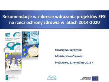 Rekomendacje w zakresie wdrażania projektów EFSI na rzecz ochrony zdrowia w latach 2014-2020 Katarzyna Przybylska Ministerstwo Zdrowia Warszawa, 11 września 2015 r. Informacje ogólne • prace nad dokumentem trwają – planowane upowszechnienie dokumentu – wrzesień 2015 r. • instytucja odpowiedzialna – Sekretariat Komitetu Sterującego ds. koordynacji interwencji EFSI w sektorze zdrowia (DFE w MZ) • instytucje zaangażowane – Ministerstwo Infrastruktury i Rozwoju Struktura dokumentu „Rekomendacje w zakresie wdrażania projektów EFSI na rzecz ochrony zdrowia w latach 2014-2020” I. Warunkowość ex ante II. Rekomendacje horyzontalne wynikające z UP i PP III. Rekomendacje właściwe dla PO WER IV. Rekomendacje właściwe dla PO IŚ V. Rekomendacje właściwe dla RPO VI. Kontakt z Sekretariatem KS I. Warunkowość ex ante 8.4 Aktywne i zdrowe starzenie się Warunek - została opracowana polityka dotycząca aktywnego starzenia się w świetle wytycznych dotyczących zatrudnienia Kryterium wypełnienia - państwo członkowskie przygotowało działania mające na celu promowanie aktywnego starzenia się Status – warunek uznany za spełniony w całości I. Warunkowość ex ante 9.3 Zdrowie: Warunek - istnienie krajowych lub regionalnych strategicznych ram polityki zdrowotnej w zakresie określonym w art. 168 TFUE, zapewniających stabilność ekonomiczną Kryterium - gotowe są krajowe lub regionalne strategiczne ramy polityki zdrowotnej, które: zawierają skoordynowane środki poprawiające dostęp do wysokiej jakości świadczeń zdrowotnych zawierają środki mające na celu stymulowanie efektywności w sektorze opieki zdrowotnej poprzez wprowadzanie modeli świadczenia usług i infrastruktury obejmują system monitorowania i przeglądu Status – warunek uznany za spełniony w części - obszarem wymagającym dalszych prac w celu uznania warunku za spełniony w całości pozostaje system mapowania potrzeb zdrowotnych II. Rekomendacje horyzontalne Umowa partnerstwa wskazuje uzgodnione z Komisją Europejską zasady i warunki, na których realizowane będą inwestycje finansowane ze środków europejskich na lata 2014‐2020, komplementarnie do działań podejmowanych ze środków krajowych podkreśla selektywne podejście i koncentrację zakresu wsparcia sektora zdrowia jedynie na tych aspektach lub grupach chorobowych, które mają największy wpływ na zdolność zatrudnieniową Polaków bądź poprawę jakości lub dostępu do tych usług medycznych i na tych terytoriach, dla których z analizy deficytów wynika potrzeba poprawy sytuacji w celu zmniejszenia lub zapobiegania wykluczeniu społecznemu wynikającego z powyższych przyczyn II. Rekomendacje horyzontalne Umowa partnerstwa ustanawia m.in. Komitet Sterujący ds. koordynacji interwencji EFSI w sektorze zdrowia i Plan działań w sektorze zdrowia stwierdza, że warunkiem koniecznym dla podejmowania interwencji w sektorze zdrowia jest ich zgodność z Planem Działań uzgodnionym przez Komitet Sterujący w sektorze zdrowia narzuca, że minister właściwy ds. rozwoju regionalnego (krajowa jednostka ewaluacji) we współpracy z ministrem właściwym ds. zdrowia przeprowadza okresową ewaluację realizowanych planów działań stwierdza, że spełnienie warunku ex ante w zakresie zdrowia umożliwia uruchomienie środków na lata 2014-2020 w tym obszarze; do czasu wypełnienia przez Polskę ww. warunku, Komisja Europejska może zawiesić całość lub część płatności, zgodnie z art. 19 ust. 5 rozporządzenia ramowego II. Rekomendacje horyzontalne Policy Paper szczegółowy zakres zadań Komitetu Sterującego rola Komitetu Sterującego w procesie wyboru projektów proces mapowania potrzeb zdrowotnych 5 grup chorób: 1. Układu krążenia 2. Nowotwory 3. Zaburzenia psychiczne i zaburzenia zachowania 4. Układu kostno-stawowego i mięśniowego 5. Układu oddechowego II. Rekomendacje horyzontalne Promowane będą projekty: efektywne kosztowo i realizowane przez podmioty, które wykazują największą efektywność finansową, przewidujące działania konsolidacyjne i inne formy współpracy podmiotów leczniczych, działania w zakresie reorganizacji i restrukturyzacji wewnątrz podmiotów leczniczych, w celu maksymalizacji wykorzystania infrastruktury, w tym sąsiadującej, oraz stopnia jej dostosowania do istniejących deficytów. II. Rekomendacje horyzontalne Mapowanie możliwość rozpoczęcia prac przygotowawczych do realizacji wsparcia, w szczególności zatwierdzenia kryteriów oceny projektów przez Komitety Monitorujące właściwe programy operacyjne (z uwzględnieniem roli Komitetu Sterującego), przed udostępnieniem map potrzeb zdrowotnych możliwość natychmiastowego rozpoczęcia realizacji inwestycji wraz z chwilą udostępnienia map potrzeb zdrowotnych w danym obszarze epidemiologicznym (ogłaszanie konkursów, podpisywanie umów, certyfikacja wydatków) możliwość rozpoczęcia realizacji inwestycji na własne ryzyko beneficjenta w sytuacji braku udostępnionych map potrzeb zdrowotnych w danym obszarze – w przypadku, gdy inwestycja nie będzie zgodna z mapami potrzeb, poniesione koszty nie będą mogły być certyfikowane/ refundowane ze środków UE obowiązek mapowania potrzeb zdrowotnych nie dotyczy obszaru e-zdrowia II. Rekomendacje horyzontalne Opinie wojewodów Zgodnie z art. 26 pkt 3 ustawy z dnia 22 lipca 2014 r. o zmianie ustawy o świadczeniach opieki zdrowotnej finansowanych ze środków publicznych oraz niektórych innych ustaw, dodawane do ustawy art. 95d i art. 95e dotyczące obowiązku wydawania przez wojewodów opinii o celowości inwestycji, wejdą w życie dopiero z dniem 30 czerwca 2016 r. Zatem dopiero od tego dnia wojewodowie nabędą stosowne kompetencje (oraz powstanie podstawa prawna) do ich wydawania. A zatem, w okresie do 30 czerwca 2016 r. wydawanie opinii, o których mowa w ustawie nie jest wymagane. Pytanie – w jaki sposób zastąpić opinię wojewody w ww. okres
