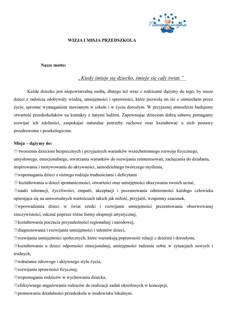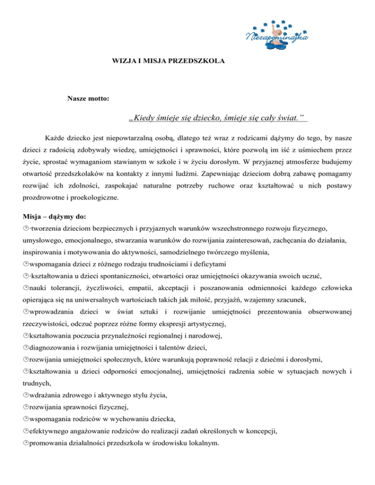 WIZJA I MISJA PRZEDSZKOLA Nasze motto: „Kiedy śmieje się dziecko, śmieje się cały świat.” Każde dziecko jest niepowtarzalną osobą, dlatego też wraz z rodzicami dążymy do tego, by nasze dzieci z radością zdobywały wiedzę, umiejętności i sprawności, które pozwolą im iść z uśmiechem przez życie, sprostać wymaganiom stawianym w szkole i w życiu dorosłym. W przyjaznej atmosferze budujemy otwartość przedszkolaków na kontakty z innymi ludźmi. Zapewniając dzieciom dobrą zabawę pomagamy rozwijać ich zdolności, zaspokajać naturalne potrzeby ruchowe oraz kształtować u nich postawy prozdrowotne i proekologiczne. Misja – dążymy do: ·tworzenia dzieciom bezpiecznych i przyjaznych warunków wszechstronnego rozwoju fizycznego, umysłowego, emocjonalnego, stwarzania warunków do rozwijania zainteresowań, zachęcania do działania, inspirowania i motywowania do aktywności, samodzielnego twórczego myślenia, wspomagania dzieci z różnego rodzaju trudnościami i deficytami ·kształtowania u dzieci spontaniczności, otwartości oraz umiejętności okazywania swoich uczuć, nauki tolerancji, życzliwości, empatii, akceptacji i poszanowania odmienności każdego człowieka opierająca się na uniwersalnych wartościach takich jak miłość, przyjaźń, wzajemny szacunek, wprowadzania dzieci w świat sztuki i rozwijanie umiejętności prezentowania obserwowanej rzeczywistości, odczuć poprzez różne formy ekspresji artystycznej, kształtowania poczucia przynależności regionalnej i narodowej, diagnozowania i rozwijania umiejętności i talentów dzieci, rozwijania umiejętności społecznych, które warunkują poprawność relacji z dziećmi i dorosłymi, kształtowania u dzieci odporności emocjonalnej, umiejętności radzenia sobie w sytuacjach nowych i trudnych, wdrażania zdrowego i aktywnego stylu życia, rozwijania sprawności fizycznej, wspomagania rodziców w wychowaniu dziecka, efektywnego angażowanie rodziców do realizacji zadań określonych w koncepcji, promowania działalności przedszkola w środowisku lokalnym. Wizja ► Wykorzystujemy naturalną potrzebę ruchu i eksplorowania otoczenia tak, aby dziecko żyło w zgodzie z własnym ciałem i umysłem, w harmonii z otaczającym światem i przyrodą. ► Każdemu dziecku zapewniamy wszechstronny i bezpieczny rozwój zgodny z jego indywidualnym tempem rozwoju, potrzebami, oczekiwaniami, zainteresowaniami i zdolnościami. ► Nasze działania wychowawczo-dydaktyczne opieramy na sprawdzonych i uznanych metodach pracy oraz dążymy do wdrażania rozwiązań innowacyjnych przynoszących znaczące efekty w pracy z wychowankami i we współpracy z rodzicami. ► Przedszkolaki posługują się różnymi sposobami ekspresji: słowną, muzyczną, plastyczną, ruchową. ► Wychowankowie cechują się otwartością, kreatywnością, samodzielnością oraz życzliwością do świata i ludzi. ►Staramy się stworzyć warunki dające dzieciom szansę , by stawały się: otwarte na ludzi , samodzielne, gotowe do podejmowania ryzyka, radzące sobie w różnych, często trudnych sytuacjach, wierzące w swoje możliwości, odpowiedzialne. ► Zapewniamy Dzieciom serdeczną atmosferę, poczucie akceptacji, bezpieczeństwa oraz poszanowanie godności. ►Zapewniamy kompetentną kadrę, która bierze udział w różnych formach doskonalenia co umożliwia pełną realizację zadań placówki, a dzieciom zapewnia wychowanie i edukację na najwyższym poziomie. ►Rodzice wychowanków są współtwórcami sukcesów swoich dzieci, mają zawsze wsparcie i pomoc z naszej strony w ich roli wychowawczej , otrzymują informacje o postępach i osiągnięciach dzieci. ► Baza, wyposażenie, estetyka pomieszczeń i otoczenia wpływają na wysoki poziom pracy. Naszej misji i wizji przyświeca cel zawarty w myślach patrona Przedszkola Janusz Korczaka. Dzięki wielu tekstom J. Korczaka powstał „Apel Twojego Dziecka”, który jest wyznacznikiem w naszej codziennej pracy z wychowankami. APEL TWOJEGO DZIECKA 1. Nie psuj mnie. Dobrze wiem, że nie powinienem mieć tego wszystkiego, czego się domagam. To tylko próba sił z mojej strony. 2. Nie bój się stanowczości. Właśnie tego potrzebuję – poczucia bezpieczeństwa. 3. Nie bagatelizuj moich złych nawyków. Tylko ty możesz pomóc mi zwalczyć zło, póki jest to jeszcze w ogóle możliwe. 4. Nie rób ze mnie większego dziecka, niż jestem. To sprawia, że przyjmuje postawę głupio dorosłą. 5. Nie zwracaj mi uwagi przy innych ludziach, jeśli nie jest to absolutnie konieczne. O wiele bardziej przejmuję się tym, co mówisz, jeśli rozmawiamy w cztery oczy. 6. Nie chroń mnie przed konsekwencjami. Czasami dobrze jest nauczyć się rzeczy bolesnych i nieprzyjemnych. 7. Nie wmawiaj mi, że błędy, które popełniam, są grzechem. To zagraża mojemu poczuciu wartości. 8. Nie przejmuj się za bardzo, gdy mówię, że cię nienawidzę. To nie ty jesteś moim wrogiem, lecz twoja miażdżąca przewaga ! 9. Nie zwracaj zbytniej uwagi na moje drobne dolegliwości. Czasami wykorzystuję je, by przyciągnąć twoją uwagę. 10. Nie zrzędź. W przeciwnym razie muszę się przed tobą bronić i robię się głuchy. 11. Nie dawaj mi obietnic bez pokrycia. Czuję się przeraźliwie tłamszony, kiedy nic z tego wszystkiego nie wychodzi. 12. Nie zapominaj, że jeszcze trudno mi jest precyzyjnie wyrazić myśli. To dlatego nie zawsze się rozumiemy. 13. Nie sprawdzaj z uporem maniaka mojej uczciwości. Zbyt łatwo strach zmusza mnie do kłamstwa. 14. Nie bądź niekonsekwentny. To mnie ogłupia i wtedy tracę całą moją wiarę w ciebie. 15. Nie odtrącaj mnie, gdy dręczę cię pytaniami. Może się wkrótce okazać, że zamiast prosić cię o wyjaśnienia, poszukam ich gdzie indziej. 16. Nie wmawiaj mi, że moje lęki są głupie. One po prostu są. 17. Nie rób z siebie nieskazitelnego ideału. Prawda na twój temat byłaby w przyszłości nie do zniesienia. Nie wyobraż