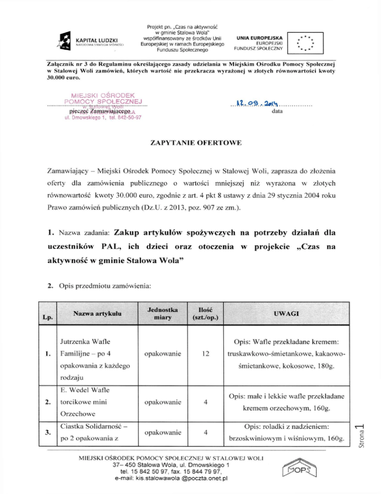 s P r o j e k t p n . „Czas n a aktywność w gminie Stalowa Wola" współfinansowany z e środków U n i i Europejskiej w ramach Europejskiego F u n d u s z u Społecznego KAPITAŁ L U D Z K I NARODOWA STRATEGIA SPÓINOSCI UNIA EUROPEJSKA EUROPEJSKI FUNDUSZ SPOŁECZNY Załącznik nr 3 do Regulaminu określającego zasady udzielania w Miejskim Ośrodku Pomocy Społecznej w Stalowej Woli zamówień, których wartość nie przekracza wyrażonej w złotych równowartości kwoty 30.000 euro. MIEJSKI OŚRODEK POMOCY SPOŁECZNEJ ft p<b , Qsi\ t pieczęć Zamawiającego ul. D m o w s k i e g o 1 , t e l . 8 4 2 - 5 0 - 9 7 data ZAPYTANIE OFERTOWE Zamawiający - M i e j s k i Ośrodek P o m o c y Społecznej w S t a l o w e j W o l i . z a p r a s z a d o złożenia oferty d l a zamówienia publicznego o wartości mniejszej niż wyrażona w złotych równowartość k w o t y 3 0 . 0 0 0 e u r o . z g o d n i e z a r t . 4 p k t 8 u s t a w y z d n i a 2 9 s t y c z n i a 2 0 0 4 r o k u P r a w o zamówień p u b l i c z n y c h ( D z . U . z 2 0 1 3 , p o z . 9 0 7 z e z m . ) . 1. N a z w a z a d a n i a : Zakup artykułów spożywczych na potrzeby działań dla uczestników P A L , ich dzieci oraz otoczenia w projekcie „Czas na aktywność w gminie Stalowa Wola" 2. Lp. O p i s p r z e d m i o t u zamówienia: Nazwa artykułu Jednostka miary Ilość (szt./op.) Jutrzenka W a f l e 1. Familijne - po 4 UWAGI O p i s : W a f l e przekładane k r e m e m : opakowanie 12 o p a k o w a n i a z każdego truskawkowo-śmietankowe. k a k a o w o śmietankowe. k o k o s o w e . 1 8 0 g . rodzaju E. Wedel W a l i e O p i s : małe i l e k k i e w a f l e przekładane 2. torcikowe mini opakowanie 4 k r e m e m o r z e c h o w y m . 160g. Orzechowe C i a s t k a Solidarność 3. Opis: roladki z nadzieniem: opakowanie po 2 opakowania z 4 b r z o s k w i n i o w y m i wiśniowym. 1 6 0 g . M I E J S K I OŚRODEK P O M O C Y SPOŁECZNEJ W S T A L O W E J W O L I 3 7 - 4 5 0 Stalowa Wola, ul.D m o w s k i e g o 1 tel. 1 5 8 4 2 5 0 97, fax. 1 5 8 4 4 7 9 9 7 , e-mail: kis.stalowawola @poczta.onet.pl KAPITAŁ L U D Z K I NARODOWA STRATEGIA SPÓINOSC P r o j e k t p n . „Czas n a aktywność w gminie Stalowa Wola" współfinansowany z e środków U n i i Europejskiej w ramach Europejskiego F u n d u s z u Społecznego UNIA EUROPEJSKA EUROPEJSKI FUNDUSZ SPOŁECZNY każdego r o d z a j u . K o k o s o w e ciastka 4. O p i s : c i a s t k a k o k o s o w e z nutką opakowanie 2 Solidarność pomarańczy, 1 6 0 g . S a n Złotokłose O p i s : c i a s t k a z płatkami o w s i a n y m i i 5. Wiatraczki Owsiane opakowanie 4 cynamonem, 171g. Korzenne Bahlesen Markizy H i t z O p i s : k r u c h e h e r b a t n i k i przekładane 6. nadzieniem opakowanie 2 czekoladowym kremem, 250g. czekoladowym Opis: kruche ciastka przykryte Ciastka Krakuski 7. opakowanie 2 śmietankową pierzynką. posypaną Śmietankowe płatkami c z e k o l a d o w y m i . 2 0 0 g . Opis: d w a czekoladowe herbatniki 8. Ciastka O R E O opakowanie 8 przedzielone delikatnym k r e m e m w a n i l i o w y m , 176g. Grześki W a f e l D z i e l 9. Opis: w a f e l e k bez czekolady sztuka 30 z nadzieniem kakaowym, 26g. na 6 Lubella Paluszki 10. opakowanie 10 Opis: paluszki z sezamem. 70g. opakowanie 10 O p i s : p a l u s z k i z solą. 8 0 g . Opakowanie 10 Opis: paluszki serowo cebulowe, 60g. opakowanie 2 opakowanie 2 Lubelskie z sezamem Lubella Paluszki 11. Lubelskie solone A k s a m Paluszki 12. Beskidzkie serowo cebulowe Lajkonik Krakowskie 13. O p i s : k r u c h e i chrupiące t a l a r k i o s m a k u cebulki. 150g. Talarki O p i s : k r u c h e i chrupiące słone p r e c e l k i . 14. Lajkonik Precelki 130g. O p i s : Słodkie j a j k o z niespodziankąFerrero Kinder jajko 15. zabawką, p o k r y t e czekoladą mleczną, sztuka niespodzianka 50 z a p a k o w a n e w kolorową folię aluminiową, 2 0 g . M I E J S K I OŚRODEK P O M O C Y SPOŁECZNEJ W S T A L O W E J W O L I 3 7 - 4 5 0 S t a l o w a W o l a , ul. D m o w s k i e g o 1 tel. 1 5 8 4 2 5 0 97, fax. 1 5 8 4 4 7 9 9 7 , e-mail: kis.stalowawola @poczta.onet.pl OPS KAPITAŁ L U D Z K I NAROOOWA STRATEGIA SPÓINOSO P r o j e k t p n . „Czas n a aktywność w gminie Stalowa Wola" współfinansowany z e środków U n i i Europejskiej w ramach Europejskiego F u n d u s z u Społecznego UNIA EUROPEJSKA EUROPEJSKI FUNDUSZ SPOŁECZNY Opis: Ciastko biszkoptowe z nadzieniem, L U Petitki Lubisie - p o 16. 6 s z t u k z każdego z 30g. Ciastka w 5 wariantach smakowych: sztuka 30 mleczny, czekoladowy, z musem jabłkowym, z m u s e m t r u s k a w k o w y m , z wariantów s m a k o w y c h . m u s e m z owoców leśnych. O p i s : l i z a k i okrągłe, każdy z a p a k o w a n y 17. Lizaki Chupa Chups sztuka 50 o s o b n o . M i x smaków. O p i s : l i z a k i okrągłe, 1 l g . Każdy 18. Lizaki Mieszko Zozole sztuka 50 z a p a k o w a n y o s o b n o . M i x smaków. O p i s : m i e s z a n k a cukierków z musującym 19. Cukierki Mieszko Zozole kilo 5 n a d z i e n i e m w różnych s m a k a c h , każdy pakowany osobno. O p i s : R o z p u s z c z a l n a g u m a d o żucia w o w o c o w y c h s m a k a c h . J e s t ciągnąca i 20. Guma Mamba opakowanie 10 intensywnie owocowa. Pakowana po4 k o s t k i w p a s e k , a każda k o s t k a t o 6 g u m rozpuszczalnych. Opis: 1 0 0 % soki bez dodatku c u k r u w w y g o d n y c h małych k a r t o n i k a c h z rurką. 21. Hortex soczek Soki w 5 wariantach smakowych: sztuka 200 pomarańczowy, jabłkowy, w i e l o o w o c o w y , brzoskwiniowo-jabłkowy o r a z m u l t i w i t a m i n a . Pojemność 2 0 0 m l . Opis: nektar z czarnych porzeczek, bez Hortex nektar Czarna 22. sztuka Porzeczka 5 karton 2-litrowy. O p i s : 1 0 0 % s o k pomarańczowy, b e z Hortex Sok 23. Pomarańczowy konserwantów a n i s z t u c z n y c h barwników, sztuka 5 konserwantów a n i s z t u c z n y c h barwników, karton 2-litrowy. O p i s : 1 0 0 % s o k ja