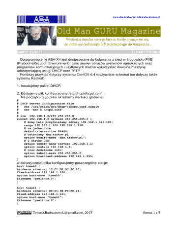 www.aba.krakow.pl, [email protected] Numer 35/2013 15 kwiecień 2013 Oprogramowanie ABA-X4 jest dostosowane do ładowania z sieci w środowisku PXE (Preboot eXecution Environment). Jako serwer obrazów systemów operacyjnych oraz programów komunikacyjnych i użytkowych można wykorzystać dowolną maszynę udostępniającą usługi DHCP oraz TFTP. Poniższy przykład dotyczy systemu CentOS 6.4 (oczywiście schemat ten dotyczy także systemu RedHat): 1. Instalujemy pakiet DHCP, 2. Edytujemy plik konfiguracyjny /etc/dhcp/dhcpd.conf : Na początku tego pliku określamy wartości globalne: # # DHCP Server Configuration file. # see /usr/share/doc/dhcp*/dhcpd.conf.sample # see 'man 5 dhcpd.conf' # # sie 192.168.1.0/255.255.255.0 subnet 192.168.1.0 netmask 255.255.255.0 { # domy lnie przydzielamy adresy 192.168.1.120-150: range 192.168.1.100 192.168.1.150; # na jeden dzie default-lease-time 86400; # ustawiamy aba.krakow.pl option domain-name "aba.krakow.pl"; # i serwer DNS: option domain-name-servers 192.168.1.1; option routers 192.168.1.1; # oraz dodatkowe info: option subnet-mask 255.255.255.0; option broadcast-address 192.168.1.255; } w dalszej części pliku konfigurujemy poszczególne stacje: host tomek0 { hardware ethernet 1C:C1:DE:9C:3C:10; fixed-address 192.168.1.120; option host-name "tomek0"; filename "pxelinux.0"; } host tomek1 { hardware ethernet 00:21:9B:F4:FC:24; fixed-address 192.168.1.121; option host-name "tomek1"; filename "pxelinux.0"; } [email protected], 2013 Strona 1 z 5 www.aba.krakow.pl, [email protected] Plik pxelinux.0 jest częścią systemu ładującego (syslinux) i powinien być dostępny w katalogu głównym system TFTP. W przypadku systemu CentOS (RedHat) domyślnie jest to katalog /var/lib/tftpboot . Powinny się w nim znajdować następujące pliki: pxelinux.0 – program startowy PXE, vmlinuz – j dro systemu Linux, core.gz – obraz g ównego systemu plików, linux.c32 – program a duj cy oraz katalog pxelinux.cfg z plikiem konfiguracyjnym default : label linux menu label ^Mini core menu default kernel vmlinuz append initrd=core.gz quiet vga=785 norestore Parametry w linii „append” należy potraktować jako przykładowe. Oprogramowanie ABA-X4 opracowano w taki sposób, abu tworzyło ono spójną rodzinę. Pliki vmlinuz (jądro systemu) oraz core.gz mogą identyczne zarówno dla wersji NetBOOT, jak i SelfBOOT. W powyższym rozwiązanie wszystkie właściwości uruchamianego zdalnie terminala są określone w pliku core.gz, który po rozpakowaniu do pamięci RAM staje się głównym systemem plikowym root ( / ) terminala lub stacji roboczej ABA-X4. Każdorazowa zmiana tego systemu wymaga przygotowania nowego obrazu systemu plikowego root oraz zapisania go w pliku core.gz. Jest to dość kłopotliwe, lepiej więc przygotować inne rozwiązanie: W wersji ABA-X4 przeznaczonej do instalacji na pamięci FLASH dostępne są trzy dodatkowe katalogi: • • • /tce – zawierający programy użytkowe (rozszerzenia), /opt – który jest przeznaczony do przechowywania globalnych danych konfiguracyjnych, /home – katalog „użytkownika”, w którym przechowywane są (w razie takiej potrzeby) takie pliki jak np. ustawienia i historia przeglądarki. Oprogramowanie ABA-X4 może pracować w trybie stacji roboczej możliwe jest więc definiowanie kilku użytkowników, którzy będą mogli w takim przypadku korzystać ze swych własnych podkatalogów. Powyższe katalogi możemy udostępnić terminalom lub bezdyskowym stacjom roboczym za pomocą usługi NFS. W tym celu należy przygotować odpowiedni katalog na serwerze, którego zawartość będziemy udostępniać stacjom bezdyskowym. Następnie należy uruchomić serwer NFS i sprawdzić poprawność jego działania. [email protected], 2013 Strona 2 z 5 www.aba.krakow.pl, [email protected] Konieczne jest również zmodyfikowanie pliku: /var/lib/tftpboot/pxelinux.cfg/default – np. poprzez dodanie: menu label ^Core + NFS kernel vmlinuz append initrd=core.gz nfsmount=192.168.1.235:/var/lib/tftpboot/nfs Zapewni to udostępnienie katalogu zdalnego stacji roboczej już w procesie startu oprogramowania. Dzięki temu rozszerzenia i programy użytkowe (np. przeglądarka) będą dostępne bez zwłoki po uruchomieniu stacji. Możliwe będzie również automatyczne uruchamianie wcześniej skonfigurowanych funkcji stacji bezdyskowej. Katalog tce Jak już napisałem, katalog ten zawiera tak zwane „extensions” (rozszerzenia). Zazwyczaj są one jednakowe dla wszystkich stacji roboczych. W katalogu tce znajdziemy: Plik onboot.lst zawierające oprogramowanie ładowane podczas startu – np. elementy wykorzystywane do budowy środowiska graficznego: … Xorg-7.4.tcz, Xlibs.tcz, flwm_topside.tcz, wbar.tcz itp. ... oraz podkatalogi optional oraz ondemand zawierające listę dostępnych rozszerzeń programowych. Katalog opt Katalog ten jest przeznaczony do przechowywania ustawień (konfiguracji) stacji, skryptów startowych oraz wszelkich innych plików, które powinny być zachowane po wyłączeniu stacji. W przypadku ABA-X4 są to takie pliki, jak bootlocal.sh (skrypt wykonywany automatycznie jako ostatni podczas startu terminala), ustawienia środowiska X Window (np. xorg.conf, mapy klawiatur itp.), parametry połączeń RDP, NX, SSH itd. Katalog home/tc Większość obiektów w tym katalogu to pliki i katalogi ukryte (np. .mozilla). Standardowo definiowany jest jeden użytkownik – tc. W wersjach z oprogramowaniem NoMachine konieczny jest specjalny użytkownik nx, możliwe jest również tworzenie dodatkowych użytkowników. Katalog ten może być organizowany także w pamięci RAM – wówczas nie będą zapamiętywane np. ustawienia i historia przeglądarki. Jeśli jednak zależy nam na zachowywaniu tych informacji możemy użyć do tego celu przestrzeni dyskowej serwera oraz NFS. [email protected], 2013 Strona 3 z 5 www.aba.krakow.pl, [email protected] Najprostszym sposobem przygotowania oprogramowania ABA-X4 do ładowania 