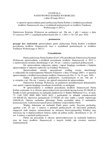 UCHWAŁA PAŃSTWOWEJ KOMISJI WYBORCZEJ z dnia 20 maja 2013 r. w sprawie sprawozdania partii politycznej Partia Kobiet o źródłach pozyskania środków finansowych oraz o wydatkach poniesionych ze środków Funduszu Wyborczego w 2012 r. Państwowa Komisja Wyborcza na podstawie art. 38a ust. 1 pkt 1 ustawy z dnia 27 czerwca 1997 r. o partiach politycznych (Dz. U. z 2011 r. Nr 155, poz. 924) postanawia przyjąć bez zastrzeżeń sprawozdanie partii politycznej Partia Kobiet o źródłach pozyskania środków finansowych oraz o wydatkach poniesionych ze środków Funduszu Wyborczego w 2012 r. Uzasadnienie Partia polityczna Partia Kobiet (EwP 259) przedłożyła Państwowej Komisji Wyborczej sprawozdanie o źródłach pozyskania środków finansowych w 2012 r. z zachowaniem terminu określonego w art. 38 ust. 1 ustawy o partiach politycznych. Do sprawozdania załączono opinię i raport biegłego rewidenta z badania sprawozdania w zakresie wpływów na Fundusz Wyborczy. Sprawozdanie zostało sporządzone według wzoru określonego w załączniku do rozporządzenia Ministra Finansów z dnia 18 lutego 2003 r. w sprawie sprawozdania o źródłach pozyskania środków finansowych (Dz. U. Nr 33, poz. 269). Żaden z uprawnionych podmiotów, wymienionych w art. 34a ust. 5 w związku z art. 38a ust. 1 ustawy, nie zgłosił zastrzeżeń do sprawozdania. Państwowa Komisja Wyborcza, na podstawie przedłożonych dokumentów oraz opinii i raportu biegłego rewidenta stwierdziła, co następuje. W sprawozdaniu o źródłach pozyskania środków finansowych Partia Kobiet wykazała, iż w okresie sprawozdawczym pozyskała łączną kwotę 20 240,00 zł. Środki te były gromadzone na rachunku bankowym w Banku Millenium S.A., nr rach. 73 1160 2202 0000 0001 8450 8622 i pochodziły ze składek członkowskich (14 460,00 zł), darowizn pieniężnych (5 520,00 zł) oraz wpłat z tytułu wpisowego (260,00 zł). Oprócz rachunku głównego Partia posiadała także 8 rachunków pomocniczych, wykorzystywanych przez struktury wojewódzkie Partii. Wpłaty dokonane na rachunki Partii przez osoby fizyczne pochodzą, zgodnie z art. 25 ust. 1 ustawy o partiach politycznych od obywateli polskich, mających stałe miejsce zamieszkania na obszarze Rzeczypospolitej Polskiej oraz mieszczą się w dopuszczalnym limicie wpłat od jednej osoby, określonym w art. 25 ust. 4 ustawy o partiach politycznych. Partia nie pozyskała w okresie sprawozdawczym na rachunek bankowy oraz do kasy środków finansowych z innych źródeł, jak również wartości niepieniężnych. —2— W okresie sprawozdawczym Partia posiadała Fundusz Wyborczy, którego środki były gromadzone na rachunku w Banku Millenium S.A., nr rach. 80 1166 2202 0000 0002 0407 7567. Stan środków finansowych Funduszu Wyborczego w dniu 1 stycznia 2012 r. wyniósł 5 400,94 zł. W okresie sprawozdawczym, jak wynika z załączonych do sprawozdania dokumentów oraz opinii i raportu biegłego rewidenta badającego sprawozdanie, nie były dokonywane żadne wpłaty na Fundusz Wyborczy. Wydatki Funduszu Wyborczego wyniosły 187,50 zł i były związane z ponoszeniem opłat bankowych za prowadzenie rachunku Funduszu Wyborczego. W dniu 31 grudnia 2012 r. na rachunku Funduszu Wyborczego pozostawała kwota 5 213,44 zł. Państwowa Komisja Wyborcza, po ustaleniu powyższego na podstawie sprawozdania finansowego Partii, dokumentów do niego załączonych oraz opinii i raportu biegłego rewidenta, postanowiła jak w sentencji. Od niniejszego postanowienia nie przysługuje środek prawny. Przewodniczący Państwowej Komisji Wyborczej: Stefan J. Jaworski Zastępcy Przewodniczącego Państwowej Komisji Wyborczej: Andrzej Kisielewicz, Stanisław Kosmal Członkowie Państwowej Komisji Wyborczej: Bogusław Dauter, Maria Grzelka, Andrzej Mączyński, Janusz Niemcewicz, Włodzimierz Ryms, Stanisław Zabłocki