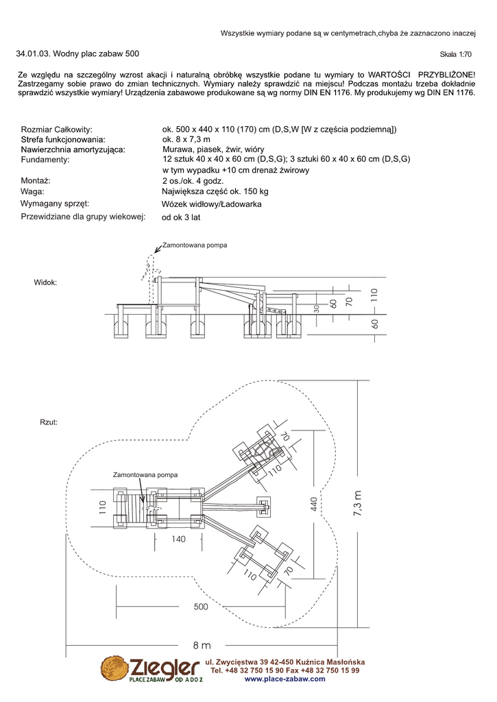 34.01.03. Wodny plac zabaw 500 Skala 1:70 ok. 500 x 440 x 110 (170) cm (D,S,W [W z częścia podziemną]) ok. 8 x 7,3 m Murawa, piasek, żwir, wióry 12 sztuk 40 x 40 x 60 cm (D,S,G); 3 sztuki 60 x 40 x 60 cm (D,S,G) w tym wypadku +10 cm drenaż żwirowy 2 os./ok. 4 godz. Największa część ok. 150 kg Wózek widłowy/Ładowarka Przewidziane dla grupy wiekowej: od ok 3 lat 110 60 70 60 30 Zamontowana pompa 70 0 440 110 11 0 500 8m 70 140 7,3 m 11 Zamontowana pompa