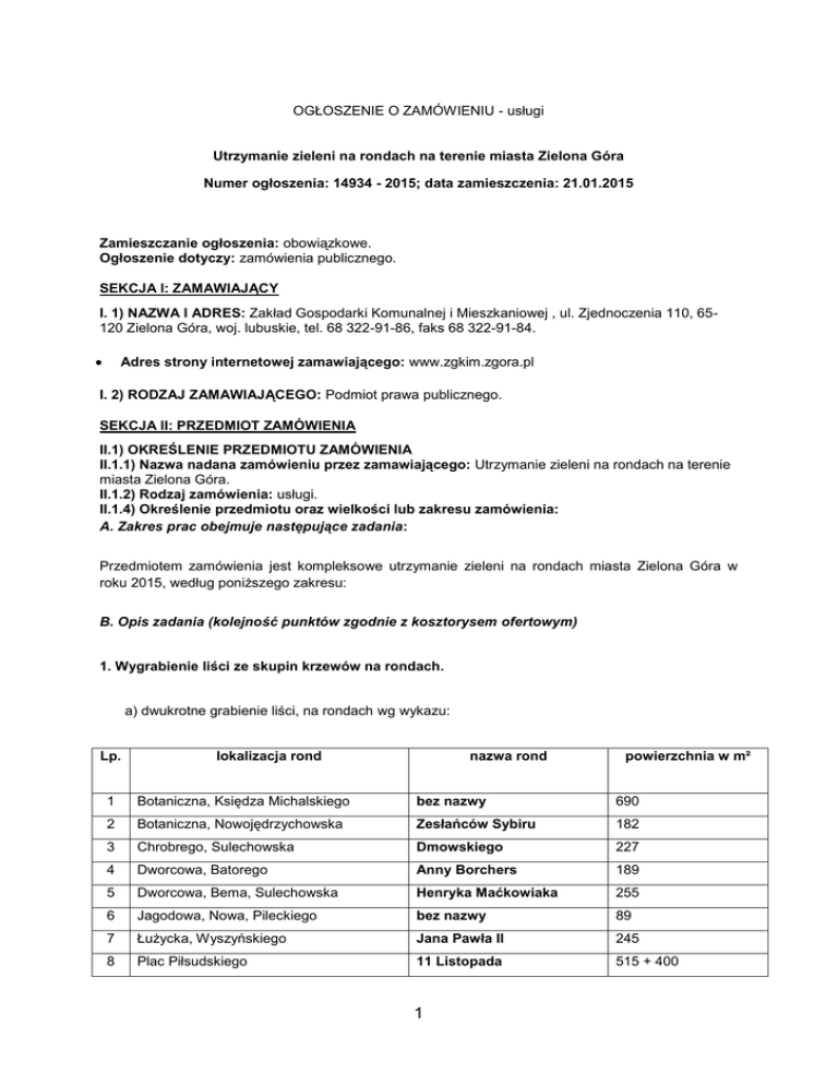 OGŁOSZENIE O ZAMÓWIENIU - usługi Utrzymanie zieleni na rondach na terenie miasta Zielona Góra Numer ogłoszenia: 14934 - 2015; data zamieszczenia: 21.01.2015 Zamieszczanie ogłoszenia: obowiązkowe. Ogłoszenie dotyczy: zamówienia publicznego. SEKCJA I: ZAMAWIAJĄCY I. 1) NAZWA I ADRES: Zakład Gospodarki Komunalnej i Mieszkaniowej , ul. Zjednoczenia 110, 65120 Zielona Góra, woj. lubuskie, tel. 68 322-91-86, faks 68 322-91-84. Adres strony internetowej zamawiającego: www.zgkim.zgora.pl I. 2) RODZAJ ZAMAWIAJĄCEGO: Podmiot prawa publicznego. SEKCJA II: PRZEDMIOT ZAMÓWIENIA II.1) OKREŚLENIE PRZEDMIOTU ZAMÓWIENIA II.1.1) Nazwa nadana zamówieniu przez zamawiającego: Utrzymanie zieleni na rondach na terenie miasta Zielona Góra. II.1.2) Rodzaj zamówienia: usługi. II.1.4) Określenie przedmiotu oraz wielkości lub zakresu zamówienia: A. Zakres prac obejmuje następujące zadania: Przedmiotem zamówienia jest kompleksowe utrzymanie zieleni na rondach miasta Zielona Góra w roku 2015, według poniższego zakresu: B. Opis zadania (kolejność punktów zgodnie z kosztorysem ofertowym) 1. Wygrabienie liści ze skupin krzewów na rondach. a) dwukrotne grabienie liści, na rondach wg wykazu: Lp. lokalizacja rond nazwa rond powierzchnia w m² 1 Botaniczna, Księdza Michalskiego bez nazwy 690 2 Botaniczna, Nowojędrzychowska Zesłańców Sybiru 182 3 Chrobrego, Sulechowska Dmowskiego 227 4 Dworcowa, Batorego Anny Borchers 189 5 Dworcowa, Bema, Sulechowska Henryka Maćkowiaka 255 6 Jagodowa, Nowa, Pileckiego bez nazwy 89 7 Łużycka, Wyszyńskiego Jana Pawła II 245 8 Plac Piłsudskiego 11 Listopada 515 + 400 1 9 Prosta, Działkowa, Zacisze Haliny Lubicz 177 10 Ptasia, Wyszyńskiego Anny German 270 11 Strefa Aktywności Gospodarczej bez nazwy 415 12 Szosa Kisielińska bez nazwy 265 13 Westerplatte, Chrobrego Michała Kaziowa 177 14 Woj. Polskiego, Prosta, Wyczółkowskiego Władysława Korcza 89 15 Wyspiańskiego, Sulechowska Albina Bandurskiego 200 + 30 RAZEM: 4 415 m ² - zgrabienie liści w pryzmy, załadunek i transport, - nie dopuszcza się pozostawienia zgrabionych liści na rondach b) termin prac - wiosenne grabienie rond należy wykonać do 15 kwietnia, - jesienne grabienie rond do 31 października, - Zamawiający zastrzega zmianę terminu prac, 2. Grabienie trawników na rondach. a) grabienie trawników na rondach wg wykazu: Lp. lokalizacja rond nazwa rond powierzchnia w m² 1 Dworcowa, Ułańska Klema Felhnerowskiego 59 2 Energetyków, Batorego Edwarda Jaworskiego 401 3 Fabryczna, Ogrodowa Romana Mazurkiewicza 32 4 Jagodowa, Nowa, Pileckiego bez nazwy 89 5 Plac Piłsudskiego (pas rozdziału) 400 6 Sienkiewicza (przy Wydz. Komunikacji) bez nazwy 160 7 Wiśniowa, Moniuszki, Nauczycieli Tajnego Nauczania 88 8 Woj. Polskiego, Prosta, Wyczółkowskiego Władysława Korcza 89 9 Woj. Polskiego, Zjednoczenia PCK 837 RAZEM: 2 155 m ² - zgrabienie liści w pryzmy, załadunek i transport, - nie dopuszcza się pozostawienia spryzmowanych liści i worków z liśćmi na rondach, b) termin prac należy wykonać do 15 kwietnia - Zamawiający zastrzega zmianę terminu prac, 3. Obsadzenie rond kwiatami wiosennymi 25 szt./m ² z pielęgnacją. a) przygotowanie terenu pod nasadzenie kwiatów, - lekkie przekopanie wyznaczonego terenu, b) zakup, transport i posadzenie 1 650 szt. kwiatów - bratków, - przewidywana powierzchnia do obsadzenia 66 m ² 2 c) termin prac - sadzenie, należy wykonać do 15 kwietnia, d) wykaz rond objętych nasadzeniami: Lp. lokalizacja rond nazwa rond szt. 1 Dworcowa, Ułańska Klema Felhnerowskiego (z koszem) 80 2 Fabryczna, Ogrodowa Romana Mazurkiewicza 20 3 Jagodowa, Nowa, Pileckiego bez nazwy 200 4 Plac Piłsudskiego 11 Listopada 450 5 Ptasia, Wyszyńskiego Anny German 200 6 Westerplatte, Chrobrego Michała Kaziowa 200 7 Wiśniowa, Moniuszki, Nauczycieli Tajnego Nauczania 20 8 Wiśniowa, Ogrodowa Tomasza Florkowskiego 30 9 Łużycka, Wyszyńskiego Jana Pawła II 450 RAZEM 1 650 szt. e) bieżąca pielęgnacja bratków - podlewanie, odchwaszczanie, uszczykiwanie przekwitłych kwiatostanów, uzupełnianie skradzionych kwiatów, oraz likwidacja kwiatów po przekwitnięciu, 4. Obsadzenie rond kwiatami letnimi 20 szt./m ², z pielęgnacją. a) przygotowanie terenu pod nasadzenie kwiatów letnich, - odchwaszczenie i lekkie przekopanie terenu wyznaczonego pod obsadzenie kwiatów, b) zakup, transport i posadzenie 1 120 szt., kwiatów, - kwiaty letnie tj.: begonia big, begonia bulwiasta, aksamitka, - Zamawiający zastrzega wybór odmian i kolor kwiatów, - kwiaty należy sadzić w równych odległościach, - Wykonawca wykona wzory nasadzeń kwiatowych, według podanej koncepcji przez Zamawiającego, - przewidywana powierzchnia do obsadzenia 56 m² - miejsce nasadzeń każdorazowo wskaże Zamawiający, c) wykaz rond objętych nasadzeniami, Lp. lokalizacja rond nazwa rond szt. 1 Batorego, Energetyków Edwarda Jaworskiego 100 2 Dworcowa, Ułańska Klema Felhnerowskiego (z koszem) 100 3 Fabryczna, Ogrodowa Romana Mazurkiewicza 20 4 Jagodowa, Nowa, Pileckiego bez nazwy 100 5 Łużycka, Wyszyńskiego Jana Pawła II 200 3 6 Plac Piłsudskiego 11 Listopada 300 7 Ptasia, Wyszyńskiego Anny German 150 8 Westerplatte, Chrobrego Michała Kaziowa 100 9 Wiśniowa, Moniuszki, Nauczycieli Tajnego Nauczania 20 10 Wiśniowa, Ogrodowa Tomasza Florkowskiego 30 RAZEM 1 120 szt. d) termin prac - kwiaty letnie należy posadzić do 15 maja - Zamawiający zastrzega zmianę terminów nasadzeń, e) bieżąca pielęgnacja kwiatów - podlewanie, odchwaszczanie, uszczykiwanie przekwitłych kwiatostanów, uzupełnianie skradzionych kwiatów, oraz likwidacja kwiatów po przekwitnięciu ze zgrabieniem terenu 5. Obsadzenie rond kwiatami jesiennymi 9 szt./m ², z pielęgnacją. a) przygotowanie terenu pod nasadzenie kwiatów jesiennych, - odchwaszczenie i lekkie przekopanie terenu wyznaczonego do obsadzenie kwiatami, b) zakup, transport i posadzenie kwiatów, chryzantemy 1 965 szt., - Zamawiający zastrzega wybó