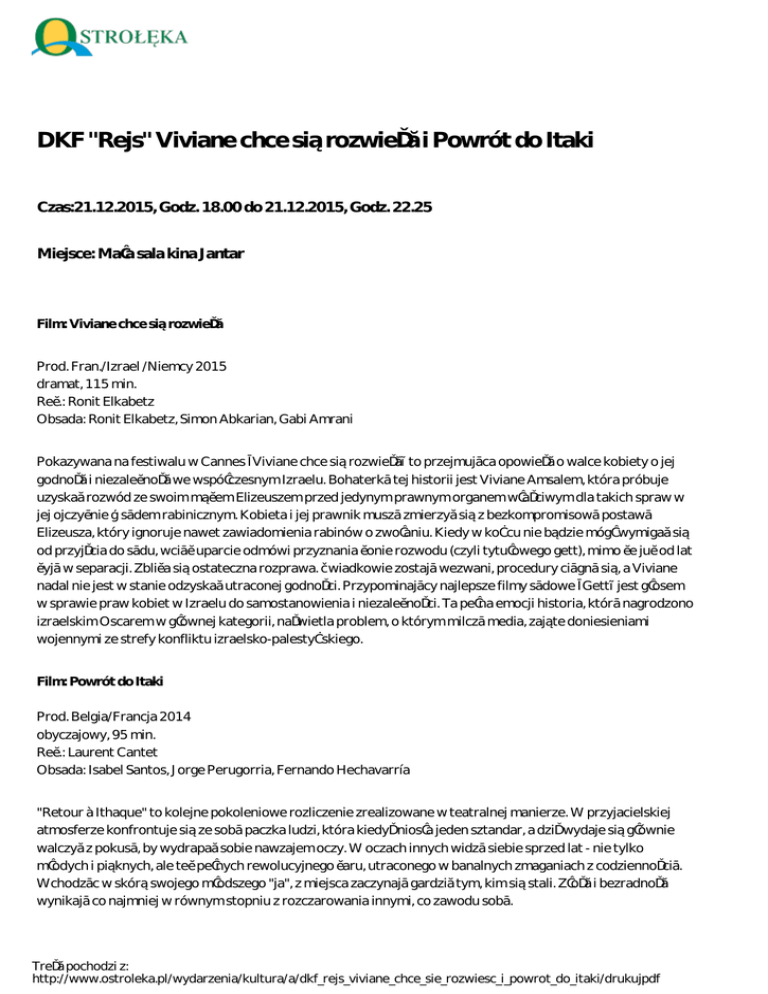 DKF "Rejs" Viviane chce się rozwieść i Powrót do Itaki Czas:21.12.2015, Godz. 18.00 do 21.12.2015, Godz. 22.25 Miejsce: Mała sala kina Jantar Film: Viviane chce się rozwieść Prod. Fran./Izrael /Niemcy 2015 dramat, 115 min. Reż.: Ronit Elkabetz Obsada: Ronit Elkabetz, Simon Abkarian, Gabi Amrani Pokazywana na festiwalu w Cannes „Viviane chce się rozwieść” to przejmująca opowieść o walce kobiety o jej godność i niezależność we współczesnym Izraelu. Bohaterką tej historii jest Viviane Amsalem, która próbuje uzyskać rozwód ze swoim mężem Elizeuszem przed jedynym prawnym organem właściwym dla takich spraw w jej ojczyźnie – sądem rabinicznym. Kobieta i jej prawnik muszą zmierzyć się z bezkompromisową postawą Elizeusza, który ignoruje nawet zawiadomienia rabinów o zwołaniu. Kiedy w końcu nie będzie mógł wymigać się od przyjścia do sądu, wciąż uparcie odmówi przyznania żonie rozwodu (czyli tytułowego gett), mimo że już od lat żyją w separacji. Zbliża się ostateczna rozprawa. Świadkowie zostają wezwani, procedury ciągną się, a Viviane nadal nie jest w stanie odzyskać utraconej godności. Przypominający najlepsze filmy sądowe „Gett” jest głosem w sprawie praw kobiet w Izraelu do samostanowienia i niezależności. Ta pełna emocji historia, którą nagrodzono izraelskim Oscarem w głównej kategorii, naświetla problem, o którym milczą media, zajęte doniesieniami wojennymi ze strefy konfliktu izraelsko-palestyńskiego. Film: Powrót do Itaki Prod. Belgia/Francja 2014 obyczajowy, 95 min. Reż.: Laurent Cantet Obsada: Isabel Santos, Jorge Perugorria, Fernando Hechavarría "Retour à Ithaque" to kolejne pokoleniowe rozliczenie zrealizowane w teatralnej manierze. W przyjacielskiej atmosferze konfrontuje się ze sobą paczka ludzi, która kiedyś niosła jeden sztandar, a dziś wydaje się głównie walczyć z pokusą, by wydrapać sobie nawzajem oczy. W oczach innych widzą siebie sprzed lat - nie tylko młodych i pięknych, ale też pełnych rewolucyjnego żaru, utraconego w banalnych zmaganiach z codziennością. Wchodząc w skórę swojego młodszego "ja", z miejsca zaczynają gardzić tym, kim się stali. Złość i bezradność wynikają co najmniej w równym stopniu z rozczarowania innymi, co zawodu sobą. Treść pochodzi z: http://www.ostroleka.pl/wydarzenia/kultura/a/dkf_rejs_viviane_chce_sie_rozwiesc_i_powrot_do_itaki/drukujpdf Filmy: Viviane chce się rozwieść : http://www.youtube.com/embed/5GbSl71to7UPowrót do Itaki: http://www.youtube.com/embed/SUgLWUmHmI8 Treść pochodzi z: http://www.ostroleka.pl/wydarzenia/kultura/a/dkf_rejs_viviane_chce_sie_rozwiesc_i_powrot_do_itaki/drukujpdf Treść pochodzi z: http://www.ostroleka.pl/wydarzenia/kultura/a/dkf_rejs_viviane_chce_sie_rozwiesc_i_powrot_do_itaki/drukujpdf