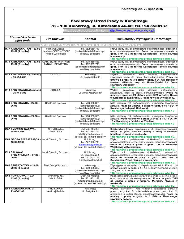 Kołobrzeg, dn. 22 lipca 2016 Powiatowy Urząd Pracy w Kołobrzegu 78 – 100 Kołobrzeg, ul. Katedralna 46-48; tel.: 94 3524133 http://pupkolobrzeg.finn.pl ; http://www.psz.praca.gov.pl/ Stanowisko i data zgłoszenia Pracodawca Kontakt Dokumenty / Wymagania / Informacje OFERTY PRACY DLA OSÓB NIEPEŁNOSPRAWNYCH 1477 KIEROWCA TAXI – 29.06Firma Usługowo29-07 (4 osoby) Handlowa "OZON-TECH" Robert Lubieniecki Tel. 662 059 713 (po kontakcie telefonicznym możliwy osobisty) 1518 SPRZEDAWCA (3/4 etatu) – 05.07-05.08 CCC S.A. Kołobrzeg Ul. Koszalińska 36 1518 SPRZEDAWCA (3/4 etatu) – 05.07-05.08 CCC S.A. Kołobrzeg Ul. Armii Krajowej 10 1434 SPRZEDAWCA – 22.06 – 26.08 Gzella net Sp.z o.o. Tel. 506 185 335 [email protected] (po kontakcie telefonicznym możliwy osobisty) Prawo jazdy kat. B, świadectwo o niekaralności, orzeczenie o st. niepełnosprawności. Praca na umowę zlecenie w godz. 7-19, 19-7 na terenie Kołobrzegu i okolic, również w weekendy. * Na rozmowę z pracodawcą proszę zabrać ze sobą CV. Prawo jazdy kat. B, świadectwo o niekaralności, orzeczenie o st. niepełnosprawności. Praca na umowę zlecenie w godz. 7-19, 19-7 na terenie Kołobrzegu i okolic, również w weekendy. * Na rozmowę z pracodawcą proszę zabrać ze sobą CV. Wykszt. zawodowe, mile widziane doświadczenie zawodowe, chęć do pracy, komunikatywność. Praca na umowę o pracę na 3/4 etatu w godz. 9-21 (wg grafiku) w centrum Albatros przy ul. Koszalińskiej 36. Praca również w weekendy. * Na rozmowę z pracodawcą proszę zabrać ze sobą CV Wykszt. zawodowe, mile widziane doświadczenie zawodowe, chęć do pracy, komunikatywność. Praca na umowę o pracę na 3/4 etatu w godz. 9-21 w Galerii Hosso w Kołobrzegu (wg grafiku). Praca również w weekendy. * Na rozmowę z pracodawcą proszę zabrać ze sobą CV Mile widziany rok doświadczenia, wymagana książeczka zdrowia. Praca na umowę o pracę w godz. 9-15, 15-21 w Kołobrzegu (sklep ul. Giełdowa). * Na rozmowę z pracodawcą proszę zabrać ze sobą CV 1475 KIEROWCA TAXI – 29.06- F.U.H. SIGMA PARTNER 29-07 (2 osoby) ANNA LUBIENIECKA Tel. 608 860 433 Tel. 662 059 713 (po kontakcie telefonicznym możliwy osobisty) 1433 SPRZEDAWCA – 22.06 – 26.08 Gzella net Sp.z o.o. Tel. 506 185 335 [email protected] (po kontakcie telefonicznym możliwy osobisty) Mile widziany rok doświadczenia, wymagana książeczka zdrowia. Praca na umowę o pracę w godz. 6-13, 13-20, 1018 w Kołobrzegu (stoisko w E’leclerc). * Na rozmowę z pracodawcą proszę zabrać ze sobą CV Grand Kapitan Medi - SPA Ustronie Morskie Tel. 501 451 192 [email protected] (po kont. tel. kontakt osobisty) Kołobrzeg, Tel. 727 003 748 [email protected] (po kont. tel. kontakt osobisty) Książeczka zdrowia, orzeczenie o st. niepełnosprawności. Praca w godz. 7-15 na umowę o pracę w Ustroniu Morskim, również w weekendy. * Na rozmowę z pracodawcą proszę zabrać ze sobą CV. Wykszt. min. podstawowe, dokładność, pracowitość, odpowiedzialność, orzeczenie o stopniu niepełnosprawności. Praca na umowę o pracę w godz. 7-15 w Jednostce Wojskowej w Kołobrzegu. * Na rozmowę z pracodawcą proszę zabrać ze sobą CV. Wykszt. min. podstawowe, dokładność, pracowitość, odpowiedzialność, orzeczenie o stopniu niepełnosprawności. Praca na umowę o pracę w godz. 7-19, 19-7 w Kołobrzegu. Praca również w weekendy. * Na rozmowę z pracodawcą proszę zabrać ze sobą CV. Wymagane orzeczenie o niepełnosprawności. Praca na umowę o pracę w godz. 6-14, 14-22 (poza sezonem w godz. 7-21) w C.H. E'Leclerc. * Na rozmowę z pracodawcą proszę zabrać ze sobą CV Książeczka zdrowia, podstawowa znajomość j. niemieckiego, orzeczenie o st. niepełnosprawności. Praca w godz. 7-15 na umowę o pracę w Ustroniu Morskim, również w weekendy. * Na rozmowę z pracodawcą proszę zabrać ze sobą CV. Wykszt. zawodowe, mile widziana książeczka zdrowia, prawo jazdy kat. B, mile widziane prawo jazdy kat. C, orzeczenie o lekkim stopniu niepełnosprawności. Praca na umowę o pracę w godz. 4-12, 6-14 w Kołobrzegu, również w soboty. * Na rozmowę z pracodawcą proszę zabrać ze sobą CV. 1367 ZMYWACZ NACZYŃ– 15.06-12.08 1569 OSOBA SPRZATAJĄCA – Impel Cleaning Sp. z o.o. 13.07-12.08 1529 SALOWA/ Impel Cleaning Sp. z o.o. SPRZĄTAJĄCA – 07.07 – 06.08 1466 SPRZĄTACZKA – 28.0629.07 (3 osoby) Piast Group Sp. z o.o. 1368 POKOJOWA – 15.0612.08 (2 osoby) Grand Kapitan Medi - SPA 0559 KIEROWCA KAT. B – 23.03-12.08 FHU LEMON Andrzej Rudnik Kołobrzeg, Ul. Łopuskiego 1 Tel. 727 003 748 [email protected] Kołobrzeg Tel. 660 088 392 (po kontakcie telefonicznym możliwy osobisty) Ustronie Morskie Tel. 501 451 192 [email protected] (po kont. tel. kontakt osobisty) Kołobrzeg Ul. Bałtycka 11 Oferty pracy z ogólnego pośrednictwa SPECJALIŚCI / PRACA BIUROWA 1610 PODINSPEKTOR DS. GOSPODARKI ODPADAMI W REFERACIE INŻYNIERII OCHRONY ŚRODOWISKA PRZY WYDZIALE KOMUNALNYM – 21.0701.08 1591 SPECJALISTA DS. KADR I PŁAC – 18.0726.08 Urząd Miasta Kołobrzeg Kołobrzeg ul. Ratuszowa 13 PUHP PILAWA Eugeniusz Pilawa Kołobrzeg Ul. Tęczowa 1 Tel. 94 35 178 42 [email protected] 1576 ZASTĘPCA Stowarzyszenie KIEROWNIKA Wspierania i Rozwoju SCHRONISKA DLA Schroniska dla Zwierząt w ZWIERZĄT – 15.07-16.08 Kołobrzegu REKS 1570 SEKRETARKA – 14.0712.08 (1/2 etatu) Przedszkole Miejskie nr 7 w Kołobrzegu 1581 MISTRZ DZIAŁU UTRZYMANIA RUCHU – 18.07-19.08 KORAL S.A. 1542 INSPEKTOR WETERYNARYJNY – 07.07-26.08 (2 osoby) 1467 PRACOWNIK DZIAŁU LOGISTYKI/SPEDYTOR – 29.06-29.07 1132 KOSZTORYSANT – 20.05-19.08 Inspekcja Weterynaryjna Powiatowy Inspektorat Weterynarii w Kołobrzegu MARLIN Anna i Piotr Topczewscy Sp. j. Kerd Sp. z o.o. 1538 SPECJALISTA DS. BG Production Sp. z oo. HACCP / IFS / BRC W BRANŻY PRZETWÓRSTWA RYBNEGO – 07.07-05.08 (2 osoby) 1227 SPECJALISTA DS. PPUH DEKOM MARKETINGU – 31.05- Sanatorium Uzdrowiskowe 12.08 Bałtyk 1051 SPECJALISTA DS. TECHNICZNYCH 