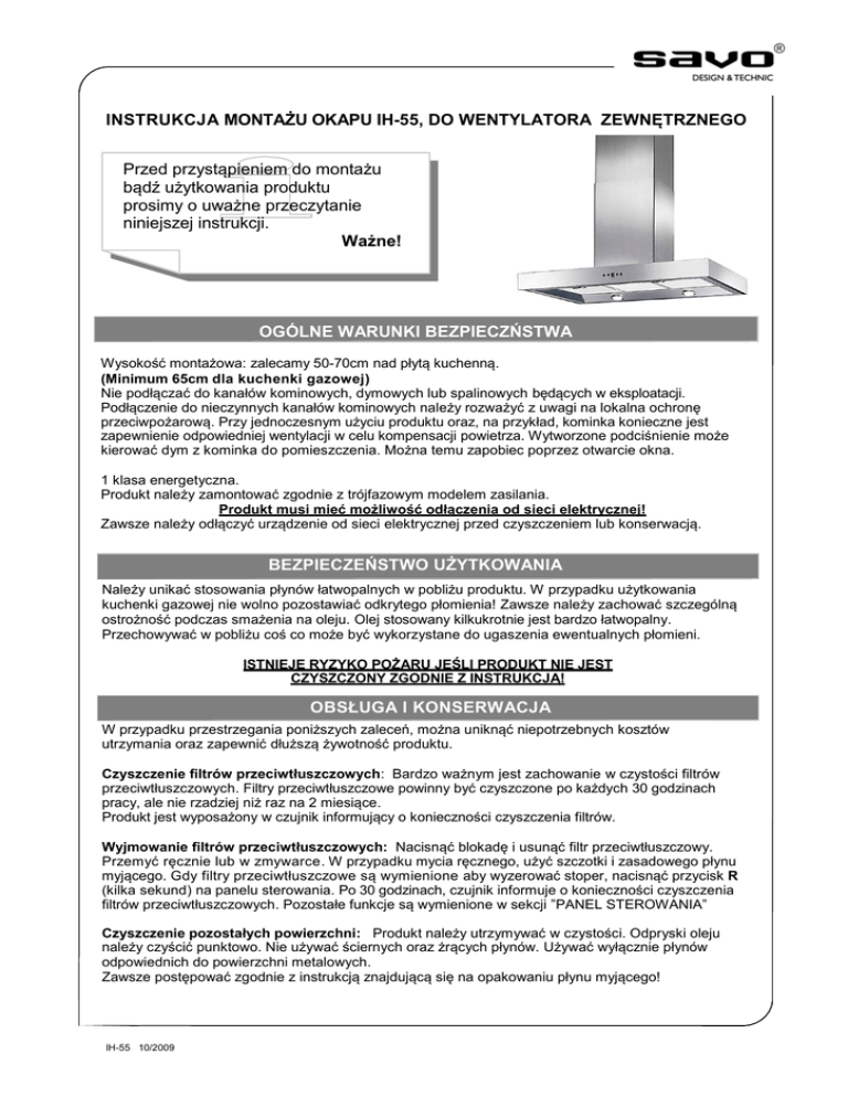 INSTRUKCJA MONTAŻU OKAPU IH-55, DO WENTYLATORA ZEWNĘTRZNEGO Przed przystąpieniem do montażu bądź użytkowania produktu prosimy o uważne przeczytanie niniejszej instrukcji. Ważne! OGÓLNE WARUNKI BEZPIECZŃSTWA Wysokość montażowa: zalecamy 50-70cm nad płytą kuchenną. (Minimum 65cm dla kuchenki gazowej) Nie podłączać do kanałów kominowych, dymowych lub spalinowych będących w eksploatacji. Podłączenie do nieczynnych kanałów kominowych należy rozważyć z uwagi na lokalna ochronę przeciwpożarową. Przy jednoczesnym użyciu produktu oraz, na przykład, kominka konieczne jest zapewnienie odpowiedniej wentylacji w celu kompensacji powietrza. Wytworzone podciśnienie może kierować dym z kominka do pomieszczenia. Można temu zapobiec poprzez otwarcie okna. 1 klasa energetyczna. Produkt należy zamontować zgodnie z trójfazowym modelem zasilania. Produkt musi mieć możliwość odłączenia od sieci elektrycznej! Zawsze należy odłączyć urządzenie od sieci elektrycznej przed czyszczeniem lub konserwacją. BEZPIECZEŃSTWO UŻYTKOWANIA Należy unikać stosowania płynów łatwopalnych w pobliżu produktu. W przypadku użytkowania kuchenki gazowej nie wolno pozostawiać odkrytego płomienia! Zawsze należy zachować szczególną ostrożność podczas smażenia na oleju. Olej stosowany kilkukrotnie jest bardzo łatwopalny. Przechowywać w pobliżu coś co może być wykorzystane do ugaszenia ewentualnych płomieni. ISTNIEJE RYZYKO POŻARU JEŚLI PRODUKT NIE JEST CZYSZCZONY ZGODNIE Z INSTRUKCJĄ! OBSŁUGA I KONSERWACJA W przypadku przestrzegania poniższych zaleceń, można uniknąć niepotrzebnych kosztów utrzymania oraz zapewnić dłuższą żywotność produktu. Czyszczenie filtrów przeciwtłuszczowych: Bardzo ważnym jest zachowanie w czystości filtrów przeciwtłuszczowych. Filtry przeciwtłuszczowe powinny być czyszczone po każdych 30 godzinach pracy, ale nie rzadziej niż raz na 2 miesiące. Produkt jest wyposażony w czujnik informujący o konieczności czyszczenia filtrów. Wyjmowanie filtrów przeciwtłuszczowych: Nacisnąć blokadę i usunąć filtr przeciwtłuszczowy. Przemyć ręcznie lub w zmywarce. W przypadku mycia ręcznego, użyć szczotki i zasadowego płynu myjącego. Gdy filtry przeciwtłuszczowe są wymienione aby wyzerować stoper, nacisnąć przycisk R (kilka sekund) na panelu sterowania. Po 30 godzinach, czujnik informuje o konieczności czyszczenia filtrów przeciwtłuszczowych. Pozostałe funkcje są wymienione w sekcji ”PANEL STEROWANIA” Czyszczenie pozostałych powierzchni: Produkt należy utrzymywać w czystości. Odpryski oleju należy czyścić punktowo. Nie używać ściernych oraz żrących płynów. Używać wyłącznie płynów odpowiednich do powierzchni metalowych. Zawsze postępować zgodnie z instrukcją znajdującą się na opakowaniu płynu myjącego! IH-55 10/2009 WYCIĄG Okap bez wbudowanego silnika powinien być podłączony do rury wentylacyjnej z zainstalowanym silnikiem zewnętrznym (umieszczonym na dachu). Powietrze oraz para wodna są wyciągane poprzez rurę wentylacyjną. Panel kontrolny steruje działaniem silnika zewnętrznego. W budynkach mieszkalnych oraz innych budynkach z podobnymi systemami centralnej wentylacji podłączanie do rury wentylacyjnej jest zabronione! MONTAŻ Przed rozpoczęciem montażu: • Przełącznik musi znajdować się w dostępnym miejscu • Wyciąg: redukcja rury 150/125mm (rura nie zawarta w dostarczonym produkcie) C Zdjąć filtry przeciwtłuszczowe naciskając blokadę C. Montaż: Na suficie używając dołączonego szablonu oznaczyć centralną pozycję okapu. UWAGA: umiejscowienie wspornika określa ostateczną pozycję okapu. Wywiercić otwory, używając dołączonego szablonu. Zamontować wspornik szczeliną B naprzeciwko strony panelu sterowania. B Podłączyć zasilanie do okapu za pomocą 3 wkrętów oraz 2 metalowych podkładek. Poprowadzić kabel zasilający przez mały otwór we wsporniku. Strukturę teleskopową zamocować do wspornika za pomocą 4 śrub. W celu regulacji wysokości, użyć śrub D. D Uwaga : minimalna odległość IH-55 10/2009 WYCIĄG (SILNIK ZEWNĘTRZNY) Zastosować zawór zwrotny L na początku rury wentylacyjnej. Zapobiegnie to wniknięciu zimnego powietrza do pomieszczenia podczas wyłączonego silnika. Podłączyć rurę Ø150mm w celu uzyskania możliwie najlepszej wydajności okapu. Rura musi być tak prosta i krótka jak to tylko możliwe (rura nie znajduje się w zestawie). Upewnij się, że rura wentylacyjna jest odpowiednio zaizolowana. S L L Jeśli rura ma średnicę Ø125mm, zastosuj redukcję S. Nie zaleca się stosowania rur o średnicy mniejszej niż 125mm (zbyt duże ciśnienie może uszkodzić silnik). PODŁĄCZENIE DO SIECI ELEKTRYCZNEJ Sprawdź kompatybilność połączenia okapu z silnikiem zewnętrznym. Producent nie ponosi odpowiedzialności za nieprawidłową instalację! Ważne! B Podłączenie z silnikiem zewnętrznym: • Oznaczyć pokrywkę B jako “SILNIK ZEWNĘTRZNY” • Sprawdzić podłączenie przewodów • Żółty/zielony ( ) uziemienie • Niebieski ( N ) zero • Czerwony ( L ) napięcie zasilania Wymaga instalacji obwodu zamkniętego! Pobór mocy: • Zamontowany fabrycznie biały kabel (150cm) • Sprawdzić połączenia przewodów • Żółty/zielony ( ) uziemienie • Niebieski ( N ) zero • Brązowy ( L ) napięcie zasilania 230V Zamontować górną osłonę przewodu do wspornika za pomocą 2 wkrętów. Przymocować dolny przewód za pomocą wkrętu. Przymocować okap do osłony teleskopowej używając 4 wkrętów. Przymocować rurę wentylacyjną poprzez otwór D. Opuścić dolną osłonę. Wymienić filtry przeciwtłuszczowe. Podłączyć do sieci elektroenergetycznej. IH-55 10/2009 D PANEL STEROWANIA Funkcja uruchamiania zimowego: Po włączeniu, silnik przez chwilę działa z prędkością 4. Następnie okap przełącza się na prędkość, przy której został poprzednio wyłączony. Przycisk 