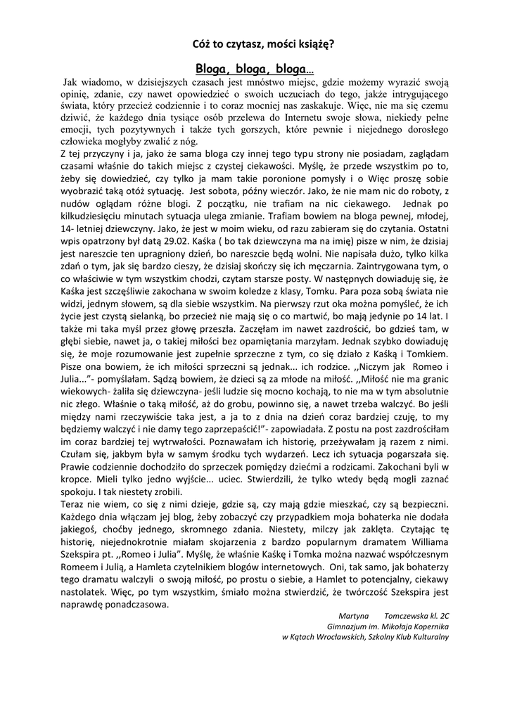 Cóż to czytasz, mości książę? Bloga, bloga, bloga… Jak wiadomo, w dzisiejszych czasach jest mnóstwo miejsc, gdzie możemy wyrazić swoją opinię, zdanie, czy nawet opowiedzieć o swoich uczuciach do tego, jakże intrygującego świata, który przecież codziennie i to coraz mocniej nas zaskakuje. Więc, nie ma się czemu dziwić, że każdego dnia tysiące osób przelewa do Internetu swoje słowa, niekiedy pełne emocji, tych pozytywnych i także tych gorszych, które pewnie i niejednego dorosłego człowieka mogłyby zwalić z nóg. Z tej przyczyny i ja, jako że sama bloga czy innej tego typu strony nie posiadam, zaglądam czasami właśnie do takich miejsc z czystej ciekawości. Myślę, że przede wszystkim po to, żeby się dowiedzieć, czy tylko ja mam takie poronione pomysły i o Więc proszę sobie wyobrazić taką otóż sytuację. Jest sobota, późny wieczór. Jako, że nie mam nic do roboty, z nudów oglądam różne blogi. Z początku, nie trafiam na nic ciekawego. Jednak po kilkudziesięciu minutach sytuacja ulega zmianie. Trafiam bowiem na bloga pewnej, młodej, 14- letniej dziewczyny. Jako, że jest w moim wieku, od razu zabieram się do czytania. Ostatni wpis opatrzony był datą 29.02. Kaśka ( bo tak dziewczyna ma na imię) pisze w nim, że dzisiaj jest nareszcie ten upragniony dzień, bo nareszcie będą wolni. Nie napisała dużo, tylko kilka zdań o tym, jak się bardzo cieszy, że dzisiaj skończy się ich męczarnia. Zaintrygowana tym, o co właściwie w tym wszystkim chodzi, czytam starsze posty. W następnych dowiaduję się, że Kaśka jest szczęśliwie zakochana w swoim koledze z klasy, Tomku. Para poza sobą świata nie widzi, jednym słowem, są dla siebie wszystkim. Na pierwszy rzut oka można pomyśleć, że ich życie jest czystą sielanką, bo przecież nie mają się o co martwić, bo mają jedynie po 14 lat. I także mi taka myśl przez głowę przeszła. Zaczęłam im nawet zazdrościć, bo gdzieś tam, w głębi siebie, nawet ja, o takiej miłości bez opamiętania marzyłam. Jednak szybko dowiaduję się, że moje rozumowanie jest zupełnie sprzeczne z tym, co się działo z Kaśką i Tomkiem. Pisze ona bowiem, że ich miłości sprzeczni są jednak... ich rodzice. ,,Niczym jak Romeo i Julia...”- pomyślałam. Sądzą bowiem, że dzieci są za młode na miłość. ,,Miłość nie ma granic wiekowych- żaliła się dziewczyna- jeśli ludzie się mocno kochają, to nie ma w tym absolutnie nic złego. Właśnie o taką miłość, aż do grobu, powinno się, a nawet trzeba walczyć. Bo jeśli między nami rzeczywiście taka jest, a ja to z dnia na dzień coraz bardziej czuję, to my będziemy walczyć i nie damy tego zaprzepaścić!”- zapowiadała. Z postu na post zazdrościłam im coraz bardziej tej wytrwałości. Poznawałam ich historię, przeżywałam ją razem z nimi. Czułam się, jakbym była w samym środku tych wydarzeń. Lecz ich sytuacja pogarszała się. Prawie codziennie dochodziło do sprzeczek pomiędzy dziećmi a rodzicami. Zakochani byli w kropce. Mieli tylko jedno wyjście... uciec. Stwierdzili, że tylko wtedy będą mogli zaznać spokoju. I tak niestety zrobili. Teraz nie wiem, co się z nimi dzieje, gdzie są, czy mają gdzie mieszkać, czy są bezpieczni. Każdego dnia włączam jej blog, żeby zobaczyć czy przypadkiem moja bohaterka nie dodała jakiegoś, choćby jednego, skromnego zdania. Niestety, milczy jak zaklęta. Czytając tę historię, niejednokrotnie miałam skojarzenia z bardzo popularnym dramatem Williama Szekspira pt. ,,Romeo i Julia”. Myślę, że właśnie Kaśkę i Tomka można nazwać współczesnym Romeem i Julią, a Hamleta czytelnikiem blogów internetowych. Oni, tak samo, jak bohaterzy tego dramatu walczyli o swoją miłość, po prostu o siebie, a Hamlet to potencjalny, ciekawy nastolatek. Więc, po tym wszystkim, śmiało można stwierdzić, że twórczość Szekspira jest naprawdę ponadczasowa. Martyna Tomczewska kl. 2C Gimnazjum im. Mikołaja Kopernika w Kątach Wrocławskich, Szkolny Klub Kulturalny