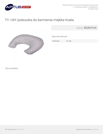 Sklep dziecięcy Smykuś Remigiusz Kaczmarek ul. Nowotoruńska 12, Bydgoszcz 52 362 02 63 TY i MY poduszka do karmienia miękka Koala Cena: 45,69 PLN Opis słownikowy Producent Ty i My Opis produktu Plik wygenerowano: 03-03-2017 Powered by TCPDF (www.tcpdf.org) Oprogramowanie sklepu: AptusShop