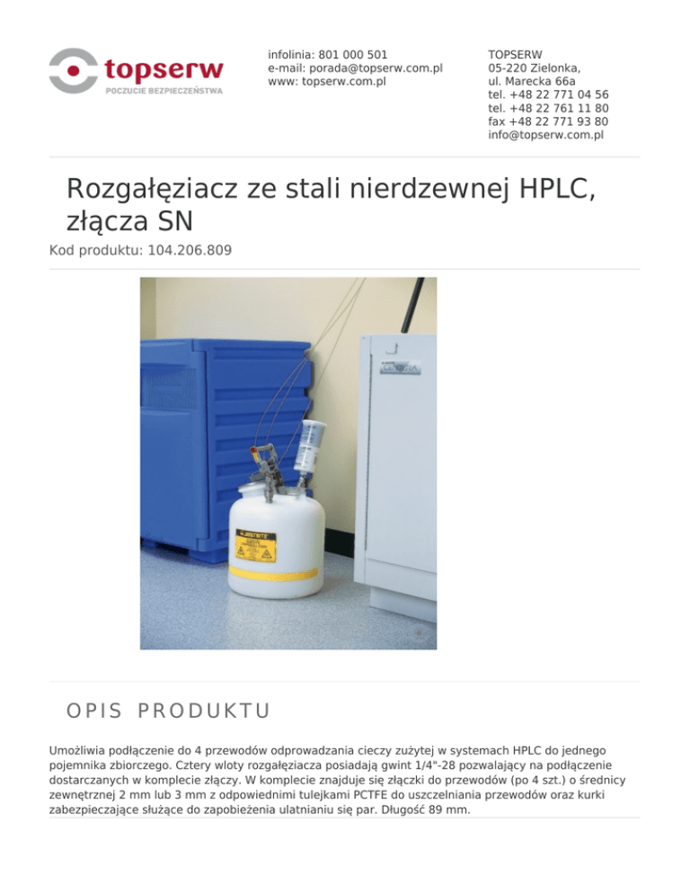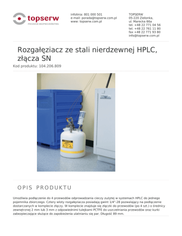 infolinia: 801 000 501 e-mail: [email protected] www: topserw.com.pl TOPSERW 05-220 Zielonka, ul. Marecka 66a tel. +48 22 771 04 56 tel. +48 22 761 11 80 fax +48 22 771 93 80 [email protected] Rozgałęziacz ze stali nierdzewnej HPLC, złącza SN Kod produktu: 104.206.809 OPIS PRODUKTU Umożliwia podłączenie do 4 przewodów odprowadzania cieczy zużytej w systemach HPLC do jednego pojemnika zbiorczego. Cztery wloty rozgałęziacza posiadają gwint 1/4"-28 pozwalający na podłączenie dostarczanych w komplecie złączy. W komplecie znajduje się złączki do przewodów (po 4 szt.) o średnicy zewnętrznej 2 mm lub 3 mm z odpowiednimi tulejkami PCTFE do uszczelniania przewodów oraz kurki zabezpieczające służące do zapobieżenia ulatnianiu się par. Długość 89 mm. DANE TECHNICZNE
