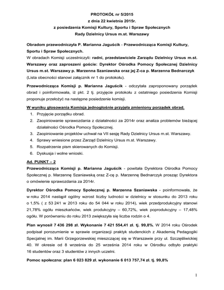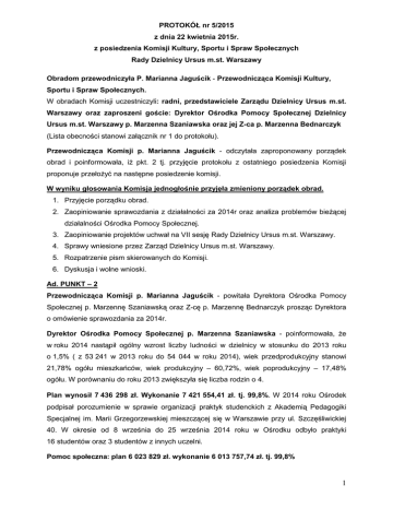 PROTOKÓŁ nr 5/2015 z dnia 22 kwietnia 2015r. z posiedzenia Komisji Kultury, Sportu i Spraw Społecznych Rady Dzielnicy Ursus m.st. Warszawy Obradom przewodniczyła P. Marianna Jaguścik - Przewodnicząca Komisji Kultury, Sportu i Spraw Społecznych. W obradach Komisji uczestniczyli: radni, przedstawiciele Zarządu Dzielnicy Ursus m.st. Warszawy oraz zaproszeni goście: Dyrektor Ośrodka Pomocy Społecznej Dzielnicy Ursus m.st. Warszawy p. Marzenna Szaniawska oraz jej Z-ca p. Marzenna Bednarczyk (Lista obecności stanowi załącznik nr 1 do protokołu). Przewodnicząca Komisji p. Marianna Jaguścik - odczytała zaproponowany porządek obrad i poinformowała, iż pkt. 2 tj. przyjęcie protokołu z ostatniego posiedzenia Komisji proponuje przełożyć na następne posiedzenie komisji. W wyniku głosowania Komisja jednogłośnie przyjęła zmieniony porządek obrad. 1. Przyjęcie porządku obrad. 2. Zaopiniowanie sprawozdania z działalności za 2014r oraz analiza problemów bieżącej działalności Ośrodka Pomocy Społecznej. 3. Zaopiniowanie projektów uchwał na VII sesję Rady Dzielnicy Ursus m.st. Warszawy. 4. Sprawy wniesione przez Zarząd Dzielnicy Ursus m.st. Warszawy. 5. Rozpatrzenie pism skierowanych do Komisji. 6. Dyskusja i wolne wnioski. Ad. PUNKT – 2 Przewodnicząca Komisji p. Marianna Jaguścik - powitała Dyrektora Ośrodka Pomocy Społecznej p. Marzennę Szaniawską oraz Z-cę p. Marzennę Bednarczyk prosząc Dyrektora o omówienie sprawozdania za 2014r. Dyrektor Ośrodka Pomocy Społecznej p. Marzenna Szaniawska - poinformowała, że w roku 2014 nastąpił ogólny wzrost liczby ludności w dzielnicy w stosunku do 2013 roku o 1,5% ( z 53 241 w 2013 roku do 54 044 w roku 2014), wiek przedprodukcyjny stanowi 21,78% ogółu mieszkańców, wiek produkcyjny – 60,72%, wiek poprodukcyjny – 17,48% ogółu. W porównaniu do roku 2013 zwiększyła się liczba rodzin o 4. Plan wynosił 7 436 298 zł. Wykonanie 7 421 554,41 zł. tj. 99,8%. W 2014 roku Ośrodek podpisał porozumienie w sprawie organizacji praktyk studenckich z Akademią Pedagogiki Specjalnej im. Marii Grzegorzewskiej mieszczącej się w Warszawie przy ul. Szczęśliwickiej 40. W okresie od 8 września do 25 września 2014 roku w Ośrodku odbyło praktyki 16 studentów oraz 3 studentów z innych uczelni. Pomoc społeczna: plan 6 023 829 zł. wykonanie 6 013 757,74 zł. tj. 99,8% 1 Rozdział 85228 Usługi opiekuńcze i specjalistyczne usługi opiekuńcze: plan 502 133,00 zł. wykonanie 502 116 zł tj. 100 %. W okresie sprawozdawczym usługami opiekuńczymi objęto 154 osoby, które z uwagi na podeszły wiek lub niepełnosprawność fizyczną wymagały pomocy w kwocie 404 126,00 zł Specjalistycznymi usługami opiekuńczymi objęto 46 osób za kwotę 97 990,00 zł. Pomoc bezrobotnym, aktywizacja zawodowa: plan 287 600,00 zł wykonanie 282 547,94 zł tj. 98,2% Rozdział 85214 - wypłata zasiłków celowych dla osób uczestniczących w projekcie współfinansowanym ze środków Europejskiego Funduszu Społecznego: plan 29 022,00 zł wykonanie 28 782,15 zł tj. 99,2%. W ramach zadań współfinansowanych ze środków EFS kwotę 28 782,15 zł przeznaczono na wypłatę zasiłków celowych i celowych specjalnych dla osób uczestniczących w realizowanym w 2014 roku przez nasz Ośrodek projekcie „Ja i moja przyszłość”. Rozdział 85395- Zadania z zakresu pomocy bezrobotnym: plan 258 578,00 zł wykonanie 253 765,79 zł tj.99,2 % 1. Projekt „Ja i moja przyszłość”: plan 247 378,00 zł wykonanie 245 333,59 zł tj. 99,2% 2. Organizacja prac społecznie użytecznych: plan 11 200,00 zł wykonanie 8 432,20zł.tj. 75,3%. Wydatkowane w ramach tego rozdziału środki zostały przeznaczone na wynagrodzenia dla 10 osób wykonujących prace społecznie użyteczne na rzecz przedszkoli działających w naszej dzielnicy. Rozdział 85219 - Wydatki Ośrodka Pomocy Społecznej: plan 2 870 883,00 zł wykonanie 2 870 738,63 zł tj. 100%. z przeznaczeniem na realizację wydatków z zakresu pomocy społecznej dla 1725 podopiecznych, w tym wynagrodzenia wraz z pochodnymi, m.in. średnioroczne zatrudnienie – 37,5 etatów (38 osób zatrudnionych na podstawie umowy o pracę),1 osoba zatrudniona na postawie umowy zlecenie do wykonywania prac gospodarczych wokół budynku OPS, wydatki rzeczowe – 233 899,87 zł, w tym m.in. na: zakup materiałów i wyposażenia (m.in. meble i materiały biurowe, środki czystości, druki, paliwo do samochodu), zakup energii, zakup usług remontowych, usług pozostałych (opłaty pocztowe, telefoniczne, szkolenia, nadzór nad oprogramowaniem komputerowym), a także odpisy na zakładowy fundusz świadczeń socjalnych, zakup usług dostępu do sieci internetowej, podróże służbowe, różne opłaty i składki (ubezpieczenie samochodu) wpłaty na PFRON. Rozdział 85203 - Prowadzenie i bieżące utrzymanie ośrodków wsparcia, których finansowanie odbywa się ze środków własnych i ze środków budżetu państwa: plan 1 568 549,00 zł wykonanie 1 568 421,17 zł. tj.100 % w ramach zadań zleconych na koszty funkcjonowania Środowiskowego Domu Samopomocy, z którego w okresie sprawozdawczym korzystało średnio 21 osób dziennie. W ramach zadań własnych 2 realizowane były: działalność Integracyjnego Ośrodka Wsparcia dla Dzieci i Młodzieży „STOKROTKA”, Centrum Pomocy Rodzinie i Dziecku oraz na działalność Domu Dziennego Pobytu Seniorów. Rozdział 85206 – Działalność zespołu do spraw asysty rodzinnej dla zapewnienia wsparcia rodzinie przeżywającej trudności w wypełnianiu funkcji opiekuńczowychowawczych: plan 178 464 zł wykonanie 177 873,57 zł tj. 99,7 % Dożywianie: plan 616 200 zł wykonanie 612 060,43zł tj. 99,3 % Realizacja programu „Pomoc państwa w zakresie dożywiania”: plan 320 000,00zł. wykonanie 316 335,65 zł tj. 98,9 %. W ramach rozdziału 85214 podzadanie finansowane jest ze środków własnych m. st. Warszawy na które wydatkowano kwotę 151 335,65 zł, nat