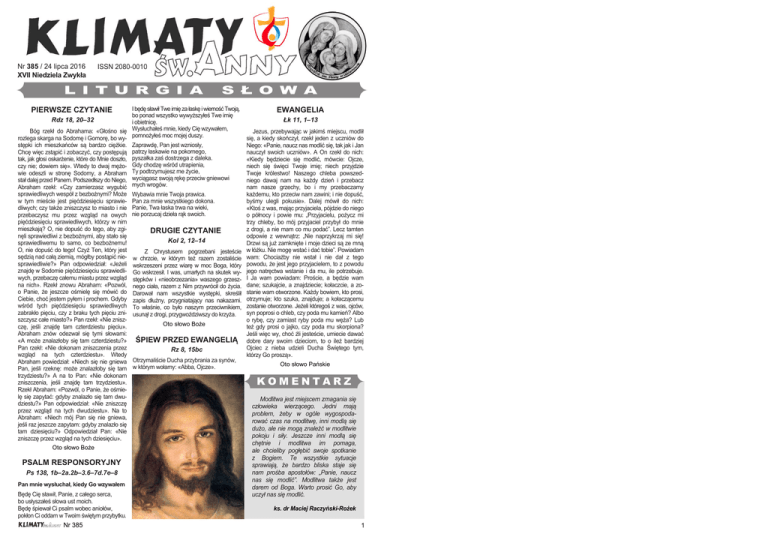 Nr 385 / 24 lipca 2016 XVII Niedziela Zwykła ISSN 2080-0010 L I T U R G I A PIERWSZE CZYTANIE S Ł O W A I będę sławił Twe imię za łaskę i wierność Twoją, bo ponad wszystko wywyższyłeś Twe imię Rdz 18, 20–32 i obietnicę. Bóg rzekł do Abrahama: «Głośno się Wysłuchałeś mnie, kiedy Cię wzywałem, rozlega skarga na Sodomę i Gomorę, bo wy- pomnożyłeś moc mojej duszy. stępki ich mieszkańców są bardzo ciężkie. Zaprawdę, Pan jest wzniosły, Chcę więc zstąpić i zobaczyć, czy postępują patrzy łaskawie na pokornego, tak, jak głosi oskarżenie, które do Mnie doszło, pyszałka zaś dostrzega z daleka. czy nie; dowiem się». Wtedy to dwaj mężo- Gdy chodzę wśród utrapienia, wie odeszli w stronę Sodomy, a Abraham Ty podtrzymujesz me życie, stał dalej przed Panem. Podszedłszy do Niego, wyciągasz swoją rękę przeciw gniewowi Abraham rzekł: «Czy zamierzasz wygubić mych wrogów. sprawiedliwych wespół z bezbożnymi? Może Wybawia mnie Twoja prawica. w tym mieście jest pięćdziesięciu sprawie- Pan za mnie wszystkiego dokona. dliwych; czy także zniszczysz to miasto i nie Panie, Twa łaska trwa na wieki, przebaczysz mu przez wzgląd na owych nie porzucaj dzieła rąk swoich. pięćdziesięciu sprawiedliwych, którzy w nim mieszkają? O, nie dopuść do tego, aby zgiDRUGIE CZYTANIE nęli sprawiedliwi z bezbożnymi, aby stało się Kol 2, 12–14 sprawiedliwemu to samo, co bezbożnemu! O, nie dopuść do tego! Czyż Ten, który jest Z Chrystusem pogrzebani jesteście sędzią nad całą ziemią, mógłby postąpić nie- w chrzcie, w którym też razem zostaliście sprawiedliwie?» Pan odpowiedział: «Jeżeli wskrzeszeni przez wiarę w moc Boga, który znajdę w Sodomie pięćdziesięciu sprawiedli- Go wskrzesił. I was, umarłych na skutek wywych, przebaczę całemu miastu przez wzgląd stępków i «nieobrzezania» waszego grzeszna nich». Rzekł znowu Abraham: «Pozwól, nego ciała, razem z Nim przywrócił do życia. o Panie, że jeszcze ośmielę się mówić do Darował nam wszystkie występki, skreślił Ciebie, choć jestem pyłem i prochem. Gdyby zapis dłużny, przygniatający nas nakazami. wśród tych pięćdziesięciu sprawiedliwych To właśnie, co było naszym przeciwnikiem, zabrakło pięciu, czy z braku tych pięciu zni- usunął z drogi, przygwoździwszy do krzyża. szczysz całe miasto?» Pan rzekł: «Nie zniszOto słowo Boże czę, jeśli znajdę tam czterdziestu pięciu». Abraham znów odezwał się tymi słowami: «A może znalazłoby się tam czterdziestu?» ŚPIEW PRZED EWANGELIĄ Pan rzekł: «Nie dokonam zniszczenia przez Rz 8, 15bc wzgląd na tych czterdziestu». Wtedy Abraham powiedział: «Niech się nie gniewa Otrzymaliście Ducha przybrania za synów, Pan, jeśli rzeknę: może znalazłoby się tam w którym wołamy: «Abba, Ojcze». trzydziestu?» A na to Pan: «Nie dokonam zniszczenia, jeśli znajdę tam trzydziestu». Rzekł Abraham: «Pozwól, o Panie, że ośmielę się zapytać: gdyby znalazło się tam dwudziestu?» Pan odpowiedział: «Nie zniszczę przez wzgląd na tych dwudziestu». Na to Abraham: «Niech mój Pan się nie gniewa, jeśli raz jeszcze zapytam: gdyby znalazło się tam dziesięciu?» Odpowiedział Pan: «Nie zniszczę przez wzgląd na tych dziesięciu». Oto słowo Boże PSALM RESPONSORYJNY Ps 138, 1b–2a.2b–3.6–7d.7e–8 Pan mnie wysłuchał, kiedy Go wzywałem Będę Cię sławił, Panie, z całego serca, bo usłyszałeś słowa ust moich. Będę śpiewał Ci psalm wobec aniołów, pokłon Ci oddam w Twoim świętym przybytku. Nr 385 EWANGELIA Łk 11, 1–13 Jezus, przebywając w jakimś miejscu, modlił się, a kiedy skończył, rzekł jeden z uczniów do Niego: «Panie, naucz nas modlić się, tak jak i Jan nauczył swoich uczniów». A On rzekł do nich: «Kiedy będziecie się modlić, mówcie: Ojcze, niech się święci Twoje imię; niech przyjdzie Twoje królestwo! Naszego chleba powszedniego dawaj nam na każdy dzień i przebacz nam nasze grzechy, bo i my przebaczamy każdemu, kto przeciw nam zawini; i nie dopuść, byśmy ulegli pokusie». Dalej mówił do nich: «Ktoś z was, mając przyjaciela, pójdzie do niego o północy i powie mu: „Przyjacielu, pożycz mi trzy chleby, bo mój przyjaciel przybył do mnie z drogi, a nie mam co mu podać”. Lecz tamten odpowie z wewnątrz: „Nie naprzykrzaj mi się! Drzwi są już zamknięte i moje dzieci są ze mną w łóżku. Nie mogę wstać i dać tobie”. Powiadam wam: Chociażby nie wstał i nie dał z tego powodu, że jest jego przyjacielem, to z powodu jego natręctwa wstanie i da mu, ile potrzebuje. I Ja wam powiadam: Proście, a będzie wam dane; szukajcie, a znajdziecie; kołaczcie, a zostanie wam otworzone. Każdy bowiem, kto prosi, otrzymuje; kto szuka, znajduje; a kołaczącemu zostanie otworzone. Jeżeli któregoś z was, ojców, syn poprosi o chleb, czy poda mu kamień? Albo o rybę, czy zamiast ryby poda mu węża? Lub też gdy prosi o jajko, czy poda mu skorpiona? Jeśli więc wy, choć źli jesteście, umiecie dawać dobre dary swoim dzieciom, to o ileż bardziej Ojciec z nieba udzieli Ducha Świętego tym, którzy Go proszą». Oto słowo Pańskie KOMENTARZ Modlitwa jest miejscem zmagania się człowieka wierzącego. Jedni mają problem, żeby w ogóle wygospodarować czas na modlitwę, inni modlą się dużo, ale nie mogą znaleźć w modlitwie pokoju i siły. Jeszcze inni modlą się chętnie i modlitwa im pomaga, ale chcieliby pogłębić swoje spotkanie z Bogiem. Te wszystkie sytuacje sprawiają, że bardzo bliska staje się nam prośba apostołów: „Panie, naucz nas się modlić”. Modlitwa także jest darem od Boga. Warto prosić Go, aby uczył nas się modlić. ks. dr Maciej Raczyński-Rożek 1 KOMUNIKATY DUSZPASTERSKIE XVII Niedziela Zwykła – 24 lipca 2016 r. 1. Trwa nowenna do św. Anny – nasze 4. W tym roku uroczystość patronalną naszej 7.W najbliższym czasie sakramentalny związek par
