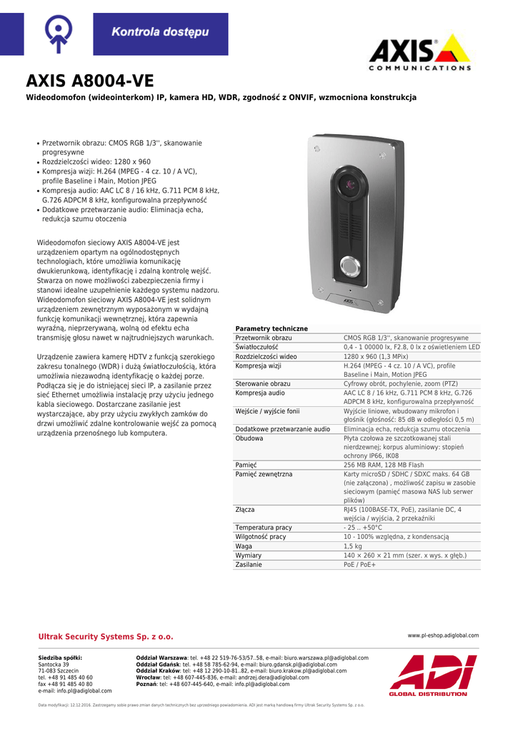 AXIS A8004-VE Wideodomofon (wideointerkom) IP, kamera HD, WDR, zgodność z ONVIF, wzmocniona konstrukcja ● ● ● ● ● Przetwornik obrazu: CMOS RGB 1/3'', skanowanie progresywne Rozdzielczości wideo: 1280 x 960 Kompresja wizji: H.264 (MPEG - 4 cz. 10 / A VC), profile Baseline i Main, Motion JPEG Kompresja audio: AAC LC 8 / 16 kHz, G.711 PCM 8 kHz, G.726 ADPCM 8 kHz, konfigurowalna przepływność Dodatkowe przetwarzanie audio: Eliminacja echa, redukcja szumu otoczenia Wideodomofon sieciowy AXIS A8004-VE jest urządzeniem opartym na ogólnodostępnych technologiach, które umożliwia komunikację dwukierunkową, identyfikację i zdalną kontrolę wejść. Stwarza on nowe możliwości zabezpieczenia firmy i stanowi idealne uzupełnienie każdego systemu nadzoru. Wideodomofon sieciowy AXIS A8004-VE jest solidnym urządzeniem zewnętrznym wyposażonym w wydajną funkcję komunikacji wewnętrznej, która zapewnia wyraźną, nieprzerywaną, wolną od efektu echa transmisję głosu nawet w najtrudniejszych warunkach. Urządzenie zawiera kamerę HDTV z funkcją szerokiego zakresu tonalnego (WDR) i dużą światłoczułością, która umożliwia niezawodną identyfikację o każdej porze. Podłącza się je do istniejącej sieci IP, a zasilanie przez sieć Ethernet umożliwia instalację przy użyciu jednego kabla sieciowego. Dostarczane zasilanie jest wystarczające, aby przy użyciu zwykłych zamków do drzwi umożliwić zdalne kontrolowanie wejść za pomocą urządzenia przenośnego lub komputera. Parametry techniczne Przetwornik obrazu Światłoczułość Rozdzielczości wideo Kompresja wizji Sterowanie obrazu Kompresja audio Wejście / wyjście fonii Dodatkowe przetwarzanie audio Obudowa Pamięć Pamięć zewnętrzna Złącza Temperatura pracy Wilgotność pracy Waga Wymiary Zasilanie CMOS RGB 1/3'', skanowanie progresywne 0,4 - 1 00000 lx, F2.8, 0 lx z oświetleniem LED 1280 x 960 (1,3 MPix) H.264 (MPEG - 4 cz. 10 / A VC), profile Baseline i Main, Motion JPEG Cyfrowy obrót, pochylenie, zoom (PTZ) AAC LC 8 / 16 kHz, G.711 PCM 8 kHz, G.726 ADPCM 8 kHz, konfigurowalna przepływność Wyjście liniowe, wbudowany mikrofon i głośnik (głośność: 85 dB w odległości 0,5 m) Eliminacja echa, redukcja szumu otoczenia Płyta czołowa ze szczotkowanej stali nierdzewnej; korpus aluminiowy: stopień ochrony IP66, IK08 256 MB RAM, 128 MB Flash Karty microSD / SDHC / SDXC maks. 64 GB (nie załączona) , możliwość zapisu w zasobie sieciowym (pamięć masowa NAS lub serwer plików) RJ45 (100BASE-TX, PoE), zasilanie DC, 4 wejścia / wyjścia, 2 przekaźniki - 25 .. +50°C 10 - 100% względna, z kondensacją 1,5 kg 140 × 260 × 21 mm (szer. x wys. x głęb.) PoE / PoE+ Ultrak Security Systems Sp. z o.o. Siedziba spółki: Santocka 39 71-083 Szczecin tel. +48 91 485 40 60 fax +48 91 485 40 80 e-mail: [email protected] Oddział Warszawa: tel. +48 22 519-76-53/57..58, e-mail: [email protected] Oddział Gdańsk: tel. +48 58 785-62-94, e-mail: [email protected] Oddział Kraków: tel: +48 12 290-10-81..82, e-mail: [email protected] Wrocław: tel: +48 607-445-836, e-mail: [email protected] Poznań: tel: +48 607-445-640, e-mail: [email protected] Data modyfikacji: 12.12.2016. Zastrzegamy sobie prawo zmian danych technicznych bez uprzedniego powiadomienia. ADI jest marką handlową firmy Ultrak Security Systems Sp. z o.o. www.pl-eshop.adiglobal.com