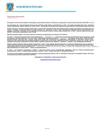 Sołectwo Rzemień 2015-08-19 13:40:55 Prowadzone na tym terenie badania archeologiczne potwierdziły istnienie w Rzemieniu cmentarzyska z okresu kultury łużyckiej (1200-1300 r. p.n.e.). Za protoplastę wsi o nazwie Rzemień należy uznać niewielką osadę Grodzą, wzmiankowaną w 1536 r. W osadzie powstałej obok wieży, mieszkało sześciu zagrodników. Rejestry poborowe z 1581 i 1591 r., wymieniają wieś Rzemień Jako należącą do parafii Rzochów (wzmiankowane jest Zazamcze). Grodzą, Zazamcze i Rzemień, położone obok zamku, z czasem stały się jedną wioską. Wieś położona była na szlaku, prowadzącym od Sandomierza do Karpat i na Węgry, od którego odłączał się szlak handlowy zw. „gościńcem na Ruś”. Przez szereg stuleci podmokłe tereny wokół Rzemienia nie sprzyjały osadnictwu. Lokowanie wsi na bagnistym terenie sprawiało trudności, jednak osada rozwijała się i w 1616 r. była już zorganizowaną wsią. W1629 r. wieś miała 8 zagrodników, młyn i tartak. Rzemień posiadali kolejno: Tarnowscy, Mieleccy, Lubomirscy, Sanguszkowie oraz Reyowie z Przecławia. Od 1913 r. w Rzemieniu funkcjonowała szkoła podstawowa #℣佐⌡⌀攀氀攀洀攀渀琀愀爀渀愀⌡⍃倣℣, a pierwszym nauczycielem był Konstanty Popiel z Rzochowa. Lekcje prowadzono w zamku Szaszkiewi- czów, aż do czasu wybudowania budynku dla szkoły #℣佐⌡⌀㤀㈀㌀ 爀⸀⌡⍃倣℣. Na budowę nowej szkoły i Straży Pożarnej, Szaszkiewiczowie ofiarowali pole i drewno. Dwór przez długie lata patronował tym instytucjom, wspomagając je finansowo. Hrabina Szaszkiewiczowa była założycielką Koła Gospodyń Wiejskich. Uczestniczyła w zebraniach, organizowała kursy przetworów, uprawy lnu i konopi, uprawy ogródków warzywnych, sadownictwa i hodowli drobiu. Wspólnie organizowano „Opłatek”, ’’Święcone”, „Jasełka” oraz przedstawienia teatralne. Podczas II wojny światowej, Niemcy założyli w Rzemieniu w 1941 r. obóz zagłady, który był filią obozu w Pustkowie. Zlokalizowano go za cegielnią, w miejscu gdzie dzisiaj wznosi się pamiątkowy obelisk. Teren obozu ogrodzony był drutem kolczastym, a w jego narożach stały wieże wartownicze. Więźniowie dostarczani byli z obozu w Pustkowie #℣佐⌡⌀漀搀眀漁簀漀渀漀 椀挀栀 稀 瀀漀眀爀漀琀攀洀 最搀礀 渀椀攀 洀礀氀椀 樀甁簀 稀搀漀氀渀椀 搀漀 瀀爀愀挀礀 瀀爀稀礀 眀礀搀漀戀礀眀愀渀椀甀 琀漀爀昀甀 椀 簀眀椀爀甀 稀 圀椀猁䈀漀欀椀⌡⍃倣℣. Obóz zlikwidowano w czerwcu 1944 r. - miesiąc przed wyzwoleniem. W 1947 r. do Rzemienia przeniesiono z Babicy k. Rzeszowa żeńskie Liceum Gospodarstwa Wiejskiego, które po różnych przeobrażeniach przekształcono w 1979 r. w Zespół Szkół Rolniczych, któremu w 1997 r. nadano imię prof. dr. Władysława Szafera. Na terenie wioski znajduje się kilkanaście kapliczek i krzyży przydrożnych jeszcze z XIX w., stawionych zazwyczaj na szczególne intencje. Nie znane są okoliczności powstania najstarszych kapliczek. Dziękujemy za odwiedziny i zapraszamy ponownie bezpośredni link do strony www strona 1/1 Powered by TCPDF (www.tcpdf.org)
