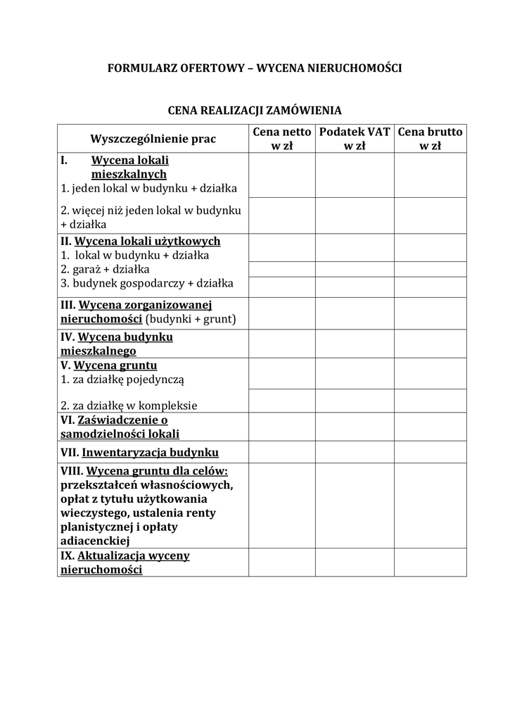FORMULARZ OFERTOWY – WYCENA NIERUCHOMOŚCI CENA REALIZACJI ZAMÓWIENIA Wyszczególnienie prac I. Wycena lokali mieszkalnych 1. jeden lokal w budynku + działka 2. więcej niż jeden lokal w budynku + działka II. Wycena lokali użytkowych 1. lokal w budynku + działka 2. garaż + działka 3. budynek gospodarczy + działka III. Wycena zorganizowanej nieruchomości (budynki + grunt) IV. Wycena budynku mieszkalnego V. Wycena gruntu 1. za działkę pojedynczą 2. za działkę w kompleksie VI. Zaświadczenie o samodzielności lokali VII. Inwentaryzacja budynku VIII. Wycena gruntu dla celów: przekształceń własnościowych, opłat z tytułu użytkowania wieczystego, ustalenia renty planistycznej i opłaty adiacenckiej IX. Aktualizacja wyceny nieruchomości Cena netto Podatek VAT Cena brutto w zł w zł w zł