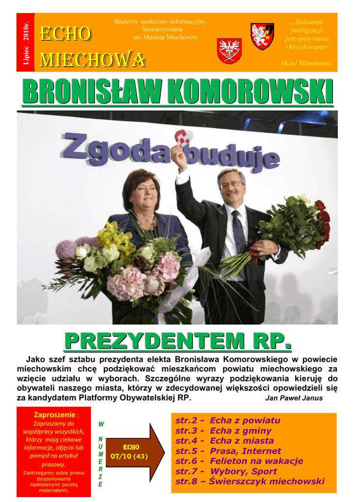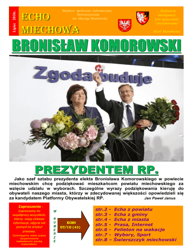 Lipiec 2010r. Biuletyn społeczno- informacyjny. Stowarzyszenia im. Macieja Miechowity Echo Miechowa „ Zadaniem inteligencji jest opisywanie i krytykowanie” (Karl Mannheim) BRONISŁAW KOMOROWSKI PREZYDENTEM RP. Jako szef sztabu prezydenta elekta Bronisława Komorowskiego w powiecie miechowskim chcę podziękować mieszkańcom powiatu miechowskiego za wzięcie udziału w wyborach. Szczególne wyrazy podziękowania kieruję do obywateli naszego miasta, którzy w zdecydowanej większości opowiedzieli się za kandydatem Platformy Obywatelskiej RP. Jan Paweł Janus Zaproszenie : Zapraszamy do współpracy wszystkich, którzy mają ciekawe informacje, zdjęcia lub pomysł na artykuł prasowy. Zastrzegamy sobie prawo dysponowania nadesłanymi pocztą materiałami. W N U M E R Z E ECHO 07/10 (43) str.2 str.3 str.4 str.5 str.6 str.7 str.8 – Echa z powiatu Echa z gminy Echa z miasta Prasa, Internet Felieton na wakacje Wybory, Sport Świerszczyk miechowski ECHA Z POWIATU. Charsznica-uroczysta sesja z okazji 20-lecia samorządu. 27 czerwca, w strażnicy OSP w Chodowie, odbyła się uroczysta sesja Rady Gminy z okazji 20 rocznicy powstania samorządu terytorialnego. Na sesję zostali zaproszeni radni Rady Gminy Charsznica wszystkich dotychczasowych kadencji o raz parlamentarzyści: Janusz Sepioł, Jerzy Fedorowicz i Zbysław Owczarski. Wszyscy goście otrzymali pamiątkowe medale upamiętniające rocznicę samorządową. Wójt Jan Żebrak krótko przedstawił dokonania charsznic kich samorządowców w takich obszarach jak: budowa dróg, kanalizacji, wodociągów, modernizacja oczyszczalni ścieków, modernizacja gminnych szkół, organizacja gminnych ośrodków dla niepełnosprawnych. Wybudowano nowe boiska, halę sportową i dom pomocy społecznej. Parlamentarzyści rozpływali się w pochwałach dla samego wójta, który kilka kadencji przewodzi samorządowi i ma olbrzymi udział w jego sukcesach. Kolejne pieniądze na drogi dla powiatu miechowskiego. 1 lipca starosta miechowski M.Bertek w towarzystwie wicestarosty S.Pietrzyka i członka Zarządu Powiatu D.Marczewskiego, z satysfakcją poinformował miechowską społeczność o kolejnym już pozyskaniu znacznych środków finansowych na odbudowę sieci dróg w naszym powiecie. Na zwołanej w tym celu konferencji prasowej Starosta przypomniał, że w czasie kończącej się kadencji powiat miechowski zmodernizował prawie 122 km swoich dróg na sieci liczącej 448 km (jednej z najdłuższych w Małopolsce). Wartość tych inwestycji przekroczyła 38.800.000 zł. Na ich wykonanie pozyskano blisko 28.880.000 zł z różnych źródeł (fundusze europejskie, programy rządowe, współfinansowanie gmin). W ciągu 4 lat powiat miechowski wyłożył na te działania ponad 9.960.000 zł. Szczególnym powodem ,,prasówki" było uzyskanie dofinansowania na dwie ważne drogi powiatowe w ramach MRPO, które ujęte zostały w modernizacyjnym programie pn. ,,Udrożnienie systemu komunikacyjnego powiatu miechowskiego - cz. III i IV". Strategia programu ma na celu odbudowę głównych dróg łączących poszczególne gminy z centrum powiatu. Informacje dotyczące rozbudowy drogi powiat. 1172K relacji Maków-Gołcza-Iwanowice-Zerwana podał wicestarsosta Stanisław Pietrzyk. Prace na tej drodze będą prowadzone na dług. 5,580 km. Koszt całkowity inwestycji wyniesie 4.634.546 zł. Dofinansowanie w wysokości 65% ze strony MRPO wyniesie 3.012.454 zł. Na powiat miechowski przypada kwota 1.622.091 zł , w tym Gmina Gołcza zapłaci 840.000 zł. Zakres robót obejmie m.in.: wzmocnienie i odnowienie nawierzchni bitumi cznej, modernizacje poboczy, budowę chodników i zatoki autobusowej w Wysocicach, budowę kanalizacji deszczowej na określonych odcinkach i remont urządzeń odwadniających drogę, budowę 2 obiektów mostowych. Z kolei o rozbudowie drogi powiatowej relacji Miechów - Zielenice mówił Dariusz Marczewski, członek Zarządu Powiatu. Modernizacja tego szlaku prowadzona będzie na długości 13,857 km. Koszt prac wyniesie 5.995.410 zł. Uzyskane przez powiat dofinansowanie z MRPO wielkości 65% to kwota 3.897.016 zł. Po stronie powiatu miechowskiego jest 2.098.393 zł, w tym na Gminę Miechów przypada 550.000 zł. W planie prac na tzw. odcinku miejskim o dług. 0,730 km (ul. Powstańców od obwodnicy E-7) ujęto m.in. odnowę nawierzchni jezdni wraz z poszerzeniami, przebudowę chodników dla pieszych, wymianę oznakowania pionowego i poziomego. Natomiast na odcinku zamiejskim wykonane zostaną m.in: odnowa nawierzchni, obustronne utwardzenie poboczy, renowacja rowów odwadniających, montaż barier zabezpieczających stalowych, budowa sygnalizacji świetlnej ostrzegawczej nad przejściem dla pieszych (miejsce: 11,203 km ww. odcinka), budowa zatok autobusowych w Nasiechowicach. Prezentowane na prasówce dwie drogi powiatowe zostaną dzięki pozyskanemu dofinansowaniu zmodernizowane w la tach 2011-12 i tym samym przybędzie kolejnych 20 km nowoczesnych i bezpiecznych dróg powiatowych. Przetarg na ich wykonanie odbędzie się już jesienią. W końcowej części konferencji wicestarosta zapoznał dziennikarzy z bieżącymi pracami na sieci dróg powiatowych. Trwają roboty na dwóch odcinkach dróg powiatowych realizowanych w ramach tzw. schetynówek na odcinkach: Kozłów-Kępie-Charsznica i Małoszów-Janowice. Niebawem rozpocznie się budowa brakującego chodnika przy ul. Piłsudskiego w Miechowie na odcinku pomiędzy ul. Pęckowskiego i Taborowicza. Pl anem robót przewidziane są także remonty dwóch obiektów inżynierskich (mostów) w Przesławicach na terenie Gminy Miechów. Rozmowy po wyborach o wyborach. 17 lipca miechowscy platformersi wyznaczyli sobie spotkanie powyborcze w plenerze. Na imprezę przybyli goście z Krakowa: poseł Jarosław Gowin z wnuczkiem, poseł Jerzy Fedorowicz z żoną, szef Wojewódzkiej Agencji Restrukturyzacji i Modernizacji Rolnictwa Marcin Bielówka, wiceprzewodniczący Zarządu Koła Kraków-Stare Miasto A