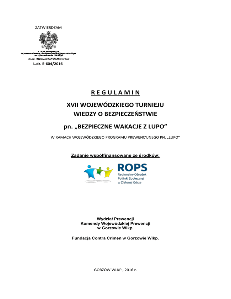 ZATWIERDZAM L.dz. E-604/2016 REGULAMIN XVII WOJEWÓDZKIEGO TURNIEJU WIEDZY O BEZPIECZEŃSTWIE pn. „BEZPIECZNE WAKACJE Z LUPO” W RAMACH WOJEWÓDZKIEGO PROGRAMU PREWENCYJNEGO PN. „LUPO” Zadanie współfinansowane ze środków: Wydział Prewencji Komendy Wojewódzkiej Prewencji w Gorzowie Wlkp. Fundacja Contra Crimen w Gorzowie Wlkp. GORZÓW WLKP., 2016 r. I. CEL GŁÓWNY TURNIEJU Ograniczanie przestępczości i demoralizacji nieletnich oraz innych zjawisk patologicznych wśród dzieci i młodzieży. II. CELE POŚREDNIE TURNIEJU 1. Edukacja dzieci i młodzieży z zakresu: - przeciwdziałania przemocy (w tym cyberprzemocy), - bezpieczeństwa na imprezach masowych, - zasad ruchu drogowego, - bezpiecznych zachowań i sposobów unikania zagrożeń, - uzależnień i zdrowego stylu życia, - pierwszej pomocy przedmedycznej. 2. Kształtowanie postaw młodych ludzi zgodnych z normami prawnymi i społecznymi. III. ZAŁOŻENIA OGÓLNE 1. Eliminacje do Turnieju odbędą się na poziomach: - powiatu, - województwa. 2. Organizatorem Turnieju na poziomie powiatowym jest komenda powiatowa/miejska Policji województwa lubuskiego. 3. Organizatorem Turnieju na poziomie wojewódzkim jest Wydział Prewencji Komendy Wojewódzkiej Policji w Gorzowie Wlkp. Współorganizatorami są: Kuratorium Oświaty, Wojewódzki Ośrodek Metodycznym w Gorzowie Wlkp., Wojewódzkie Ośrodki Ruchu Drogowego w Gorzowie Wlkp. i Zielonej Górze, Wydział Ruchu Drogowego Komendy Wojewódzkiej Policji w Gorzowie Wlkp. 4. Adresaci Turnieju: uczniowie klas V i VI szkół podstawowych województwa lubuskiego. IV. ZADANIA DO WYKONANIA PRZEZ KOMENDY POWIATOWE/MIEJSKIE POLICJI 1. Specjaliści ds. nieletnich/profilaktyki społecznej przygotują konspekty zajęć profilaktycznych w ramach przygotowań do Turnieju i przeszkolą dzielnicowych w zakresie przeprowadzenia spotkań z uczniami . Termin: do 31 marca 2016 r. 2. Specjaliści ds. nieletnich/profilaktyki społecznej wraz z dzielnicowymi, w rejonach których znajdują się szkoły podstawowe, przygotują i uzgodnią z dyrektorami placówek, harmonogram spotkań profilaktycznych w klasach V i VI szkół podstawowych. Termin: do 7 kwietnia 2016 r. 3. Dzielnicowi i specjaliści ds. nieletnich/profilaktyki społecznej przeprowadzą spotkania profilaktyczne we wszystkich szkołach podstawowych na terenie podległego powiatu. Termin: kwiecień - maj 2016 r. 4. Specjaliści ds. nieletnich/profilaktyki społecznej opracują testy na potrzeby realizacji finału powiatowego oraz przeprowadzą eliminacje powiatowe i zrealizują finał powiatowy. Termin: do 3 czerwca 2016 r. 5. Komendy powiatowe/miejskie woj. lubuskiego sporządzą sprawozdanie wg wzoru (Załącznik nr 1 do Regulaminu) i prześlą je do Wydziału Prewencji Komendy Wojewódzkiej Policji w Gorzowie Wlkp. (fax. 791 15 95, e-mail: [email protected]). Termin: do 10 czerwca 2016 r. V. PRZEBIEG ELIMINACJI TURNIEJU Poziom powiatowy 1. W ramach eliminacji powiatowych po zakończeniu spotkań profilaktycznych w klasach V i VI szkół podstawowych należy przeprowadzić sprawdzenie wiedzy uczniów za pomocą testu wyboru. 2. Komenda powiatowa/miejska Policji wyłania jednego reprezentanta powiatu do udziału w Finale wojewódzkim. 3. Dane zwycięzcy finału powiatowego należy umieścić w sprawozdaniu (Załącznik nr 1 do Regulaminu). Poziom wojewódzki 1. Do Finału wojewódzkiego kwalifikuje się jeden najlepszych uczestnik eliminacji powiatowych. 2. Każdy uczestnik przystępując do finału wojewódzkiego powinien posiadać przy sobie pisemną zgodę rodziców na udział w Finale. 3. Finał wojewódzki odbędzie się 17 czerwca 2016 r. w siedzibie Komendy Wojewódzkiej Policji w Gorzowie Wlkp. 4. Finał wojewódzki składa się z trzech części: - I część praktyczna - „Miasteczko Ruchu Drogowego” - II część teoretyczna - „Quiz wiedzy” - III część – ścisły finał - Zadanie praktyczne – „Pierwsza pomoc przedmedyczna” VI. NAGRODY 1. Na poziomie powiatowym: - zabezpiecza komenda powiatowa/miejska Policji. 2. Na poziomie wojewódzkim - zabezpiecza Wydział Prewencji Komendy Wojewódzkiej Policji w Gorzowie Wlkp. VII. POSTANOWIENIA KOŃCOWE 1. Kwestie sporne wynikające z powyższego Regulaminu rozstrzyga Naczelnik Wydziału Prewencji Komendy Wojewódzkiej Policji w Gorzowie Wlkp. Wątpliwości należy zgłaszać do 3 czerwca 2016 r. (tel. resort. 791 15 70, tel. cyw. 95 738 15 70) 2. Koordynatorem wojewódzkim Turnieju jest: nadkom. Piotr Wiśniewski – Ekspert Zespołu ds. Profilaktyki Społecznej, Nieletnich i Patologii Wydziału Prewencji Komendy Wojewódzkiej Policji w Gorzowie Wlkp. – tel. resort. 791 15 74 (tel. cyw. 95 738 15 74), fax 791 15 95 (fax cyw. 95 738 15 95), 95 738 15 74, e-mail: [email protected]). 3. Szczegółowy Regulamin dot. XVII Finału Wojewódzkiego Turnieju Wiedzy o Bezpieczeństwie pn. „Bezpieczne wakacje z Lupo” zostanie sporządzony jako odrębny dokument. Z jego treścią uczestnicy Turnieju zostaną zapoznani podczas Finału. 4. Regulamin XVII Finału Wojewódzkiego Turnieju Wiedzy o Bezpieczeństwie pn. „Bezpieczne wakacje z Lupo” zostanie umieszczony na stronie internetowej: www.lubuska.policja.gov.pl (Komenda Wojewódzka Policji KWP Gorzów Wlkp.) 5. Załączniki: Załącznik nr 1 – wzór sprawozdania z realizacji zadań w ramach XVII Turnieju Wiedzy o Bezpieczeństwie pn. „Bezpieczne wakacje z Lupo” opracował: nadkom. Piotr Wiśniewski ………………………………………………………………………………………………… Zespół ds. Profilaktyki Społecznej, Nieletnich i Patologii Wydziału Prewencji Komendy Wojewódzkiej Policji w Gorzowie Wlkp. Gorzów Wlkp., marzec 2016 r. Załącznik nr 1 Pieczęć jednostki ……………….………… (miejscowość, data) Sprawozdanie z realizacji zadań w ramach XVII Turnieju Wiedzy o Bezpieczeństwie pn. „Bezpieczne wakacje z Lupo” I. Tabela - Spotkania z uczniami klas V i VI szk