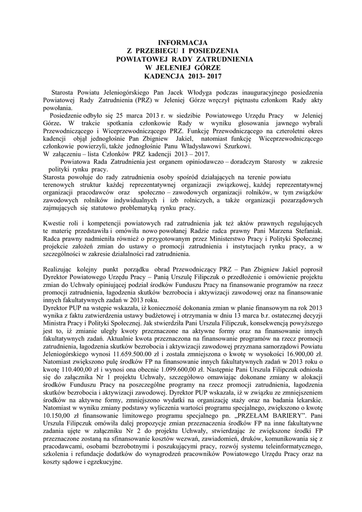 INFORMACJA Z PRZEBIEGU I POSIEDZENIA POWIATOWEJ RADY ZATRUDNIENIA W JELENIEJ GÓRZE KADENCJA 2013- 2017 Starosta Powiatu Jeleniogórskiego Pan Jacek Włodyga podczas inauguracyjnego posiedzenia Powiatowej Rady Zatrudnienia (PRZ) w Jeleniej Górze wręczył piętnastu członkom Rady akty powołania. Posiedzenie odbyło się 25 marca 2013 r. w siedzibie Powiatowego Urzędu Pracy w Jeleniej Górze. W trakcie spotkania członkowie Rady w wyniku głosowania jawnego wybrali Przewodniczącego i Wiceprzewodniczącego PRZ. Funkcję Przewodniczącego na czteroletni okres kadencji objął jednogłośnie Pan Zbigniew Jakiel, natomiast funkcję Wiceprzewodniczącego członkowie powierzyli, także jednogłośnie Panu Władysławowi Szurkowi. W załączeniu – lista Członków PRZ kadencji 2013 – 2017. Powiatowa Rada Zatrudnienia jest organem opiniodawczo – doradczym Starosty w zakresie polityki rynku pracy. Starosta powołuje do rady zatrudnienia osoby spośród działających na terenie powiatu terenowych struktur każdej reprezentatywnej organizacji związkowej, każdej reprezentatywnej organizacji pracodawców oraz społeczno – zawodowych organizacji rolników, w tym związków zawodowych rolników indywidualnych i izb rolniczych, a także organizacji pozarządowych zajmujących się statutowo problematyką rynku pracy. Kwestie roli i kompetencji powiatowych rad zatrudnienia jak też aktów prawnych regulujących te materię przedstawiła i omówiła nowo powołanej Radzie radca prawny Pani Marzena Stefaniak. Radca prawny nadmieniła również o przygotowanym przez Ministerstwo Pracy i Polityki Społecznej projekcie założeń zmian do ustawy o promocji zatrudnienia i instytucjach rynku pracy, a w szczególności w zakresie działalności rad zatrudnienia. Realizując kolejny punkt porządku obrad Przewodniczący PRZ – Pan Zbigniew Jakiel poprosił Dyrektor Powiatowego Urzędu Pracy – Panią Urszulę Filipczuk o przedłożenie i omówienie projektu zmian do Uchwały opiniującej podział środków Funduszu Pracy na finansowanie programów na rzecz promocji zatrudnienia, łagodzenia skutków bezrobocia i aktywizacji zawodowej oraz na finansowanie innych fakultatywnych zadań w 2013 roku. Dyrektor PUP na wstępie wskazała, iż konieczność dokonania zmian w planie finansowym na rok 2013 wynika z faktu zatwierdzenia ustawy budżetowej i otrzymania w dniu 13 marca b.r. ostatecznej decyzji Ministra Pracy i Polityki Społecznej. Jak stwierdziła Pani Urszula Filipczuk, konsekwencją powyższego jest to, iż zmianie uległy kwoty przeznaczone na aktywne formy oraz na finansowanie innych fakultatywnych zadań. Aktualnie kwota przeznaczona na finansowanie programów na rzecz promocji zatrudnienia, łagodzenia skutków bezrobocia i aktywizacji zawodowej przyznana samorządowi Powiatu Jeleniogórskiego wynosi 11.659.500.00 zł i została zmniejszona o kwotę w wysokości 16.900,00 zł. Natomiast zwiększono pulę środków FP na finansowanie innych fakultatywnych zadań w 2013 roku o kwotę 110.400,00 zł i wynosi ona obecnie 1.099.600,00 zł. Następnie Pani Urszula Filipczuk odniosła się do załącznika Nr 1 projektu Uchwały, szczegółowo omawiając dokonane zmiany w alokacji środków Funduszu Pracy na poszczególne programy na rzecz promocji zatrudnienia, łagodzenia skutków bezrobocia i aktywizacji zawodowej. Dyrektor PUP wskazała, iż w związku ze zmniejszeniem środków na aktywne formy, zmniejszono wydatki na organizację staży oraz na badania lekarskie. Natomiast w wyniku zmiany podstawy wyliczenia wartości programu specjalnego, zwiększono o kwotę 10.150,00 zł finansowanie limitowego programu specjalnego pn. „PRZEŁAM BARIERY”. Pani Urszula Filipczuk omówiła dalej propozycje zmian przeznaczenia środków FP na inne fakultatywne zadania ujęte w załączniku Nr 2 do projektu Uchwały, stwierdzając że zwiększone środki FP przeznaczone zostaną na sfinansowanie kosztów wezwań, zawiadomień, druków, komunikowania się z pracodawcami, osobami bezrobotnymi i poszukującymi pracy, rozwój systemu teleinformatycznego, szkolenia i refundacje dodatków do wynagrodzeń pracowników Powiatowego Urzędu Pracy oraz na koszty sądowe i egzekucyjne. Przewodniczący Rady – Pan Zbigniew Jakiel stwierdził, że Dyrektor PUP dokonała podziału środków FP, przy ich ograniczonej kwocie, dużym nakładem pracy i z rozmysłem. Trzeba jednocześnie nadmienić, że w kwocie 11.659.500,00 zł przeznaczonej na finansowanie programów na rzecz promocji zatrudnienia i instytucjach rynku pracy ujęte są środki wysokości 5.524.400,00 zł przeznaczone na realizacje Programu Operacyjnego Kapitał Ludzki i z tych pieniędzy mogą być finansowane jedynie dotacje i staże dla bezrobotnych. Stąd - jak wskazał – Przewodniczący PRZ – pojawia się taka dysproporcja jeżeli idzie o finansowanie tych dwóch instrumentów wsparcia. W trakcie obrad Rada podjęła uchwały: 1. Uchwałę Nr 3/2013 w sprawie zaopiniowania propozycji zmiany podziału środków Funduszu Pracy na finansowanie programów na rzecz promocji zatrudnienia, łagodzenia skutków bezrobocia i aktywizacji zawodowej oraz na finansowanie innych fakultatywnych zadań w 2013 roku. 2. Uchwałę Nr 4/2013 zmieniającą Uchwałę w sprawie zaopiniowania celowości realizacji programu specjalnego finansowanego z 10% limitu kwoty środków Funduszu Pracy ustalonej dla powiatu w 2013r. pn. „PRZEŁAM BARIERY”. 3. Uchwałę Nr 5/2013 w sprawie zaopiniowania celowości realizacji programu specjalnego skierowanego do osób bezrobotnych do 30 roku życia pn. „TWOJA SZANSA”. 4. Uchwałę Nr 6/2013 w sprawie zaopiniowania celowości realizacji programu specjalnego do osób bezrobotnych do 50 roku życia pn. „POSTAW NA DOŚWIADCZENIE”. 5. Uchwałę Nr 7/2013 w sprawie zaopiniowania celowości realizacji programu specjalnego skierowanego do bezrobotnych rodziców posiadających na utrzymaniu co najmniej jedno dziecko w wieku do l