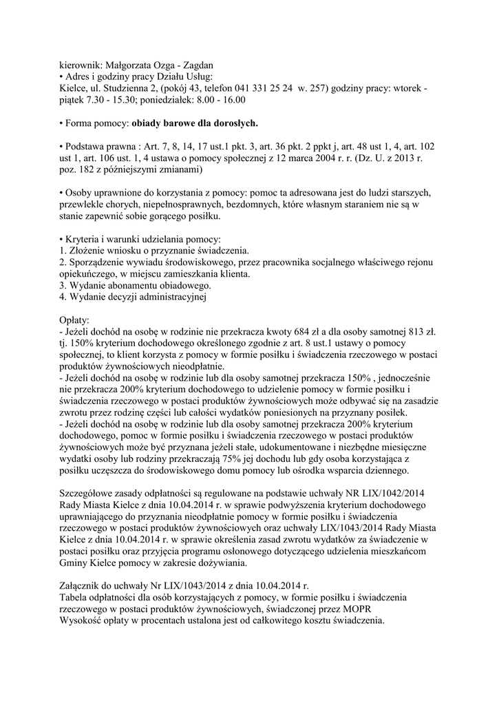 kierownik: Małgorzata Ozga - Zagdan • Adres i godziny pracy Działu Usług: Kielce, ul. Studzienna 2, (pokój 43, telefon 041 331 25 24 w. 257) godziny pracy: wtorek piątek 7.30 - 15.30; poniedziałek: 8.00 - 16.00 • Forma pomocy: obiady barowe dla dorosłych. • Podstawa prawna : Art. 7, 8, 14, 17 ust.1 pkt. 3, art. 36 pkt. 2 ppkt j, art. 48 ust 1, 4, art. 102 ust 1, art. 106 ust. 1, 4 ustawa o pomocy społecznej z 12 marca 2004 r. r. (Dz. U. z 2013 r. poz. 182 z późniejszymi zmianami) • Osoby uprawnione do korzystania z pomocy: pomoc ta adresowana jest do ludzi starszych, przewlekle chorych, niepełnosprawnych, bezdomnych, które własnym staraniem nie są w stanie zapewnić sobie gorącego posiłku. • Kryteria i warunki udzielania pomocy: 1. Złożenie wniosku o przyznanie świadczenia. 2. Sporządzenie wywiadu środowiskowego, przez pracownika socjalnego właściwego rejonu opiekuńczego, w miejscu zamieszkania klienta. 3. Wydanie abonamentu obiadowego. 4. Wydanie decyzji administracyjnej Opłaty: - Jeżeli dochód na osobę w rodzinie nie przekracza kwoty 684 zł a dla osoby samotnej 813 zł. tj. 150% kryterium dochodowego określonego zgodnie z art. 8 ust.1 ustawy o pomocy społecznej, to klient korzysta z pomocy w formie posiłku i świadczenia rzeczowego w postaci produktów żywnościowych nieodpłatnie. - Jeżeli dochód na osobę w rodzinie lub dla osoby samotnej przekracza 150% , jednocześnie nie przekracza 200% kryterium dochodowego to udzielenie pomocy w formie posiłku i świadczenia rzeczowego w postaci produktów żywnościowych może odbywać się na zasadzie zwrotu przez rodzinę części lub całości wydatków poniesionych na przyznany posiłek. - Jeżeli dochód na osobę w rodzinie lub dla osoby samotnej przekracza 200% kryterium dochodowego, pomoc w formie posiłku i świadczenia rzeczowego w postaci produktów żywnościowych może być przyznana jeżeli stałe, udokumentowane i niezbędne miesięczne wydatki osoby lub rodziny przekraczają 75% jej dochodu lub gdy osoba korzystająca z posiłku uczęszcza do środowiskowego domu pomocy lub ośrodka wsparcia dziennego. Szczegółowe zasady odpłatności są regulowane na podstawie uchwały NR LIX/1042/2014 Rady Miasta Kielce z dnia 10.04.2014 r. w sprawie podwyższenia kryterium dochodowego uprawniającego do przyznania nieodpłatnie pomocy w formie posiłku i świadczenia rzeczowego w postaci produktów żywnościowych oraz uchwały LIX/1043/2014 Rady Miasta Kielce z dnia 10.04.2014 r. w sprawie określenia zasad zwrotu wydatków za świadczenie w postaci posiłku oraz przyjęcia programu osłonowego dotyczącego udzielenia mieszkańcom Gminy Kielce pomocy w zakresie dożywiania. Załącznik do uchwały Nr LIX/1043/2014 z dnia 10.04.2014 r. Tabela odpłatności dla osób korzystających z pomocy, w formie posiłku i świadczenia rzeczowego w postaci produktów żywnościowych, świadczonej przez MOPR Wysokość opłaty w procentach ustalona jest od całkowitego kosztu świadczenia. % dochodu określonego w art.8 ust.1 ustawy o pomocy społecznej, na osobę w rodzinie wskaźnik odpłatności w % do 150% ……………………………………………………………nieodpłatnie powyżej 150% - 180% ………………………………………………40% powyżej 180% - 200% ………………………………………………70% powyżej 200% ………………………………………………………100% % dochodu określonego w art.8 ust.1 ustawy o pomocy społecznej, osoba samotnie gospodarująca wskaźnik odpłatności w % do 150% ……………………………………………………………nieodpłatnie powyżej 150% - 180% ………………………………………………30% powyżej 180% - 200% ………………………………………………60% powyżej 200% ……………………………………………………...100% • Wymagane dokumenty: 1. dowód osobisty, 2. orzeczenie komisji ds. inwalidztwa i zatrudnienia w przypadku osób, które uzyskały takie orzeczenie przed 31sierpnia `1997 r. lub – po tej dacie – decyzja organu rentowego przyznająca świadczenie z ubezpieczenia społecznego albo orzeczenie o stopniu niepełnosprawności, wydane na podstawie odrębnych przepisów, 3. zaświadczenie pracodawcy o wysokości wynagrodzenia z tytułu zatrudnienia, 4. zaświadczenie o wysokości wynagrodzenia uzyskiwanego z tytułu pracy zarobkowej na podstawie umowy ajencyjnej, umowy zlecenia, umowy o dzieło albo w okresie członkostwa w rolniczej spółdzielni produkcyjnej lub spółdzielni kółek rolniczych (usług rolniczych), 5. Odcinek renty lub emerytury za miesiąc poprzedzający złożenie wniosku 6. zaświadczenie z urzędu gminy o wielkości gospodarstwa rolnego w hektarach przeliczeniowych, 7. zaświadczenie ze szkoły o kontynuowaniu przez dziecko nauki oraz oświadczenie, że dziecko nie otrzymuje pomocy materialnej ze szkoły, 8. decyzja urzędu pracy o uznaniu lub odmowie uznania za bezrobotną, o utracie statusu osoby bezrobotnej, o przyznaniu, odmowie przyznania, wstrzymaniu, wznowieniu wypłaty oraz utracie lub pozbawieniu prawa do zasiłku, dodatku szkoleniowego, stypendium, zasiłku przedemerytalnego albo potwierdzenia z urzędu pracy, że osoba ta znajduje się w rejestrze jako osoba poszukująca pracy, 9. oświadczenie o wysokości dochodu osoby prowadzącej działalność z podaną kwotą, od której uiszczana jest składka na ubezpieczenie społeczne, 10. oświadczenie pracodawców o okresach zatrudnienia, w tym o okresach, za które były opłacane składki na ubezpieczenie społeczne oraz o okresach nieskładkowych, jeżeli dotyczy to osoby ubiegającej się o opłacanie składki na ubezpieczenie społeczne. • Tryb załatwienia sprawy: wydanie decyzji administracyjnej na czas objęcia pomocą w formie obiadów. • Tryb odwoławczy: Od decyzji przysługuje stronom odwołanie do Samorządowego Kolegium Odwoławczego za pośred