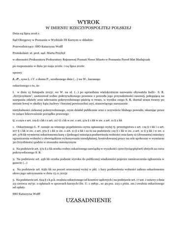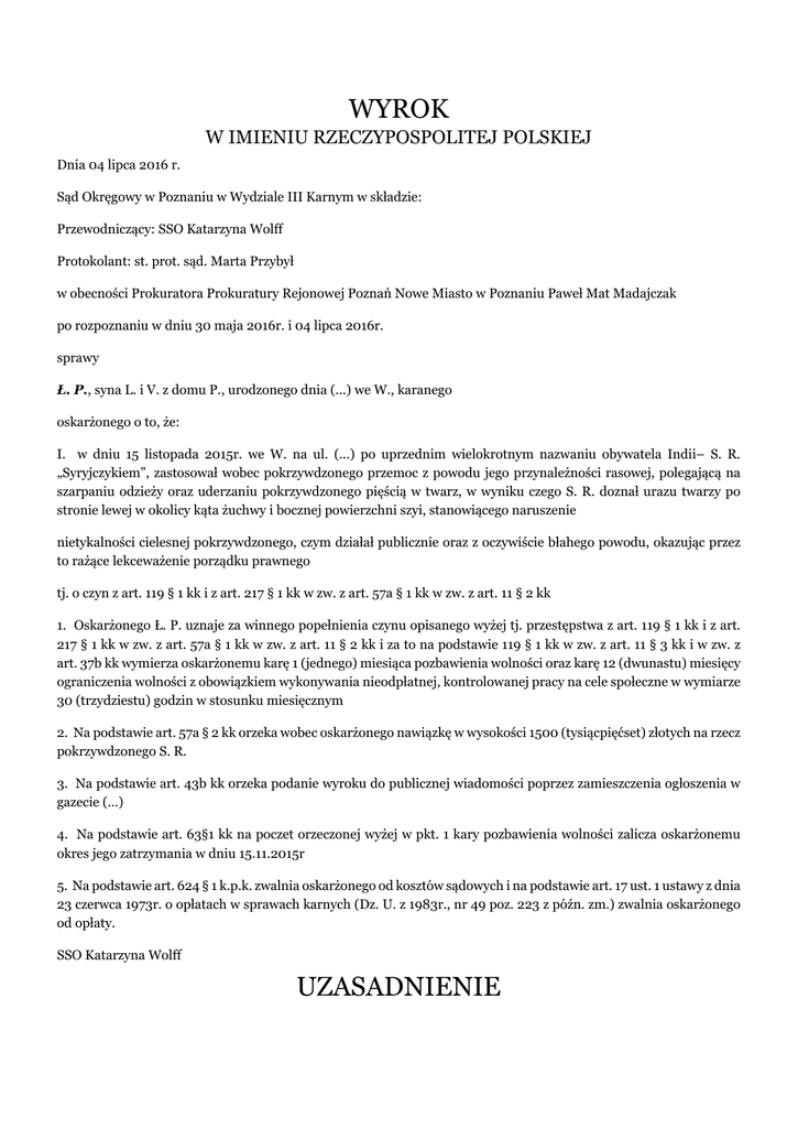WYROK W IMIENIU RZECZYPOSPOLITEJ POLSKIEJ Dnia 04 lipca 2016 r. Sąd Okręgowy w Poznaniu w Wydziale III Karnym w składzie: Przewodniczący: SSO Katarzyna Wolff Protokolant: st. prot. sąd. Marta Przybył w obecności Prokuratora Prokuratury Rejonowej Poznań Nowe Miasto w Poznaniu Paweł Mat Madajczak po rozpoznaniu w dniu 30 maja 2016r. i 04 lipca 2016r. sprawy Ł. P., syna L. i V. z domu P., urodzonego dnia (...) we W., karanego oskarżonego o to, że: I. w dniu 15 listopada 2015r. we W. na ul. (...) po uprzednim wielokrotnym nazwaniu obywatela Indii– S. R. „Syryjczykiem”, zastosował wobec pokrzywdzonego przemoc z powodu jego przynależności rasowej, polegającą na szarpaniu odzieży oraz uderzaniu pokrzywdzonego pięścią w twarz, w wyniku czego S. R. doznał urazu twarzy po stronie lewej w okolicy kąta żuchwy i bocznej powierzchni szyi, stanowiącego naruszenie nietykalności cielesnej pokrzywdzonego, czym działał publicznie oraz z oczywiście błahego powodu, okazując przez to rażące lekceważenie porządku prawnego tj. o czyn z art. 119 § 1 kk i z art. 217 § 1 kk w zw. z art. 57a § 1 kk w zw. z art. 11 § 2 kk 1. Oskarżonego Ł. P. uznaje za winnego popełnienia czynu opisanego wyżej tj. przestępstwa z art. 119 § 1 kk i z art. 217 § 1 kk w zw. z art. 57a § 1 kk w zw. z art. 11 § 2 kk i za to na podstawie 119 § 1 kk w zw. z art. 11 § 3 kk i w zw. z art. 37b kk wymierza oskarżonemu karę 1 (jednego) miesiąca pozbawienia wolności oraz karę 12 (dwunastu) miesięcy ograniczenia wolności z obowiązkiem wykonywania nieodpłatnej, kontrolowanej pracy na cele społeczne w wymiarze 30 (trzydziestu) godzin w stosunku miesięcznym 2. Na podstawie art. 57a § 2 kk orzeka wobec oskarżonego nawiązkę w wysokości 1500 (tysiącpięćset) złotych na rzecz pokrzywdzonego S. R. 3. Na podstawie art. 43b kk orzeka podanie wyroku do publicznej wiadomości poprzez zamieszczenia ogłoszenia w gazecie (...) 4. Na podstawie art. 63§1 kk na poczet orzeczonej wyżej w pkt. 1 kary pozbawienia wolności zalicza oskarżonemu okres jego zatrzymania w dniu 15.11.2015r 5. Na podstawie art. 624 § 1 k.p.k. zwalnia oskarżonego od kosztów sądowych i na podstawie art. 17 ust. 1 ustawy z dnia 23 czerwca 1973r. o opłatach w sprawach karnych (Dz. U. z 1983r., nr 49 poz. 223 z późn. zm.) zwalnia oskarżonego od opłaty. SSO Katarzyna Wolff UZASADNIENIE W sprawie przeciwko Ł. P. Sąd ustalił następujący stan faktyczny: S. R. i jego żona H. J. są obywatelami Indii. Oboje w 2015 r. mieszkali we W.. S. R. podjął tam pracę zarobkową. Dnia 13 listopada 2015 r. doszło do serii zamachów terrorystycznych w Paryżu. Zginęło 130 osób. Zdarzenie było szeroko nagłaśniane w środkach masowego przekazu. Dnia 15 listopada 2015 r. S. R. i H. J. wyszli wieczorem ze swojego mieszkania we W.. Udali się na spacer po mieście. Około godziny 20:00 przechodzili oboje w okolicy Banku (...) przy ul. (...). Po drugiej stronie ulicy stali Ł. P. oraz dwóch jego znajomych. Ł. P. zaczął pod adresem S. R. wykrzykiwać wielokrotnie m. in. słowo „Syryjczyk”. Następnie oskarżony przeszedł przez ulicę w kierunku S. R. i H. J.. Chwycił S. R. za kurtkę i szarpał go nie przestając kierować pod jego adresem obelżywych słów, z których pokrzywdzony zrozumiał jedynie wulgaryzmy i słowo: „Syryjczyk”. Ł. P. następnie uderzył pokrzywdzonego pięścią w okolice lewego ucha. S. R. zdołał oswobodzić się z uchwytu Ł. P., po czym go odepchnął. Pozostali dwaj mężczyźni w trakcie całego zdarzenia stali po przeciwległej stronie ulicy. Kiedy S. R. oswobodził się z uchwytu Ł. P. jeden z mężczyzn krzyknął do Ł. P., żeby do nich wrócił. Ł. P. zastosował się do tego. W trakcie całego zdarzenia S. R. i H. J. nie zachowywali się w jakikolwiek sposób agresywnie. S. R. próbował Ł. P. po angielsku wytłumaczyć, że nie są Syryjczykami, lecz Hindusami. Niezwłocznie po zdarzeniu S. R. i H. J. udali się do Komendy Powiatowej Policji we W.. Opisali funkcjonariuszom, że zostali zaatakowani. Celem ustalenia sprawcy S. R. i H. J. zostali zawiezieni przez funkcjonariuszy J. W. i D. P. na ulicę (...). Przed sklepem monopolowym S. R. i H. J. rozpoznali w oskarżonym mężczyznę, który ich zaatakował. Kiedy funkcjonariusze Policji podeszli do Ł. P. zaczął uciekać. Został jednak zatrzymany po krótkim pościgu. Na skutek działań Ł. P. S. R. doznał urazu twarzy po stronie lewej w okolicy kąta żuchwy i bocznej powierzchni szyi. Przed zaatakowaniem S. R. i H. J. Ł. P. pił wódkę. W wyniku badania zawartości alkoholu w wydychanym powietrzu alkomat wykazał o godzinie 20:59 dnia 15 listopada 2015 r. u Ł. P. stężenie alkoholu w wydychanym powietrzu o wartości 0,78 mg/dm3. W kolejnym badaniu alkomatem uzyskano u Ł. P. o godzinie 21:14 wartość 0,80 mg/dm3 alkoholu w wydychanym powietrzu. Dnia 16 listopada 2015 r. o godzinie 11:30 w badaniu alkomatem Ł. P. uzyskano wynik 0,00 mg/dm3 alkoholu w wydychanym powietrzu. W przeszłości Ł. P. był karany za przestępstwa: I. wyrokiem Sądu Rejonowego w Słupcy z dnia 11 marca 2010 r. o sygn. akt II K 68/10 za czyn z art. 178a § 1 k.k. na karę 12 miesięcy ograniczenia wolności ze zobowiązaniem do 24 godzin miesięcznie nieodpłatnej kontrolowanej pracy na cele społeczne oraz zastosowano wobec niego środek karny w postaci 1 roku zakazu prowadzenia pojazdów mechanicznych kat. B, a nadto świadczenie pieniężne w kwocie 200 zł.; II. wyrokiem Sądu Rejonowego we Wrześni z dnia 16 września 2010 r. o sygn.. akt II K 481/10 za czyn z art. 278 § 1 k.k. na karę 120 stawek dziennych grzywny po 20 zł każda; III. wyrokiem Sądu Rejonowego we Wrześni z dnia 08 listopada 2012 r. o sygn. akt II K 693/12 za czyn z art. 284 § 2 k.k. na karę 12 miesięcy ograniczenia wolności, która została postanowieniem z dnia 22 maja 2013 r. zamieniona na karę zastępczą 164 dni pozbawienia wolności, a do kt