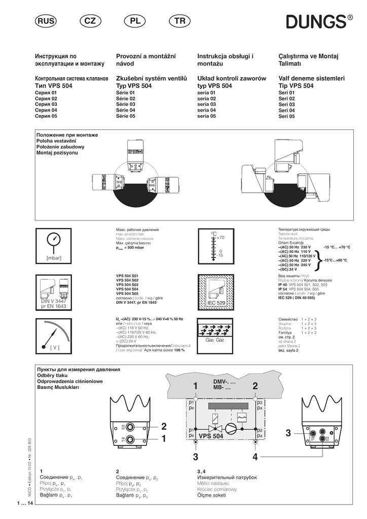 3/ &= 586 75 Инструкция по эксплуатации и монтажу Provozní a montážní návod Instrukcja obsługi i montażu Çal∂µt∂rma ve Montaj Talimat∂ Контрольная система клапанов Тип VPS 504 Zkušební systém ventilů Typ VPS 504 Układ kontroli zaworów typ VPS 504 Valf deneme sistemleri Tip VPS 504 Série 01 Série 02 Série 03 Série 04 Série 05 seria 01 seria 02 seria 03 seria 04 seria 05 Seri 01 Seri 02 Seri 03 Seri 04 Seri 05 Серия 01 Серия 02 Серия 03 Серия 04 Серия 05 Положение при монтаже Poloha vestavění Położenie zabudowy Montaj pozisyonu 6LFKHUXQJHLQJHEDXWDXVZHFKVHOEDU )XVHEXLOWLQWRKRXVLQJH[FKDQJHDEOH )XVLELOHLQWHJUpGDQVODFRXYHUFOHGXERvWLHU LQWHUFKDQJHDEOH 7\S7\SH7\SH7LSR7$ %HWULHEVDQOHLWXQJEHDFKWHQ 3OHDVHFRPSO\ZLWKWKHRSHUDWLQJLQVWUXFWLRQV 6XLYUHOHVLQVWUXFWLRQVGHODQRWLFHG XWLOLVDWLRQ 6HJXLUHOHLVWUX]LRQL SD SH %HWULHEVDQOHLWXQJEHDFKWHQ 3OHDVHFRPSO\ZLWKWKHRSHUDWLQJLQVWUXFWLRQV 6XLYUHOHVLQVWUXFWLRQVGHODQRWLFHG XWLOLVDWLRQ 6HJXLUHOHLVWUX]LRQL 6LFKHUXQJHLQJHEDXWDXVZHFKVHOEDU )XVHEXLOWLQWRKRXVLQJH[FKDQJHDEOH )XVLELOHLQWHJUpGDQVODFRXYHUFOHGXERvWLHU LQWHUFKDQJHDEOH 7\S7\SH7\SH7LSR7$ %HWULHEVDQOHLWXQJEHDFKWHQ 3OHDVHFRPSO\ZLWKWKHRSHUDWLQJLQVWUXFWLRQV 6XLYUHOHVLQVWUXFWLRQVGHODQRWLFHG XWLOLVDWLRQ 6HJXLUHOHLVWUX]LRQL SD 7\S7\SH7\SH7LSR7$ SD SH 6LFKHUXQJHLQJHEDXWDXVZHFKVHOEDU )XVHEXLOWLQWRKRXVLQJH[FKDQJHDEOH )XVLELOHLQWHJUpGDQVODFRXYHUFOHGXERvWLHU LQWHUFKDQJHDEOH SH Макс. рабочее давление max. provozní tlak Maks. ciśnienie robocze Max. çal∂µma bas∂nc∂ pmax. = 500 mbar +70 0 -15 [mbar] 6LFKHUXQJHLQJHEDXWDXVZHFKVHOEDU )XVHEXLOWLQWRKRXVLQJH[FKDQJHDEOH )XVLELOHLQWHJUpGDQVODFRXYHUFOHGXERvWLHU LQWHUFKDQJHDEOH 7\S7\SH7\SH7LSR7$ %HWULHEVDQOHLWXQJEHDFKWHQ 3OHDVHFRPSO\ZLWKWKHRSHUDWLQJLQVWUXFWLRQV 6XLYUHOHVLQVWUXFWLRQVGHODQRWLFHG XWLOLVDWLRQ 6HJXLUHOHLVWUX]LRQL SH SD DIN V 3447 pr EN 1643 [V] M/CD • Edition 10.02 • Nr. 228 903 « IEC 529 8Qa$&9«9+] или / nebo / lub / veya ~(AC) 110 V 50 Hz, ~(AC) 110/120 V 60 Hz, ~(AC) 220 V 60 Hz, = (DC) 24 V Продолжительность включения/Doba zapnutí / czas włączenia/ Aç∂k kalma süresi Пункты для измерения давления Odběry tlaku Odprowadzenia ciśnieniowe Bas∂nç Musluklar∂ SH S Gas Gaz Соединение pa, p2 Přípoj pa, p2 Przyłącze pa, p2 Baπlant∂ pa, p2 '09« 0%« S SH S SD S SH 936 S SD Соединение pe , p1 Přípoj pe , p1 Przyłącze pe, p1 Baπlant∂ pe , p1 Семейство 1 + 2 + 3 Skupina 1+2+3 Rodzina 1+2+3 Familya 1+2+3 см. стp. 2 viz strana 2 patrz Strona 2 bkz. sayfa 2 ➞➞➞➞ ➞➞ ➞➞ ➞➞ ➞ ➞ ` Вид защиты / Krytí Rodzaj ochrony/ Koruma derecesi ,3: VPS 504 S01, S02, S03 ,3: VPS 504 S04, S05 согласно / podle / wg / göre ,(&',1 9366 9366 9366 9366 9366 согласно / podle / wg / göre ',19SU(1 SD S Температура окружающей среды Teplota okolí Temperatura otoczenia Ortam S∂cakl∂π∂ a$&+]9 &«& a$&+]9 a$&+]9 &«& a$&+]9 a$&+]9 a'&9 °C Измерительный патрубок Měřicí nástavec Króciec pomiarowy Ölçme soketi SH S SD S Пpедупpеждающие указания стpого соблюдать Varovné pokyny bezpodmínečně dodržovat Wskazówki ostrzegawcze obowiązuje bezwzględne przestrzeganie ∑kaz bilgileri Kesinlikle dikkat edilmelidir Использование для семейства газов 1, 2, 3 Použití pro řadu 1, 2, 3 Zastosowanie dla rodziny gazów 1, 2, 3 1, 2, 3 gaz grubu (ailesi) için uygulama Мы pекомендуем пpоводить ежегодную пpовеpку устpойства VPS 504, пpи повышенном загpязнении – пpоводить пpовеpку каждые полгода. • Пpовеpка газовых соединений p1/p2 (VPS/аpматуpа) • Пpовеpка внутpенних VPSфильтpов p1/p2 (комплект запасных частей 243 801) • Пpовести испытание на геpметичность: Повышение давления на измеpительном патpубке p2, напpимеp, с помощью pучного насоса • Пpовести пpовеpку pаботы в соответствие с инстpукцией по эксплуатации и монтажу Doporučujeme roční přezkoušení VPS 504, při zvýšeném výskytu nečistot půlroční přezkoušení. Zalecamy wykonywanie corocznych przeglądów VPS 504, w przypadku zwiększonego zanieczyszczenia przeglądy co pół roku. • Sprawdzenie przyłączy gazowych p1/p2 (VPS/Armatura) • Sprawdzenie wewnętrznego filtra VPS p1/p2 (zestaw naprawczy nr 243 801) • Wykonać próbę szczelności: zwiększenie ciśnienia na króćcu pomiarowym p2 np. przy pomocy pompki ręcznej • Wykonać próbę działania zgodnie z instrukcją użytkowania i montażu VPS 504 için y∂ll∂k kontrol öneriyoruz; fazla pislenme durumunda kontrol yar∂m y∂lda bir yap∂lmal∂d∂r. • Kontrol p1/p2 gaz baπlant∂lar∂ (VPS / Armatür) • Dahili VPS filresinin p1/p2 kontrolü (yedek set no. 243 801) • S∂zd∂rmazl∂k kontrolü yap∂lmal∂d∂r: Druckerhöhung am p2 ölçme soketinde bas∂nç yükseltme, örn. el pompas∂ ile • ∑µletme ve montaj k∂lavuzuna göre fonksiyon kontrolü yap∂lmal∂d∂r • Zkouška tlakových přípojů p1/p2 (VPS/armatura) • Zkouška interních VPS filtrů p1/p2 (náhradní sada č. 243 801) • Provést zkoušku těsnosti: zvýšení tlaku na měřicím nástavci p2, např. pomocí ručního čerpadla • Provést funkční zkoušku příslušně podle provozního a montážního návodu Забитые VPS-фильтpы или закpытые газовые подключения могут пpиводить к ошибочному положительному pезультату, хот