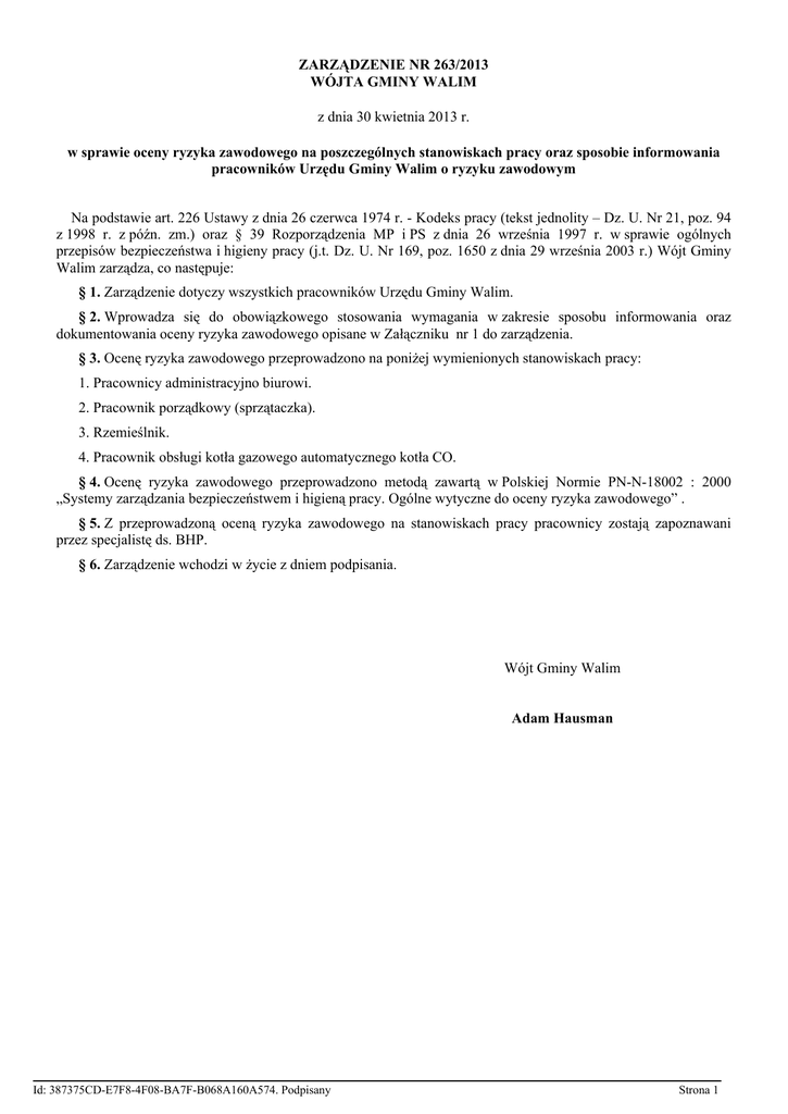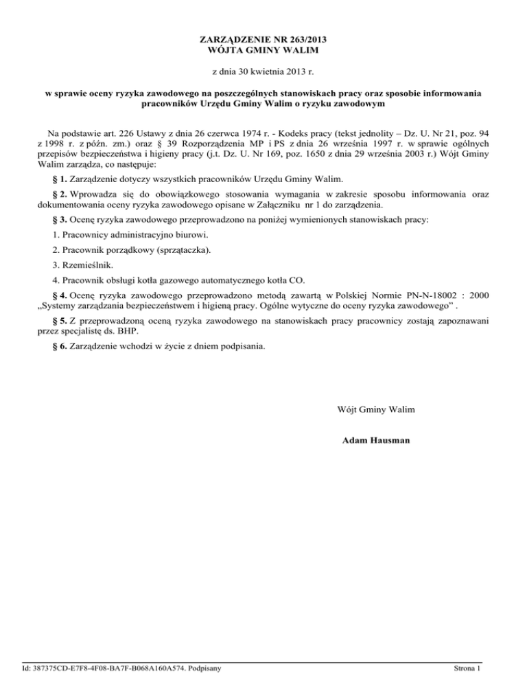 ZARZĄDZENIE NR 263/2013 WÓJTA GMINY WALIM z dnia 30 kwietnia 2013 r. w sprawie oceny ryzyka zawodowego na poszczególnych stanowiskach pracy oraz sposobie informowania pracowników Urzędu Gminy Walim o ryzyku zawodowym Na podstawie art. 226 Ustawy z dnia 26 czerwca 1974 r. - Kodeks pracy (tekst jednolity – Dz. U. Nr 21, poz. 94 z 1998 r. z późn. zm.) oraz § 39 Rozporządzenia MP i PS z dnia 26 września 1997 r. w sprawie ogólnych przepisów bezpieczeństwa i higieny pracy (j.t. Dz. U. Nr 169, poz. 1650 z dnia 29 września 2003 r.) Wójt Gminy Walim zarządza, co następuje: § 1. Zarządzenie dotyczy wszystkich pracowników Urzędu Gminy Walim. § 2. Wprowadza się do obowiązkowego stosowania wymagania w zakresie sposobu informowania oraz dokumentowania oceny ryzyka zawodowego opisane w Załączniku nr 1 do zarządzenia. § 3. Ocenę ryzyka zawodowego przeprowadzono na poniżej wymienionych stanowiskach pracy: 1. Pracownicy administracyjno biurowi. 2. Pracownik porządkowy (sprzątaczka). 3. Rzemieślnik. 4. Pracownik obsługi kotła gazowego automatycznego kotła CO. § 4. Ocenę ryzyka zawodowego przeprowadzono metodą zawartą w Polskiej Normie PN-N-18002 : 2000 „Systemy zarządzania bezpieczeństwem i higieną pracy. Ogólne wytyczne do oceny ryzyka zawodowego” . § 5. Z przeprowadzoną oceną ryzyka zawodowego na stanowiskach pracy pracownicy zostają zapoznawani przez specjalistę ds. BHP. § 6. Zarządzenie wchodzi w życie z dniem podpisania. Wójt Gminy Walim Adam Hausman Id: 387375CD-E7F8-4F08-BA7F-B068A160A574. Podpisany Strona 1 Załącznik Nr 1 do Zarządzenia Nr 263/2013 Wójta Gminy Walim z dnia 30 kwietnia 2013r OCENA RYZYKA ZAWODOWEGO W URZĘDZIE GMINY WALIM Ocenę ryzyka zawodowego opracował zespół: Renata Świerszczak Maria Panek - specjalista ds. BHP przedstawiciel pracowników UG Walim Zatwierdził: Adam Hausman - Wójt Gminy Walim ……………………………………. Id: 387375CD-E7F8-4F08-BA7F-B068A160A574. Podpisany Strona 2 Przy wykonywaniu oceny ryzyka na stanowiskach pracy korzystano z następującej bibliografii: - Rozporządzenie MPiPS z 26.09.1997r w sprawie ogólnych przepisów bhp (Dz. U. z 2003r Nr 169, poz. 1650 z późn. zm). - Rozporządzenie MPiPS z dnia 1 grudnia 1998r w sprawie bezpieczeństwa i higieny pracy na stanowiskach wyposaŜonych w monitory ekranowe (Dz.U.Nr 148, poz.973). - Rozporządzenie MZiOS z 30.05.1996r w sprawie przeprowadzania badań lekarskich pracowników, zakresu profilaktycznej opieki zdrowotnej nad pracownikami oraz orzeczeń lekarskich wydawanych do celów przewidzianych w Kodeksie Pracy (Dz. U. Nr 69, poz.332). - Rozporządzenie Rady Ministrów z dnia 10.09.1996r w sprawie wykazu prac szczególnie uciąŜliwych lub szkodliwych dla zdrowia kobiet (Dz. U. z 1996r Nr 114, poz.545, Dz. U. z 2002r Nr 127 poz.1092) - Rozporządzenie Ministra Gospodarki z 18.11.2002r w sprawie minimalnych wymagań bhp w zakresie uŜytkowania maszyn przez pracowników podczas pracy ( Dz. U. z 2002r Nr 191, poz. 1596 z późn. zm.). - Rozporządzenie MPiPS z dnia 29.11.2002r w sprawie najwyŜszych dopuszczalnych stęŜeń i natęŜeń czynników szkodliwych dla zdrowia w środowisku pracy (Dz. U z 2002r Nr 217, poz.1833 z późn. zm.). - Rozporządzenie Ministra Gospodarki i Pracy z dnia 05.08.2005r w sprawie bezpieczeństwa i higieny pracy przy pracach związanych z naraŜeniem na hałas lub drgania mechaniczne (Dz. U. z 2005r Nr 157, poz.1318). - PN-N-18002:2000 Systemy zarządzania bezpieczeństwem i higiena pracy. Ogólne wytyczne do oceny ryzyka zawodowego. Uwagi: Brak lub niestosowanie zabezpieczeń powoduje podwyższenie kategorii ryzyka, tzn. zwiększa prawdopodobieństwo zaistnienia wypadku, choroby. Id: 387375CD-E7F8-4F08-BA7F-B068A160A574. Podpisany Strona 3 WYKAZ STANOWISK NA , KTÓRYCH DOKONANO OCENY RYZYKA ZAWODOWEGO Lp. STANOWISKO 1. pracownik administracyjno - biurowy 2. pracownik porządkowy (sprzątaczka) 3. rzemieślnik 4. pracownik obsługi kotła gazowego automatycznego CO Id: 387375CD-E7F8-4F08-BA7F-B068A160A574. Podpisany Strona 4 1. CEL PROCEDURY OCENY RYZKA ZAWODOWEGO Celem procedury oceny ryzyka zawodowego jest ustalenie reguł postępowania przy zarządzaniu ryzykiem zawodowym w Urzędzie Gminy Walim ,58-320 Walim, ul. Boczna 9. Cel oceny ryzyka zawodowego na stanowisku pracy określa druga część § 39 Rozporządzenia Ministra Pracy i Polityki Socjalnej z dnia 26 września 1997r w sprawie ogólnych przepisów bezpieczeństwa i higieny pracy oraz polska norma PN-N-18002:2000 „Systemy zarządzania bezpieczeństwem i higieną pracy. Ogólne wytyczne do oceny ryzyka zawodowego”. Przeprowadzanie oceny ryzyka zawodowego ma na celu: - sprawdzenie, czy występujące na stanowiskach pracy zagroŜenia zidentyfikowane i czy jest znane związane z nimi ryzyko zawodowe, - wykazanie, zarówno pracownikom lub ich przedstawicielom, jak i organom nadzoru i kontroli, Ŝe przeprowadzono analizę zagroŜeń i zastosowano właściwe środki ochronne, - dokonanie odpowiedniego wyboru wyposaŜenia stanowisk pracy, materiałów oraz organizacji pracy, - ustalenie priorytetów w działaniach zmierzających do eliminowania lub ograniczenia ryzyka zawodowego, - zapewnienie ciągłej poprawy bezpieczeństwa i higieny pracy. Id: 387375CD-E7F8-4F08-BA7F-B068A160A574. Podpisany Strona 5 2. ZAKRES OBOWIĄZYWANIA PROCEDURY OCENY RYZYKA ZAWODOWEGO Procedura obowiązuje w Urzędzie Gminy Walim w odniesieniu do wszystkich zatrudnionych pracowników. 3. WYBÓR I UZASADNIENIE WYBORU METODY OCENY RYZYKA Ocenę ryzyka zawodowego dokonano wg normy PN-N-18002 „Systemy zarządzania bezpieczeństwem i higieną pracy. Ogólne wytyczne do oceny ryzyka zawodowego” związanej z oddziaływaniem czynników szkodliwych. Przy ocenie ryzyka związanego z oddziaływaniem czynników niemierzalnych, tzn. takich, których wielkość oddziaływania nie moŜna odnieść do określonych w normach lub przepisach wartości, do ich identyfikacji stosu