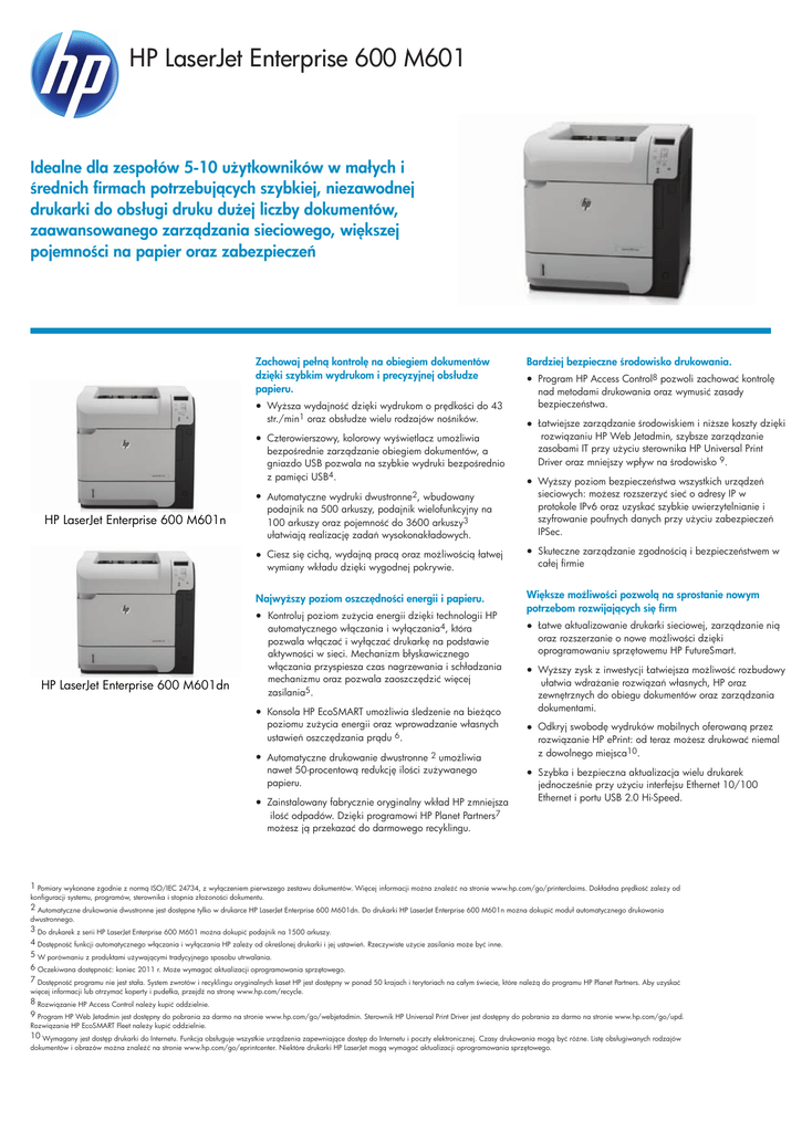 HP LaserJet Enterprise 600 M601 Idealne dla zespołów 5-10 użytkowników w małych i średnich firmach potrzebujących szybkiej, niezawodnej drukarki do obsługi druku dużej liczby dokumentów, zaawansowanego zarządzania sieciowego, większej pojemności na papier oraz zabezpieczeń Zachowaj pełną kontrolę na obiegiem dokumentów dzięki szybkim wydrukom i precyzyjnej obsłudze papieru. ● Wyższa wydajność dzięki wydrukom o prędkości do 43 str./min1 oraz obsłudze wielu rodzajów nośników. ● Czterowierszowy, kolorowy wyświetlacz umożliwia bezpośrednie zarządzanie obiegiem dokumentów, a gniazdo USB pozwala na szybkie wydruki bezpośrednio z pamięci USB4. HP LaserJet Enterprise 600 M601n HP LaserJet Enterprise 600 M601dn Bardziej bezpieczne środowisko drukowania. ● Program HP Access Control8 pozwoli zachować kontrolę nad metodami drukowania oraz wymusić zasady bezpieczeństwa. ● Łatwiejsze zarządzanie środowiskiem i niższe koszty dzięki rozwiązaniu HP Web Jetadmin, szybsze zarządzanie zasobami IT przy użyciu sterownika HP Universal Print Driver oraz mniejszy wpływ na środowisko 9. ● Automatyczne wydruki dwustronne2, wbudowany podajnik na 500 arkuszy, podajnik wielofunkcyjny na 100 arkuszy oraz pojemność do 3600 arkuszy3 ułatwiają realizację zadań wysokonakładowych. ● Wyższy poziom bezpieczeństwa wszystkich urządzeń sieciowych: możesz rozszerzyć sieć o adresy IP w protokole IPv6 oraz uzyskać szybkie uwierzytelnianie i szyfrowanie poufnych danych przy użyciu zabezpieczeń IPSec. ● Ciesz się cichą, wydajną pracą oraz możliwością łatwej wymiany wkładu dzięki wygodnej pokrywie. ● Skuteczne zarządzanie zgodnością i bezpieczeństwem w całej firmie Najwyższy poziom oszczędności energii i papieru. Większe możliwości pozwolą na sprostanie nowym potrzebom rozwijających się firm ● Kontroluj poziom zużycia energii dzięki technologii HP automatycznego włączania i wyłączania4, która pozwala włączać i wyłączać drukarkę na podstawie aktywności w sieci. Mechanizm błyskawicznego włączania przyspiesza czas nagrzewania i schładzania mechanizmu oraz pozwala zaoszczędzić więcej zasilania5. ● Konsola HP EcoSMART umożliwia śledzenie na bieżąco poziomu zużycia energii oraz wprowadzanie własnych ustawień oszczędzania prądu 6. ● Automatyczne drukowanie dwustronne 2 umożliwia nawet 50-procentową redukcję ilości zużywanego papieru. ● Zainstalowany fabrycznie oryginalny wkład HP zmniejsza ilość odpadów. Dzięki programowi HP Planet Partners7 możesz ją przekazać do darmowego recyklingu. ● Łatwe aktualizowanie drukarki sieciowej, zarządzanie nią oraz rozszerzanie o nowe możliwości dzięki oprogramowaniu sprzętowemu HP FutureSmart. ● Wyższy zysk z inwestycji Łatwiejsza możliwość rozbudowy ułatwia wdrażanie rozwiązań własnych, HP oraz zewnętrznych do obiegu dokumentów oraz zarządzania dokumentami. ● Odkryj swobodę wydruków mobilnych oferowaną przez rozwiązanie HP ePrint: od teraz możesz drukować niemal z dowolnego miejsca10. ● Szybka i bezpieczna aktualizacja wielu drukarek jednocześnie przy użyciu interfejsu Ethernet 10/100 Ethernet i portu USB 2.0 Hi-Speed. 1 Pomiary wykonane zgodnie z normą ISO/IEC 24734, z wyłączeniem pierwszego zestawu dokumentów. Więcej informacji można znaleźć na stronie www.hp.com/go/printerclaims. Dokładna prędkość zależy od konfiguracji systemu, programów, sterownika i stopnia złożoności dokumentu. 2 Automatyczne drukowanie dwustronne jest dostępne tylko w drukarce HP LaserJet Enterprise 600 M601dn. Do drukarki HP LaserJet Enterprise 600 M601n można dokupić moduł automatycznego drukowania dwustronnego. 3 Do drukarek z serii HP LaserJet Enterprise 600 M601 można dokupić podajnik na 1500 arkuszy. 4 Dostępność funkcji automatycznego włączania i wyłączania HP zależy od określonej drukarki i jej ustawień. Rzeczywiste użycie zasilania może być inne. 5 W porównaniu z produktami używającymi tradycyjnego sposobu utrwalania. 6 Oczekiwana dostępność: koniec 2011 r. Może wymagać aktualizacji oprogramowania sprzętowego. 7 Dostępność programu nie jest stała. System zwrotów i recyklingu oryginalnych kaset HP jest dostępny w ponad 50 krajach i terytoriach na całym świecie, które należą do programu HP Planet Partners. Aby uzyskać więcej informacji lub otrzymać koperty i pudełka, przejdź na stronę www.hp.com/recycle. 8 Rozwiązanie HP Access Control należy kupić oddzielnie. 9 Program HP Web Jetadmin jest dostępny do pobrania za darmo na stronie www.hp.com/go/webjetadmin. Sterownik HP Universal Print Driver jest dostępny do pobrania za darmo na stronie www.hp.com/go/upd. Rozwiązanie HP EcoSMART Fleet należy kupić oddzielnie. 10 Wymagany jest dostęp drukarki do Internetu. Funkcja obsługuje wszystkie urządzenia zapewniające dostęp do Internetu i poczty elektronicznej. Czasy drukowania mogą być różne. Listę obsługiwanych rodzajów dokumentów i obrazów można znaleźć na stronie www.hp.com/go/eprintcenter. Niektóre drukarki HP LaserJet mogą wymagać aktualizacji oprogramowania sprzętowego. Przegląd produktu HP LaserJet Enterprise 600 M601dn: 1. Intuicyjny 4-wierszowy wyświetlacz kolorowy 2. Przedni port USB 3. Wbudowany moduł automatycznego druku dwustronnego 4. Wygodny przedni wyłącznik 5. Odbiornik na 500 arkuszy 6. Pojedyncza pokrywa dostępu do uniwersalnego wkładu z tonerem 7. Podajnik uniwersalny 1 na 100 arkuszy obsługuje nośniki typu bond o gramaturze do 200 g/m² 8. Podajnik 2 na 500 arkuszy pozwalają osiągnąć łączną pojemność 600 arkuszy 9. Przy użyciu osadzonego serwera druku HP Jetdirect 10/100/1000Base-TX Ethernet 10. Łącznie 512 MB pamięci i procesor o szybkości 800 MHz pozwalają na szybką obsługę skomplikowanych zadań wydruku 11. Port Hi-Speed USB 2.0 Krótka charakterystyka HP LaserJet Enterprise 600 M601n HP LaserJet Ent