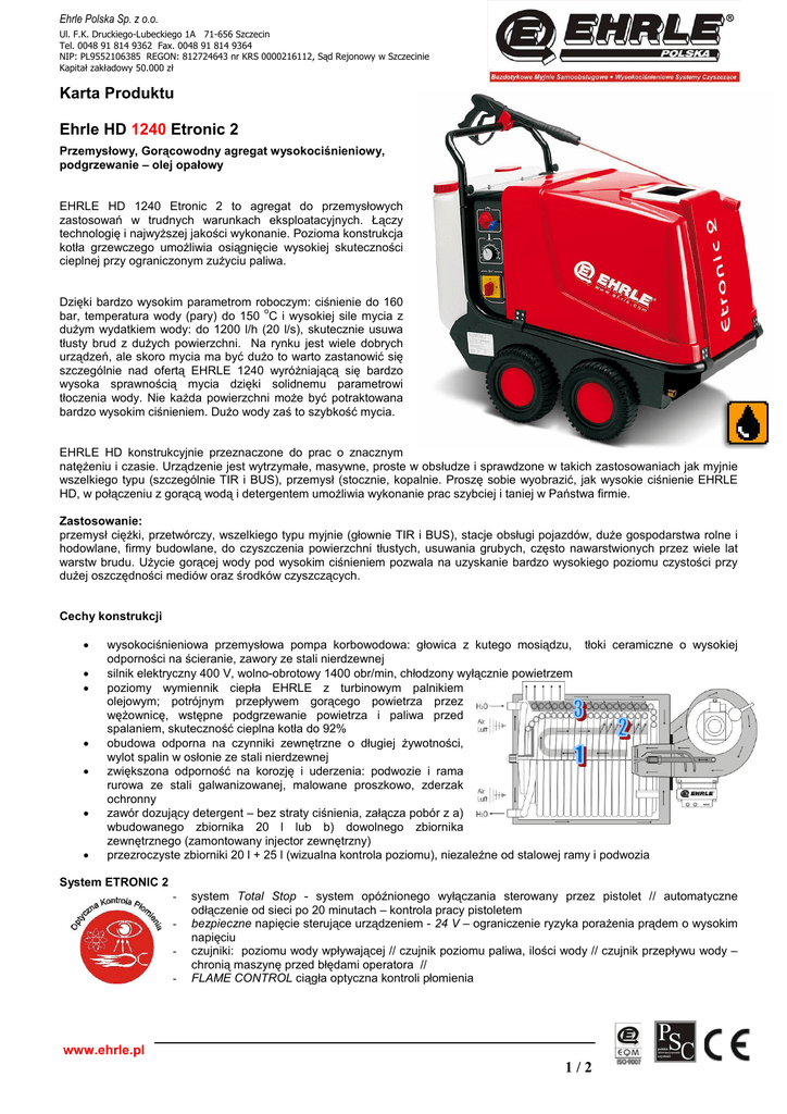 Ehrle Polska Sp. z o.o. Ul. F.K. Druckiego-Lubeckiego 1A 71-656 Szczecin Tel. 0048 91 814 9362 Fax. 0048 91 814 9364 NIP: PL9552106385 REGON: 812724643 nr KRS 0000216112, Sąd Rejonowy w Szczecinie Kapitał zakładowy 50.000 zł Karta Produktu Ehrle HD 1240 Etronic 2 Przemysłowy, Gorącowodny agregat wysokociśnieniowy, podgrzewanie – olej opałowy EHRLE HD 1240 Etronic 2 to agregat do przemysłowych zastosowań w trudnych warunkach eksploatacyjnych. Łączy technologię i najwyŜszej jakości wykonanie. Pozioma konstrukcja kotła grzewczego umoŜliwia osiągnięcie wysokiej skuteczności cieplnej przy ograniczonym zuŜyciu paliwa. Dzięki bardzo wysokim parametrom roboczym: ciśnienie do 160 o bar, temperatura wody (pary) do 150 C i wysokiej sile mycia z duŜym wydatkiem wody: do 1200 l/h (20 l/s), skutecznie usuwa tłusty brud z duŜych powierzchni. Na rynku jest wiele dobrych urządzeń, ale skoro mycia ma być duŜo to warto zastanowić się szczególnie nad ofertą EHRLE 1240 wyróŜniającą się bardzo wysoka sprawnością mycia dzięki solidnemu parametrowi tłoczenia wody. Nie kaŜda powierzchni moŜe być potraktowana bardzo wysokim ciśnieniem. DuŜo wody zaś to szybkość mycia. EHRLE HD konstrukcyjnie przeznaczone do prac o znacznym natęŜeniu i czasie. Urządzenie jest wytrzymałe, masywne, proste w obsłudze i sprawdzone w takich zastosowaniach jak myjnie wszelkiego typu (szczególnie TIR i BUS), przemysł (stocznie, kopalnie. Proszę sobie wyobrazić, jak wysokie ciśnienie EHRLE HD, w połączeniu z gorącą wodą i detergentem umoŜliwia wykonanie prac szybciej i taniej w Państwa firmie. Zastosowanie: przemysł cięŜki, przetwórczy, wszelkiego typu myjnie (głownie TIR i BUS), stacje obsługi pojazdów, duŜe gospodarstwa rolne i hodowlane, firmy budowlane, do czyszczenia powierzchni tłustych, usuwania grubych, często nawarstwionych przez wiele lat warstw brudu. UŜycie gorącej wody pod wysokim ciśnieniem pozwala na uzyskanie bardzo wysokiego poziomu czystości przy duŜej oszczędności mediów oraz środków czyszczących. Cechy konstrukcji • • • • • • • wysokociśnieniowa przemysłowa pompa korbowodowa: głowica z kutego mosiądzu, tłoki ceramiczne o wysokiej odporności na ścieranie, zawory ze stali nierdzewnej silnik elektryczny 400 V, wolno-obrotowy 1400 obr/min, chłodzony wyłącznie powietrzem poziomy wymiennik ciepła EHRLE z turbinowym palnikiem olejowym; potrójnym przepływem gorącego powietrza przez węŜownicę, wstępne podgrzewanie powietrza i paliwa przed spalaniem, skuteczność cieplna kotła do 92% obudowa odporna na czynniki zewnętrzne o długiej Ŝywotności, wylot spalin w osłonie ze stali nierdzewnej zwiększona odporność na korozję i uderzenia: podwozie i rama rurowa ze stali galwanizowanej, malowane proszkowo, zderzak ochronny zawór dozujący detergent – bez straty ciśnienia, załącza pobór z a) wbudowanego zbiornika 20 l lub b) dowolnego zbiornika zewnętrznego (zamontowany injector zewnętrzny) przezroczyste zbiorniki 20 l + 25 l (wizualna kontrola poziomu), niezaleŜne od stalowej ramy i podwozia System ETRONIC 2 - system Total Stop - system opóźnionego wyłączania sterowany przez pistolet // automatyczne odłączenie od sieci po 20 minutach – kontrola pracy pistoletem bezpieczne napięcie sterujące urządzeniem - 24 V – ograniczenie ryzyka poraŜenia prądem o wysokim napięciu czujniki: poziomu wody wpływającej // czujnik poziomu paliwa, ilości wody // czujnik przepływu wody – chronią maszynę przed błędami operatora // FLAME CONTROL ciągła optyczna kontroli płomienia www.ehrle.pl 1/2 Ehrle Polska Sp. z o.o. Ul. F.K. Druckiego-Lubeckiego 1A 71-656 Szczecin Tel. 0048 91 814 9362 Fax. 0048 91 814 9364 NIP: PL9552106385 REGON: 812724643 nr KRS 0000216112, Sąd Rejonowy w Szczecinie Kapitał zakładowy 50.000 zł Pompa wysokociśnieniowa: korbowodowa, niskie obroty 1450 obr/min, głowica z kutego mosiądzu, stalowe zawory oraz tłoki z tulejami z ceramiki, płynna regulacja ciśnienia i wydatku wody umoŜliwia dobranie parametrów do charakteru wykonywanej pracy (np. mycie duŜych twardych powierzchni – 200 bar, mycie samochodu dostawczego 120 bar etc. ). Silnik 1450 RPM – chłodzony powietrzem. Maszyna jest wytrzymała na trudne warunki otoczenia (rama ze stali malowanej proszkowo, 4 koła do przemieszczania po grząskim podłoŜu cięŜkiego agregatu. Oprócz wbudowanego zbiornika na detergent, maszyna ma wyprowadzony osobny wąŜ ssący z regulatorem - do poboru chemii ze zbiorników zewnętrznych (nie trzeba przelewać chemii, moŜna wykorzystać posiadane butelki czy zbiorniki). Dane techniczne Ciśnienie robocze z płynną regulacją ciśń. Wydatek wody płynnie regulowany Zasilanie / pobór mocy Zabezpieczenie sici Maksymalna siła odrzutu na lancy Maksymalne zuŜycie oleju opałowego Pojemność zbiorników Temp. Wody dopuszczanej do urządzenia Wymiary (dł x szer x wys) mm Masa własna bez wyposaŜenia stand. Kod zamówienia HD 1240 Etronic 2 30-160 bar (max. 180 bar) 600-1200 l/h 3~400/50 // 7,3 kW 20 A 60 N 6,8 kg/h 20 l – detergent, 25 l – olej opałowy o o Do 98 C (150 C) 1080 x 680 x 935 160 kg 411 Akcesoria standardowe • • • • pistolet wysokociśnieniowy 310 bar z Systemem Szybkozłącz Obrotowych QC 315 10 m wąŜ wysokociśnieniowy w oplocie stalowym 315 bar – kolor czerwony - ostrzegawczy lanca ze stali nierdzewnej 900 mm z osłona termiczną, osłoną dyszy, szybkozłączem QC 315 o dysza wysokociśnieniowa ze stali nierdzewnej 25 Wykonywane zadania – przykłady: wszelkiego rodzaju mycie wodą gorącą i zimną, pianowanie, dezynfekcja pomieszczeń gospodarczych i pojazdów czy maszyn, odtłuszczanie, doczyszczanie, hydro-piaskowanie, udraŜnianie rur, kanalizacji, odszlamianie zbiorników, prace specjalistyczne, moŜliwość znacznego przedłuŜenia węŜy wysokociśnieniowych. www.ehrle.pl 2/2