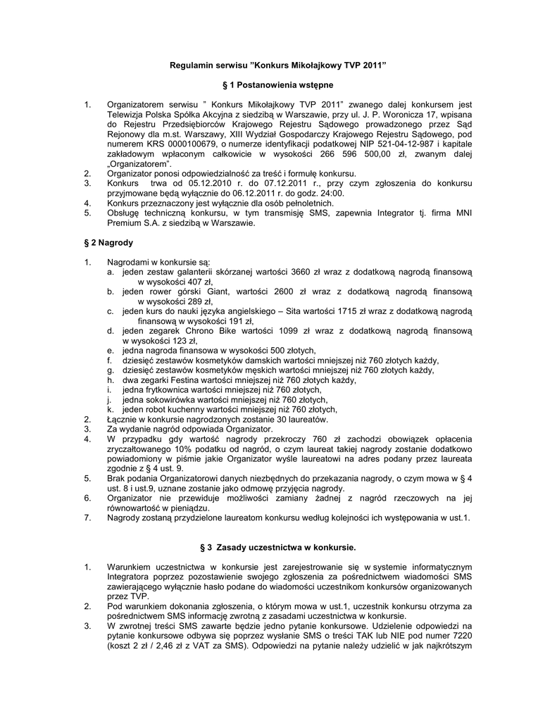 Regulamin serwisu ”Konkurs Mikołajkowy TVP 2011” § 1 Postanowienia wstępne 1. 2. 3. 4. 5. Organizatorem serwisu ” Konkurs Mikołajkowy TVP 2011” zwanego dalej konkursem jest Telewizja Polska Spółka Akcyjna z siedzibą w Warszawie, przy ul. J. P. Woronicza 17, wpisana do Rejestru Przedsiębiorców Krajowego Rejestru Sądowego prowadzonego przez Sąd Rejonowy dla m.st. Warszawy, XIII Wydział Gospodarczy Krajowego Rejestru Sądowego, pod numerem KRS 0000100679, o numerze identyfikacji podatkowej NIP 521-04-12-987 i kapitale zakładowym wpłaconym całkowicie w wysokości 266 596 500,00 zł, zwanym dalej „Organizatorem”. Organizator ponosi odpowiedzialność za treść i formułę konkursu. Konkurs trwa od 05.12.2010 r. do 07.12.2011 r., przy czym zgłoszenia do konkursu przyjmowane będą wyłącznie do 06.12.2011 r. do godz. 24:00. Konkurs przeznaczony jest wyłącznie dla osób pełnoletnich. Obsługę techniczną konkursu, w tym transmisję SMS, zapewnia Integrator tj. firma MNI Premium S.A. z siedzibą w Warszawie. § 2 Nagrody 1. 2. 3. 4. 5. 6. 7. Nagrodami w konkursie są: a. jeden zestaw galanterii skórzanej wartości 3660 zł wraz z dodatkową nagrodą finansową w wysokości 407 zł, b. jeden rower górski Giant, wartości 2600 zł wraz z dodatkową nagrodą finansową w wysokości 289 zł, c. jeden kurs do nauki języka angielskiego – Sita wartości 1715 zł wraz z dodatkową nagrodą finansową w wysokości 191 zł, d. jeden zegarek Chrono Bike wartości 1099 zł wraz z dodatkową nagrodą finansową w wysokości 123 zł, e. jedna nagroda finansowa w wysokości 500 złotych, f. dziesięć zestawów kosmetyków damskich wartości mniejszej niŜ 760 złotych kaŜdy, g. dziesięć zestawów kosmetyków męskich wartości mniejszej niŜ 760 złotych kaŜdy, h. dwa zegarki Festina wartości mniejszej niŜ 760 złotych kaŜdy, i. jedna frytkownica wartości mniejszej niŜ 760 złotych, j. jedna sokowirówka wartości mniejszej niŜ 760 złotych, k. jeden robot kuchenny wartości mniejszej niŜ 760 złotych, Łącznie w konkursie nagrodzonych zostanie 30 laureatów. Za wydanie nagród odpowiada Organizator. W przypadku gdy wartość nagrody przekroczy 760 zł zachodzi obowiązek opłacenia zryczałtowanego 10% podatku od nagród, o czym laureat takiej nagrody zostanie dodatkowo powiadomiony w piśmie jakie Organizator wyśle laureatowi na adres podany przez laureata zgodnie z § 4 ust. 9. Brak podania Organizatorowi danych niezbędnych do przekazania nagrody, o czym mowa w § 4 ust. 8 i ust.9, uznane zostanie jako odmowę przyjęcia nagrody. Organizator nie przewiduje moŜliwości zamiany Ŝadnej z nagród rzeczowych na jej równowartość w pieniądzu. Nagrody zostaną przydzielone laureatom konkursu według kolejności ich występowania w ust.1. § 3 Zasady uczestnictwa w konkursie. 1. 2. 3. Warunkiem uczestnictwa w konkursie jest zarejestrowanie się w systemie informatycznym Integratora poprzez pozostawienie swojego zgłoszenia za pośrednictwem wiadomości SMS zawierającego wyłącznie hasło podane do wiadomości uczestnikom konkursów organizowanych przez TVP. Pod warunkiem dokonania zgłoszenia, o którym mowa w ust.1, uczestnik konkursu otrzyma za pośrednictwem SMS informację zwrotną z zasadami uczestnictwa w konkursie. W zwrotnej treści SMS zawarte będzie jedno pytanie konkursowe. Udzielenie odpowiedzi na pytanie konkursowe odbywa się poprzez wysłanie SMS o treści TAK lub NIE pod numer 7220 (koszt 2 zł / 2,46 zł z VAT za SMS). Odpowiedzi na pytanie naleŜy udzielić w jak najkrótszym 4. 5. 6. 7. 8. 9. 10. 11. 12. czasie. Czas ten, mierzony jest przez system od chwili wysłania pytania konkursowego do momentu zarejestrowania w systemie odpowiedzi na to pytanie. Czas ten jest rejestrowany przez system i będzie brany pod uwagę podczas procedury przyznawania nagród. Po udzieleniu odpowiedzi system wyśle do uczestnika konkursu potwierdzenie poprawności odpowiedzi lub informację o błędnej informacji wraz z instrukcją ponownego udziału w konkursie. Ponadto system wyśle zachętę do ponownego udziału w konkursie w celu poprawienia czasu odpowiedzi na pytanie konkursowe. Po wysłaniu wiadomości SMS o treści GRAM pod numer 7220 (koszt 2 zł / 2,46 zł z VAT za SMS), system ponownie wysyła do uczestnika wiadomość SMS z instrukcją udziału w grze i pytaniem konkursowym. Wszystkie komendy SMS uŜyte w konkursie oraz odpowiedzi na pytania naleŜy wysyłać za pomocą wiadomości SMS wyłącznie z numeru telefonu, z którego pozostawiono zgłoszenie, o którym mowa w ust. 1. W celu poprawnego udziału w konkursie, uczestnik nie powinien wysyłać Ŝadnych innych treści pod numer 7220 poza tymi, o które jest proszony przez Organizatora, z zastrzeŜeniem, Ŝe w kaŜdej chwili moŜe przerwać udział w konkursie, jednakŜe bez otrzymania choć jednej wiadomości SMS z treścią, o której mowa w ust 4., uczestnik nie będzie brał udziału w procedurze przyznawania nagród w konkursie. System zarejestruje wszystkich uczestników, którzy udzielili odpowiedzi na pytanie konkursowe, będące jednocześnie wyraŜeniem woli gry o nagrody, w czasie trwania jednej sesji i zarejestruje czas w jakim udzielili tych odpowiedzi. Poprzez sesję naleŜy rozumieć cykl wysłanych kolejno dwóch wiadomości SMS, zgodnie z instrukcjami zawartymi w wiadomościach SMS, wysyłanych do uczestników konkursu po zarejestrowaniu się zgodnie z ust. 1. Udzielenie odpowiedzi na pytanie konkursowe nie moŜe nastąpić przed wysłaniem przez system Integratora pytania, którego dotyczy odpowiedź. O terminie przyjęcia zgłoszenia i o czasie odpowiedzi na pytanie decyduje moment zarejestrowania wiadomości SMS w systemie Integratora. Organizator nie ponosi odpowiedzialności za zgłoszenia zagubione przez system GSM Operatorów, błędne treści przesyłane SMS-em, indywidualne ustawienia telefonów komórkowych oraz sposoby ich konfiguracji, a takŜe ustawienia wystę