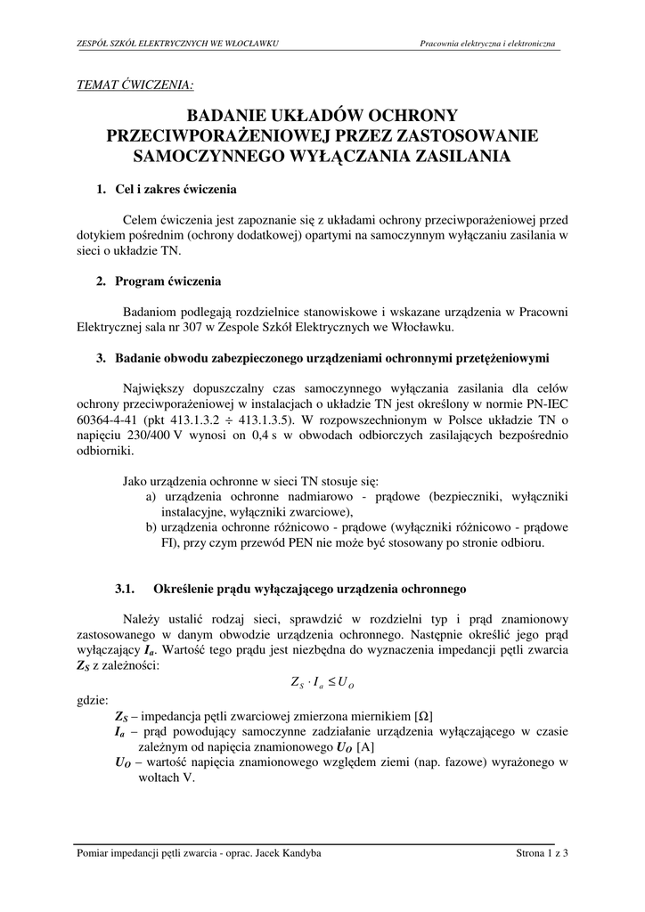 ZESPÓŁ SZKÓŁ ELEKTRYCZNYCH WE WŁOCŁAWKU Pracownia elektryczna i elektroniczna TEMAT ĆWICZENIA: BADANIE UKŁADÓW OCHRONY PRZECIWPORAśENIOWEJ PRZEZ ZASTOSOWANIE SAMOCZYNNEGO WYŁĄCZANIA ZASILANIA 1. Cel i zakres ćwiczenia Celem ćwiczenia jest zapoznanie się z układami ochrony przeciwporaŜeniowej przed dotykiem pośrednim (ochrony dodatkowej) opartymi na samoczynnym wyłączaniu zasilania w sieci o układzie TN. 2. Program ćwiczenia Badaniom podlegają rozdzielnice stanowiskowe i wskazane urządzenia w Pracowni Elektrycznej sala nr 307 w Zespole Szkół Elektrycznych we Włocławku. 3. Badanie obwodu zabezpieczonego urządzeniami ochronnymi przetęŜeniowymi Największy dopuszczalny czas samoczynnego wyłączania zasilania dla celów ochrony przeciwporaŜeniowej w instalacjach o układzie TN jest określony w normie PN-IEC 60364-4-41 (pkt 413.1.3.2 ÷ 413.1.3.5). W rozpowszechnionym w Polsce układzie TN o napięciu 230/400 V wynosi on 0,4 s w obwodach odbiorczych zasilających bezpośrednio odbiorniki. Jako urządzenia ochronne w sieci TN stosuje się: a) urządzenia ochronne nadmiarowo - prądowe (bezpieczniki, wyłączniki instalacyjne, wyłączniki zwarciowe), b) urządzenia ochronne róŜnicowo - prądowe (wyłączniki róŜnicowo - prądowe FI), przy czym przewód PEN nie moŜe być stosowany po stronie odbioru. 3.1. Określenie prądu wyłączającego urządzenia ochronnego NaleŜy ustalić rodzaj sieci, sprawdzić w rozdzielni typ i prąd znamionowy zastosowanego w danym obwodzie urządzenia ochronnego. Następnie określić jego prąd wyłączający Ia. Wartość tego prądu jest niezbędna do wyznaczenia impedancji pętli zwarcia ZS z zaleŜności: ZS ⋅ Ia ≤ UO gdzie: ZS – impedancja pętli zwarciowej zmierzona miernikiem [Ω] Ia – prąd powodujący samoczynne zadziałanie urządzenia wyłączającego w czasie zaleŜnym od napięcia znamionowego UO [A] UO – wartość napięcia znamionowego względem ziemi (nap. fazowe) wyraŜonego w woltach V. Pomiar impedancji pętli zwarcia - oprac. Jacek Kandyba Strona 1 z 3 ZESPÓŁ SZKÓŁ ELEKTRYCZNYCH WE WŁOCŁAWKU Pracownia elektryczna i elektroniczna Dla wkładek bezpiecznikowych i wyłączników instalacyjnych nadprądowych, wartość prądu Ia zaleŜy od charakterystyki czasowo-prądowej i wynosi odpowiednio: − − − − − dla wyłącznika z charakterystyką typu B dla wyłącznika z charakterystyką typu C dla wyłącznika z charakterystyką typu D dla starych wyłączników z charakterystyką typu L dla starych wyłączników z charakterystyką typu U Ia = 5·In Ia = 10·In Ia = 20·In Ia = 5·In Ia = 10·In gdzie: In – prąd znamionowy wyłącznika [A]. Rys. 1. Zwarcie pomiędzy przewodami: fazowym i ochronnym. 3.2. Pomiar impedancji pętli zwarcia Przed przystąpieniem do pomiarów naleŜy zapoznać się z instrukcją obsługi miernika. NaleŜy zmierzyć impedancję pętli zwarcia między stykiem ochronnym (bolcem) a stykiem fazowym badanego gniazda oraz między zaciskami zasilającymi i metalową obudową rozdzielnicy. Sporządzić protokół z przeprowadzonych pomiarów zawierający: − tytuł np.: Protokół z pomiarów ochronnych. Badanie ochrony przeciwporaŜeniowej dodatkowej przez samoczynne wyłączenie zasilania. − datę wykonania pomiarów, − przyczynę pomiarów np. kontrolny, okresowy, eksploatacyjny itd. − warunki podczas dokonywania pomiarów np. temperatura, wilgotność, − miejsce pomiarów, − wykonawca imiennie, − układ sieci, TN-C, TN-S, TN-C-S, − poziom napięcia względem ziemi, − czas wyłączenia, − rodzaj, typ miernika z podaniem nr fabrycznego i nr świadectwa wzorcowania, − schemat rozmieszczenia punktów pomiarowych z naniesioną numeracją pozwalającą na jednoznaczną identyfikację (zgodnie z zasadami sporządzania schematów). Pomiar impedancji pętli zwarcia - oprac. Jacek Kandyba Strona 2 z 3 ZESPÓŁ SZKÓŁ ELEKTRYCZNYCH WE WŁOCŁAWKU 3.3. Lp - Symbol - 3.4. Pracownia elektryczna i elektroniczna Tabela pomiarowa Badany punkt - Wyłącznik - In A k - Ia A Za ZS Ω Ω Ocena pozytywna/negatywna Przykładowe obliczenia Dopuszczalna impedancja pętli zwarcia: U Za = O Ia Współczynnik krotności: I k= a IN Warunek konieczny do spełnienia ochrony: ZS ≤ Za 3.5. Uwagi końcowe W ostatniej części protokołu z pomiarów naleŜy wystawić orzeczenie o stanie środka ochrony przeciwporaŜeniowej, podając ewentualne nieprawidłowości. W ćwiczeniu naleŜy posłuŜyć się kilkoma typami przyrządów o odmiennej zasadzie działania. Wykonać pomiary dla określonych punktów i dokonać porównania wyników. Sprawozdanie wykonać w formie protokołu z pomiarów ochronnych. Pomiar impedancji pętli zwarcia - oprac. Jacek Kandyba Strona 3 z 3