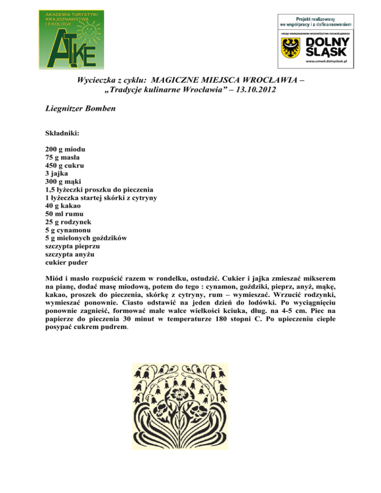 Wycieczka z cyklu: MAGICZNE MIEJSCA WROCŁAWIA – „Tradycje kulinarne Wrocławia” – 13.10.2012 Liegnitzer Bomben Składniki: 200 g miodu 75 g masła 450 g cukru 3 jajka 300 g mąki 1,5 łyżeczki proszku do pieczenia 1 łyżeczka startej skórki z cytryny 40 g kakao 50 ml rumu 25 g rodzynek 5 g cynamonu 5 g mielonych goździków szczypta pieprzu szczypta anyżu cukier puder Miód i masło rozpuścić razem w rondelku, ostudzić. Cukier i jajka zmieszać mikserem na pianę, dodać masę miodową, potem do tego : cynamon, goździki, pieprz, anyż, mąkę, kakao, proszek do pieczenia, skórkę z cytryny, rum – wymieszać. Wrzucić rodzynki, wymieszać ponownie. Ciasto odstawić na jeden dzień do lodówki. Po wyciągnięciu ponownie zagnieść, formować małe walce wielkości kciuka, dług. na 4-5 cm. Piec na papierze do pieczenia 30 minut w temperaturze 180 stopni C. Po upieczeniu ciepłe posypać cukrem pudrem. Bożonarodzeniowy placek drożdżowy z bakaliami Składniki: 500 g mąki 50 g drożdży 250 ml mleka 100 g masła 100 cukru 1 jajko 100 g migdałów 100 g sułtanek po 50 g skórki z cytryny i pomarańczy szczypta soli 2 łyżki rozpuszczonego masła do polania do posypania: cukier puder wymieszany z mielonymi migdałami Przygotować zaczyn z drożdży na 3 łyżkach mleka. Mąkę wsypać do miski, dodać cukier, sól, jajko, resztę mleka, rozpuszczone ostudzone masło, drożdże. Zagnieść gładkie ciasto. Dodać pokruszone migdały, sułtanki i drobno pokrojone skórki z owoców. Ponownie zagnieść. Ciasto przykryć ściereczką, odstawić do wyrośnięcia. Ponownie zagnieść, uformować dwa podłużne bochenki, każdy lekko spłaszczyć. Ciasto przełożyć na blachę wysmarowaną tłuszczem i oprószoną lekko mąką. Pozostawić do wyrośnięcia na ok. 15 minut. Polać rozpuszczonym masłem, piec ok. 60 min w średnio nagrzanym piekarniku. Po upieczeniu ponownie polać ciepłe ciasto masłem i posypać cukrem pudrem wymieszanym z mielonymi migdałami. Placki można piec w podłużnych formach. Sałatki Ziemniaczana 1 kg ziemniaków ugotowanych w mundurkach 2 jabłka 1 cebula 2 ogórki kiszone 100 g gotowanego boczku 4 łyżki octu winnego 250 ml bulionu z kury 1 łyżka cukru sól biały pieprz Ostudzone ziemniaki obrać, pokroić w półplastry, zalać ciepłym bulionem, ostudzić. Jabłka i ogórki pokroić w grubą kostkę, dodać do ziemniaków. Z octu, soli, pieprzu i cukru, przygotować dressing i dodać do kartofli. Dokładnie wymieszać, wstawić na jedna godzinę do lodówki. Boczek i cebulę pokroić w kostkę. Boczek roztopić na patelni, dodać cebulę, zrumienić, dodać do sałatki ziemniaczanej. Podawać z marynowanymi śledziami. Breslauer Haeckerle 125 g matjasów 125 g tłustego wędzonego boczku 125 g cebuli 125 g kiszonych ogórków 1 łyżka oliwy mleko musztarda ocet winny pieprz Śledzie zalać wodą, moczyć 15 minut. Wodę odlać, zalać ponownie mlekiem, moczyć kilka godzin. Mleko zlać, śledzie dobrze osączyć. Wszystkie składniki bardzo drobno posiekać, ewentualnie zemleć na najgrubszych oczkach. Przyprawić musztardą, pieprzem, octem. Odstawić na 24 godziny do lodówki. Podawać z ziemniakami gotowanymi w mundurkach lub z grzankami z masłem ziołowym. Bi gos śląski 200 g gotowanego boczku 250 g chudej wieprzowiny 2 cebule 1 ząbek czosnku 40 g smalcu 500 g kiszonej kapusty 250 g białej kapusty 3 pętka metki 4 ziemniaki 2 łyżki koncentratu pomidorowego 2 liście laurowe 1 łyżka słodkiej papryki ¼ łyżeczki tłuczonego kminku ½ łyżeczki majeranku sól, pieprz Boczek i mięso pokroić w kostkę, cebulę i czosnek obrać i posiekać. Smalec rozpuścić w garnku, dodać boczek i mięso, podsmażyć ze wszystkich stron. Dodać cebule i czosnek, zrumienić. Dusić wszystko pod przykryciem ok. 10 minut. W tym czasie nagrzać piekarnik do 180 stopni C. Kapustę kiszoną przepłukać by nie była za kwaśna, pokroić. Poszatkować białą kapustę. Metkę pokroić w plasterki, kartofle obrać, umyć, pokroić w dużą kostkę. Koncentrat pomidorowy dodać do mięsa, wymieszać. Dodać białą kapustę, kiszoną kapustę, metkę i przyprawy. Doprawić sola i pieprzem do smaku. Garnek przykryć i wstawić do piekarnika na 1,5 godziny. Dodać następnie ziemniaki. Dusić kolejną godzinę.