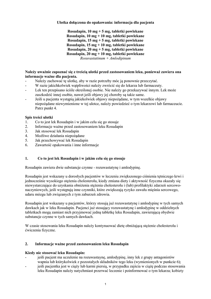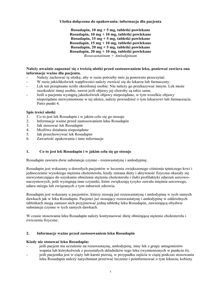 Ulotka dołączona do opakowania: informacja dla pacjenta Rosudapin, 10 mg + 5 mg, tabletki powlekane Rosudapin, 10 mg + 10 mg, tabletki powlekane Rosudapin, 15 mg + 5 mg, tabletki powlekane Rosudapin, 15 mg + 10 mg, tabletki powlekane Rosudapin, 20 mg + 5 mg, tabletki powlekane Rosudapin, 20 mg + 10 mg, tabletki powlekane Rosuvastatinum + Amlodipinum Należy uważnie zapoznać się z treścią ulotki przed zastosowaniem leku, ponieważ zawiera ona informacje ważne dla pacjenta. Należy zachować tę ulotkę, aby w razie potrzeby móc ją ponownie przeczytać. W razie jakichkolwiek wątpliwości należy zwrócić się do lekarza lub farmaceuty. Lek ten przepisano ściśle określonej osobie. Nie należy go przekazywać innym. Lek może zaszkodzić innej osobie, nawet jeśli objawy jej choroby są takie same. Jeśli u pacjenta wystąpią jakiekolwiek objawy niepożądane, w tym wszelkie objawy niepożądane niewymienione w tej ulotce, należy powiedzieć o tym lekarzowi lub farmaceucie. Patrz punkt 4. Spis treści ulotki 1. Co to jest lek Rosudapin i w jakim celu się go stosuje 2. Informacje ważne przed zastosowaniem leku Rosudapin 3. Jak stosować lek Rosudapin 4. Możliwe działania niepożądane 5. Jak przechowywać lek Rosudapin 6. Zawartość opakowania i inne informacje 1. Co to jest lek Rosudapin i w jakim celu się go stosuje Rosudapin zawiera dwie substancje czynne - rozuwastatynę i amlodypinę. Rosudapin jest wskazany u dorosłych pacjentów w leczeniu zwiększonego ciśnienia tętniczego krwi i jednocześnie wysokiego stężenia cholesterolu, kiedy zmiana diety i aktywność fizyczna okazały się niewystarczające do uzyskania obniżenia stężenia cholesterolu i (lub) profilaktyki zdarzeń sercowonaczyniowych, jeśli występują inne czynniki, które zwiększają ryzyko zawału mięśnia sercowego, udaru mózgu lub związanych z tym zaburzeń zdrowia. Rosudapin jest wskazany u pacjentów, którzy stosują już rozuwastatynę i amlodypinę w tych samych dawkach jak w leku Rosudapin. Pacjenci już stosujący rozuwastatynę i amlodypinę w oddzielnych tabletkach mogą zamiast nich przyjmować jedną tabletkę leku Rosudapin, zawierającą obydwie substancje czynne w tych samych dawkach. W czasie stosowania leku Rosudapin należy kontynuować dietę obniżającą stężenie cholesterolu i ćwiczenia fizyczne. 2. Informacje ważne przed zastosowaniem leku Rosudapin Kiedy nie stosować leku Rosudapin: jeśli pacjent ma uczulenie na rozuwastaynę, amlodypinę, inny lek z grupy antagonistów wapnia lub którykolwiek z pozostałych składników tego leku (wymienionych w punkcie 6); jeśli pacjentka jest w ciąży lub karmi piersią, w przypadku zajścia w ciążę podczas stosowania leku Rosudapin należy natychmiast przerwać leczenie i poinformować o tym lekarza; kobiety 1 - - w wieku rozrodczym podczas przyjmowania leku Rosudapin, powinny stosować skuteczne metody zapobiegania ciąży; jeśli u pacjenta występuje choroba wątroby; jeśli u pacjenta występują ciężkie zaburzenia czynności nerek; jeśli u pacjenta występują powtarzające się lub niewyjaśnione bóle mięśni; jeśli pacjent przyjmuje cyklosporynę (lek zapobiegający odrzuceniu przeszczepionego narządu); jeśli u pacjenta występuje bardzo niskie ciśnienie krwi (ciężkie niedociśnienie); jeśli u pacjenta występuje zwężenie zastawki aortalnej serca (stenoza aortalna) lub wstrząs kardiogenny (stan, w którym serce nie jest w stanie dostarczyć do organizmu odpowiedniej ilości krwi); jeśli u pacjenta występuje niewydolność serca po zawale mięśnia sercowego. Ostrzeżenia i środki ostrożności Przed rozpoczęciem stosowania leku Rosudapin należy omówić to z lekarzem lub farmaceutą: jeśli pacjent ma zaburzenia nerek; jeśli pacjent ma zaburzenia wątroby; jeśli u pacjenta występują powtarzające się lub niewyjaśnione bóle mięśni, jeśli bóle mięśni występowały w przeszłości u pacjenta lub jego rodziny lub jeśli w przeszłości pojawiały się zaburzenia mięśni podczas przyjmowania innych leków obniżających stężenie cholesterolu; w razie wystąpienia niewyjaśnionego bólu mięśni, szczególnie jeśli pojawi się złe samopoczucie lub gorączka, należy natychmiast poinformować lekarza; należy również poinformować lekarza lub farmaceutę, jeśli występuje stałe osłabienie mięśni; jeśli pacjent regularnie pije znaczne ilości alkoholu; jeśli tarczyca nie działa prawidłowo; jeśli pacjent stosuje inne leki obniżające steżenie cholesterolu, zwane fibratami; należy uważnie zapoznać się z treścią ulotki, nawet jeśli pacjent stosował inne leki obniżające stężenie cholesterolu w przeszłości; jeśli pacjent przyjmuje leki stosowane w leczeniu zakażenia HIV, np. rytonawir z lopinawirem i (lub) atazanawirem, patrz punkt ,,Rosudapin i inne leki’’, jeśli pacjent stosuje antybiotyki zawierające kwas fusydowy, patrz punkt ,,Rosudapin i inne leki’’; jeśli u pacjenta występuje ciężka niewydolność oddechowa; jeżeli pacjent niedawno przebył zawał mięśnia sercowego; jeśli u pacjenta występuje niewydolność serca; jeśli u pacjenta wystąpił duży wzrost ciśnienia krwi (przełom nadciśnieniowy); jeśli pacjent jest w podeszłym wieku; jeśli pacjent jest pochodzenia azjatyckiego: japońskiego, chińskiego, filipińskiego, wietnamskiego, koreańskiego lub hinduskiego; lekarz musi dobrać odpowiednią dla potrzeb pacjenta dawkę początkową leku Rosudapin. U niewielkiej liczby osób statyny mogą wpływać na wątrobę. Można to stwierdzić, wykonując prosty test, który wykaże zwiększoną aktywność enzymów wątrobowych we krwi. Z tego powodu lekarz przeprowadza zazwyczaj badanie krwi (próby wątrobowe) przed i podczas leczenia lekiem Rosudapin. Pacjenci z cukrzycą lub u których istnieje ryzyko rozwoju cukrzycy, podczas stosowania tego leku będą pozostawać pod ścisłą kontrolą lekarską. Osoby, z wysokim stęż
