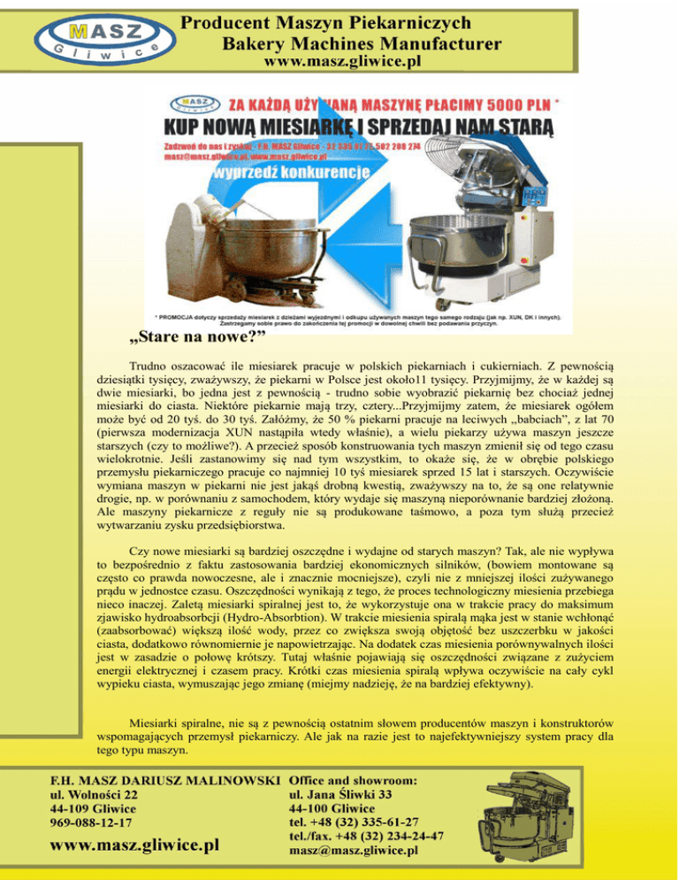 „Stare na nowe?” Trudno oszacować ile miesiarek pracuje w polskich piekarniach i cukierniach. Z pewnością dziesiątki tysięcy, zważywszy, że piekarni w Polsce jest około11 tysięcy. Przyjmijmy, że w każdej są dwie miesiarki, bo jedna jest z pewnością - trudno sobie wyobrazić piekarnię bez chociaż jednej miesiarki do ciasta. Niektóre piekarnie mają trzy, cztery...Przyjmijmy zatem, że miesiarek ogółem może być od 20 tyś. do 30 tyś. Załóżmy, że 50 % piekarni pracuje na leciwych „babciach”, z lat 70 (pierwsza modernizacja XUN nastąpiła wtedy właśnie), a wielu piekarzy używa maszyn jeszcze starszych (czy to możliwe?). A przecież sposób konstruowania tych maszyn zmienił się od tego czasu wielokrotnie. Jeśli zastanowimy się nad tym wszystkim, to okaże się, że w obrębie polskiego przemysłu piekarniczego pracuje co najmniej 10 tyś miesiarek sprzed 15 lat i starszych. Oczywiście wymiana maszyn w piekarni nie jest jakąś drobną kwestią, zważywszy na to, że są one relatywnie drogie, np. w porównaniu z samochodem, który wydaje się maszyną nieporównanie bardziej złożoną. Ale maszyny piekarnicze z reguły nie są produkowane taśmowo, a poza tym służą przecież wytwarzaniu zysku przedsiębiorstwa. Czy nowe miesiarki są bardziej oszczędne i wydajne od starych maszyn? Tak, ale nie wypływa to bezpośrednio z faktu zastosowania bardziej ekonomicznych silników, (bowiem montowane są często co prawda nowoczesne, ale i znacznie mocniejsze), czyli nie z mniejszej ilości zużywanego prądu w jednostce czasu. Oszczędności wynikają z tego, że proces technologiczny miesienia przebiega nieco inaczej. Zaletą miesiarki spiralnej jest to, że wykorzystuje ona w trakcie pracy do maksimum zjawisko hydroabsorbcji (Hydro-Absorbtion). W trakcie miesienia spiralą mąka jest w stanie wchłonąć (zaabsorbować) większą ilość wody, przez co zwiększa swoją objętość bez uszczerbku w jakości ciasta, dodatkowo równomiernie je napowietrzając. Na dodatek czas miesienia porównywalnych ilości jest w zasadzie o połowę krótszy. Tutaj właśnie pojawiają się oszczędności związane z zużyciem energii elektrycznej i czasem pracy. Krótki czas miesienia spiralą wpływa oczywiście na cały cykl wypieku ciasta, wymuszając jego zmianę (miejmy nadzieję, że na bardziej efektywny). Miesiarki spiralne, nie są z pewnością ostatnim słowem producentów maszyn i konstruktorów wspomagających przemysł piekarniczy. Ale jak na razie jest to najefektywniejszy system pracy dla tego typu maszyn. Stare miesiarki, choć czasami bardzo dobrej konstrukcji, wymagają oczywiście częstszych napraw niż maszyny nowe (jeśli nie, to co to za nowa maszyna – gorsza od starej). Często nie spełniają już określonych parametrów technicznych i zabezpieczeń. Częste naprawy, a przede wszystkim niepokój, czy tym razem maszyna da jeszcze radę popracować łatwo przeliczyć na pieniądze. Wystarczy to przecież notować – ile zamówiono napraw w roku, plus koszt części, plus przestoje w pracy, plus straty na niesprzedanym terminowo towarze - wszystko to można policzyć i większość piekarzy liczy, prowadząc prosty rachunek ekonomiczny zysków i inwestycji w swojej firmie. Wielu jednak nie liczy. Dopuszczając do nieefektywnej produkcji doskładają swoje oszczędności, albo ją kredytują, często na niemały procent. W końcu jednak przychodzi czas na zamknięcie firmy i wyprzedaż majątku, który zważywszy na zużycie nie jest zbyt cenny. Możemy wzdychać do czasów, gdy piekarz ręcznie miesił ciasto dla klientów ze swego bezpośredniego sąsiedztwa, piekł w piecu węglowym, czy jeszcze lepiej opalanym drewnem...Chleba o takiej jakości na pewno warto żałować, jego cudownego zapachu i smaku. Jednak czy będziemy się gniewać, że rewolucja techniczna sprzed bez mała 200 lat dała impuls do zmiany sposobu produkcji wszędzie, nie tylko w piekarnictwie. O tym nie ma co myśleć, bo to płacz nad rozlanym mlekiem, tego już na pewno nie zmienimy. Piekarstwo to ciężka praca i bez wahania i z przyjemnością pozwalamy na jej ułatwienie. Cóż, dzieje się to kosztem jakości chleba, ale mówiąc prawdę, czy obserwujemy na współczesnym rynku wzrost jakości produktów. W dużej mierze nie. Obserwujemy za to tendencje do minimalizacji kosztów i maksymalizacji zysku za wszelka cenę, siłą rzeczy i przede wszystkim kosztem jakości. Czy nowe miesiarki są lepsze od starych? Czy są bardziej niezawodne? Odpowiedź wymaga wstępnego porównania wielu czynników. Jeśli nowa miesiarka pracuje niemalże 24 godziny na dobę, to jak długo wytrzymają jej podzespoły, nawet te ze stali narzędziowej? Czy jeździmy naszym nowoczesnym samochodem dzień i noc na pełnym gazie? Kiedy pojawi się pierwsza usterka uniemożliwiająca dalszą jazdę? Zapewne dosyć szybko. W wielu dużych piekarniach praca trwa nonstop. Jaka maszyna wytrzyma tego rodzaju pracę przez dajmy na to 5 lat bez przerwy, bez konserwacji, wymiany podzespołów...nie wiem. Poza tym maszyny jednego rodzaju są konstrukcyjnie takie same ale przecież różnią się od siebie. Nie są w 100% identyczne Nie ma dwóch takich samych maszyn, tak jak nie ma dokładnie dwóch takich samych osób. W zasadzie trzeba by powiedzieć że każda maszyna jest inna mimo, że jej konstrukcja oparta jest na tym samym schemacie. Nie ma dwóch takich samych łożysk, nie ma dwóch identycznych styczników. Mogą być niemalże identyczne. Dlatego też jedna nowa maszyna pracuje przez 5 lat bez żadnych usterek, a inna, wyprodukowana w tym samym czasie i w tej samej firmie, już na starcie ma problemy. Na naszej stronie znajduje się informacja o specjalnej promocji handlowej. W skrócie można by ją określić jako „stare na nowe”. Firma zdecydowała się za pomocą niemałej premii (5000 pln) zachęcić polskich piekarzy do wymiany starych maszyn na nowe. Promocja jednak nie dot