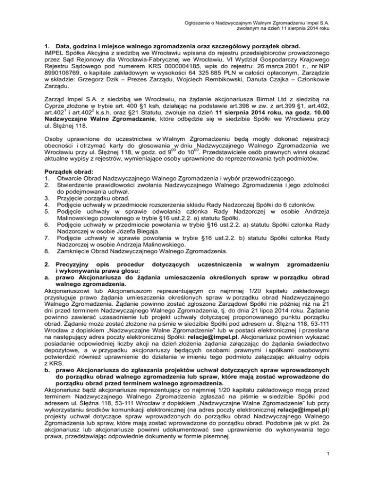 Ogłoszenie o Nadzwyczajnym Walnym Zgromadzeniu Impel S.A. zwołanym na dzień 11 sierpnia 2014 roku 1. Data, godzina i miejsce walnego zgromadzenia oraz szczegółowy porządek obrad. IMPEL Spółka Akcyjna z siedzibą we Wrocławiu wpisana do rejestru przedsiębiorców prowadzonego przez Sąd Rejonowy dla Wrocławia-Fabrycznej we Wrocławiu, VI Wydział Gospodarczy Krajowego Rejestru Sądowego pod numerem KRS 0000004185, wpis do rejestru: 26 marca 2001 r., nr NIP 8990106769, o kapitale zakładowym w wysokości 64 325 885 PLN w całości opłaconym, Zarządzie w składzie: Grzegorz Dzik – Prezes Zarządu, Wojciech Rembikowski, Danuta Czajka – Członkowie Zarządu. Zarząd Impel S.A. z siedzibą we Wrocławiu, na żądanie akcjonariusza Birmat Ltd z siedzibą na Cyprze złożone w trybie art. 400 §1 ksh, działając na podstawie art.398 w zw. z art.399 §1, art.402, 1 2 art.402 i art.402 k.s.h. oraz §21 Statutu, zwołuje na dzień 11 sierpnia 2014 roku, na godz. 10.00 Nadzwyczajne Walne Zgromadzanie, które odbędzie się w siedzibie Spółki we Wrocławiu przy ul. Ślężnej 118. Osoby uprawnione do uczestnictwa w Walnym Zgromadzeniu będą mogły dokonać rejestracji obecności i otrzymać karty do głosowania w dniu Nadzwyczajnego Walnego Zgromadzenia we 00 00 Wrocławiu przy ul. Ślężnej 118, w godz. od 9 do 10 . Przedstawiciele osób prawnych winni okazać aktualne wypisy z rejestrów, wymieniające osoby uprawnione do reprezentowania tych podmiotów. Porządek obrad: 1. Otwarcie Obrad Nadzwyczajnego Walnego Zgromadzenia i wybór przewodniczącego. 2. Stwierdzenie prawidłowości zwołania Nadzwyczajnego Walnego Zgromadzenia i jego zdolności do podejmowania uchwał. 3. Przyjęcie porządku obrad. 4. Podjęcie uchwały w przedmiocie rozszerzenia składu Rady Nadzorczej Spółki do 6 członków. 5. Podjęcie uchwały w sprawie odwołania członka Rady Nadzorczej w osobie Andrzeja Malinowskiego powołanego w trybie §16 ust.2.2. a) statutu Spółki. 6. Podjęcie uchwały w przedmiocie powołania w trybie §16 ust.2.2. a) statutu Spółki członka Rady Nadzorczej w osobie Józefa Biegaja. 7. Podjęcie uchwały w sprawie powołania w trybie §16 ust.2.2. b) statutu Spółki członka Rady Nadzorczej w osobie Andrzeja Malinowskiego. 8. Zamknięcie Obrad Nadzwyczajnego Walnego Zgromadzenia. 2. Precyzyjny opis procedur dotyczących uczestniczenia w walnym zgromadzeniu i wykonywania prawa głosu: a. prawo Akcjonariusza do żądania umieszczenia określonych spraw w porządku obrad walnego zgromadzenia. Akcjonariuszowi lub Akcjonariuszom reprezentującym co najmniej 1/20 kapitału zakładowego przysługuje prawo żądania umieszczenia określonych spraw w porządku obrad Nadzwyczajnego Walnego Zgromadzenia. Żądanie powinno zostać zgłoszone Zarządowi Spółki nie później niż na 21 dni przed terminem Nadzwyczajnego Walnego Zgromadzenia, tj. do dnia 21 lipca 2014 roku. Żądanie powinno zawierać uzasadnienie lub projekt uchwały dotyczącej proponowanego punktu porządku obrad. Żądanie może zostać złożone na piśmie w siedzibie Spółki pod adresem ul. Ślężna 118, 53-111 Wrocław z dopiskiem „Nadzwyczajne Walne Zgromadzenie” lub w postaci elektronicznej i przesłane na następujący adres poczty elektronicznej Spółki: [email protected]. Akcjonariusz powinien wykazać posiadanie odpowiedniej liczby akcji na dzień złożenia żądania załączając do żądania świadectwo depozytowe, a w przypadku akcjonariuszy będących osobami prawnymi i spółkami osobowymi potwierdzić również uprawnienie do działania w imieniu tego podmiotu załączając aktualny odpis z KRS. b. prawo Akcjonariusza do zgłaszania projektów uchwał dotyczących spraw wprowadzonych do porządku obrad walnego zgromadzenia lub spraw, które mają zostać wprowadzone do porządku obrad przed terminem walnego zgromadzenia. Akcjonariusz bądź akcjonariusze reprezentujący co najmniej 1/20 kapitału zakładowego mogą przed terminem Nadzwyczajnego Walnego Zgromadzenia zgłaszać na piśmie w siedzibie Spółki pod adresem ul. Ślężna 118, 53-111 Wrocław z dopiskiem „Nadzwyczajne Walne Zgromadzenie” lub przy wykorzystaniu środków komunikacji elektronicznej (na adres poczty elektronicznej [email protected]) projekty uchwał dotyczące spraw wprowadzonych do porządku obrad Nadzwyczajnego Walnego Zgromadzenia lub spraw, które mają zostać wprowadzone do porządku obrad. Podobnie jak w pkt. 2a akcjonariusz lub akcjonariusze powinni udokumentować swe uprawnienie do wykonywania tego prawa, przedstawiając odpowiednie dokumenty w formie pisemnej. 1 Ogłoszenie o Nadzwyczajnym Walnym Zgromadzeniu Impel S.A. zwołanym na dzień 11 sierpnia 2014 roku c. prawo Akcjonariusza do zgłaszania projektów uchwał dotyczących spraw wprowadzonych do porządku obrad podczas walnego zgromadzenia. Każdy akcjonariusz może podczas obrad Walnego Zgromadzenia zgłaszać projekty uchwał dotyczące spraw wprowadzonych do porządku obrad. d. sposób wykonywania prawa głosu przez pełnomocnika, w tym w szczególności o formularzach stosowanych podczas głosowania przez pełnomocnika, oraz sposobie zawiadamiania spółki przy wykorzystaniu środków komunikacji elektronicznej o ustanowieniu pełnomocnika. Akcjonariusz może uczestniczyć w Nadzwyczajnym Walnym Zgromadzeniu oraz wykonywać prawo głosu osobiście lub przez pełnomocnika. Spółka w dniu dzisiejszym udostępniana na swojej stronie internetowej (www.impel.pl zakładka Relacje Inwestorskie) wzór formularza pozwalającego na wykonywanie prawa głosu przez pełnomocnika. Pełnomocnictwo do głosowania przez pełnomocnika powinno być udzielone na piśmie lub w postaci elektronicznej. Udzielenie pełnomocnictwa w postaci elektronicznej nie wymaga opatrzenia bezpiecznym podpisem elektronicznym weryfikowanym przy pomocy ważnego kwalifikowanego certyfikatu. O udzieleniu pełnomocnictwa w postaci elektronicznej należy zawiadomić Spółkę przy wyk