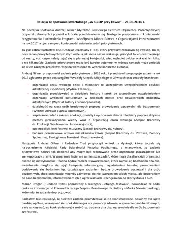 Relacja ze spotkania kwartalnego „W GCOP przy kawie” – 21.06.2016 r. Na początku spotkania Andrzej Gillner (dyrektor Gliwickiego Centrum Organizacji Pozarządowych) przywitał zebranych i poprosił o krótkie przedstawienie się. Następnie przypomniał o konieczności przygotowania i uchwalenia Programu Współpracy Miasta Gliwice z Organizacjami Pozarządowymi na rok 2017, a tym samym o konieczności ustalenia zadań priorytetowych. Tu głos zabrał Radosław Truś (Oddział Uczelniany PTTK), który przybliżył zebranym tę kwestię. Do tej pory zadań priorytetowych było zbyt wiele, a jak sama nazwa wskazuje, priorytet to coś ważniejszego od reszty, coś, czym należy zająć się w pierwszej kolejności, więc najlepiej byłoby wskazać ich kilka, a nie kilkanaście. Zadanie priorytetowe może być bardzo pojemne, w którego ramach może zmieścić się wiele różnych projektów, więc najważniejsze to wybrać konkretne kierunki. Andrzej Gillner przypomniał zadania priorytetowe z 2016 roku i przedstawił propozycje zadań na rok 2017 zgłoszone przez poszczególne Wydziały Urzędu Miejskiego w Gliwicach oraz zespoły branżowe: organizacja czasu wolnego dzieci i młodzieży ze szczególnym uwzględnieniem edukacji artystycznej i sportowej (Wydział Edukacji), organizacja przedsięwzięć w dziedzinie kultury i sztuki ze szczególnym uwzględnieniem organizacji wydarzeń kulturalnych w osiedlach miasta oraz nowatorskich projektów artystycznych (Wydział Kultury i Promocji Miasta), działalność na rzecz osób bezdomnych poprzez prowadzenie ogrzewalni dla bezdomnych (Wydział Zdrowia i Spraw Społecznych), wspieranie zadań z zakresu edukacji, oświaty i wychowania dzieci i młodzieży poprzez aktywne metody przekazywania wiedzy wraz z organizacją czasu wolnego (Zespół Branżowy ds. Edukacji, Wychowania i Innowacyjności), ogólnopolski letni festiwal muzyczny (Zespół Branżowy ds. Kultury), badania przesiewowe wzroku mieszkańców Gliwic (Zespół Branżowy ds. Zdrowia, Pomocy Społecznej, Ekologii oraz Turystyki i Krajoznawstwa). Następnie Andrzej Gillner i Radosław Truś przytoczyli wnioski z dyskusji, która toczyła się na posiedzeniu Miejskiej Rady Działalności Pożytku Publicznego, a mianowicie, że zadania priorytetowe należy tak dobierać aby mogły być realizowane przez organizacje pozarządowe lub we współpracy z nimi. W programie lepiej nie zamieszczać zadań, które mogą dla gliwickich organizacji okazać się niewykonalne. Trudno będzie znaleźć stowarzyszenie, która zajmie się badaniami dna oka, ewentualnie mogłoby się zająć kampanią informacyjną, nagłaśnianiem tematu, promowaniem poddawania się badaniom itp. Łatwiejszym zadaniem będzie prowadzenie ogrzewalni dla osób bezdomnych, choć organizacje mogłyby zajmować się nie tworzeniem takich miejsc, ale docieraniem do osób bezdomnych, informowaniem ich o ogrzewalniach i zachęcaniem do skorzystania z nich. Marian Dragon (Fundacja Rytm) poproszony o szczegóły „letniego festiwalu”, powiedział, że nadal czeka na informacje od Przewodniczącego Zespołu Branżowego ds. Kultury – Marka Niewiarowskiego, który miał to zadanie doprecyzować. Radosław Truś zauważył, że niektóre zadania priorytetowe są źle skonstruowane, powinny być ujęte bardziej ogólnie, wskazywać kierunek działań jak np. promocja zdrowia, wspieranie osób bezdomnych, a nie wskazywać, co konkretnie należy zrobić np. badania dna oka, ogrzewalnie dla osób bezdomnych czy festiwal. Łukasz Gorczyński (Urząd Miejski w Gliwicach) podkreślił, że przy zadaniach priorytetowych można również wskazać osiedla, gdzie niewiele się dzieje, albo które borykają się z konkretnymi problemami, by zainteresować nimi organizacje i tam skierować ich działania. Dodał też, że mimo uczynienia jakiegoś zadania priorytetowym, może ono nie przyciągnąć uwagi organizacji i wtedy pozostanie pula niewykorzystanych pieniędzy (tak było z innowacyjnymi działaniami kulturalnymi). Radosław Truś zaproponował, rozesłanie do wszystkich organizacji pozarządowych informacji o tworzonym Programie Współpracy i zgłoszonych zadaniach priorytetowych, żeby były świadome sytuacji. Jacek Rogoliński (Stowarzyszenie na rzecz Wspierania Badań nad Rakiem) opowiedział o swoich doświadczeniach przy organizowaniu różnego rodzaju spotkań i wykładów (m.in. w Muzeum, Starym Hangarze), na które, mimo szeroko zakrojonej promocji, przychodzi niewiele osób i zaproponował, by jednym z zadań priorytetowych było aktywizowanie mieszkańców, walka z ich biernością. Marian Dragon dodał, że o bierności ludzi i organizacji nie trzeba dużo mówić, wystarczy spojrzeć na listę obecności spotkania – liczba osób, liczba reprezentowanych organizacji mówi sama za siebie. Zwrócił się też z pytaniem do Andrzeja Gillnera o to, czy Urząd Miejski w Gliwicach na przestrzeni lat brał pod uwagę głosy organizacji dotyczące Programu Współpracy. W odpowiedzi usłyszał, że wpływ organizacji stopniowo, ciągle rośnie. Kiedyś zadań priorytetowych było kilkanaście, organizacje zgłaszały kolejne, teraz doszliśmy do punktu zwrotnego i czynimy deklaratywne priorytety rzeczywistymi. Zwrócono też uwagę na to, że był np. Europejski Rok Wolontariatu czy Europejski Rok Aktywności Osób Starszych i miało to swoje odbicie w Programie. Radosław Truś podkreślił, że wszyscy ciągle się uczymy, a uwagi zawsze warto zgłaszać, bo docierają one do UM, czego przykładem jest chociażby Budżet Obywatelski, wprowadzanie w nim zmian, promowanie go. Głos organizacji w temacie Programu Współpracy również zostanie usłyszany i wzięty pod uwagę. Druga część spotkania poświęcona została internetowej bazie wydarzeń organizowanych przez gliwickie organizacje. Czesław Dudek (Rada Seniorów) zaproponował, by wszelkie informacje tego typu pojawiały się na stronie GCOP. Radosław Truś