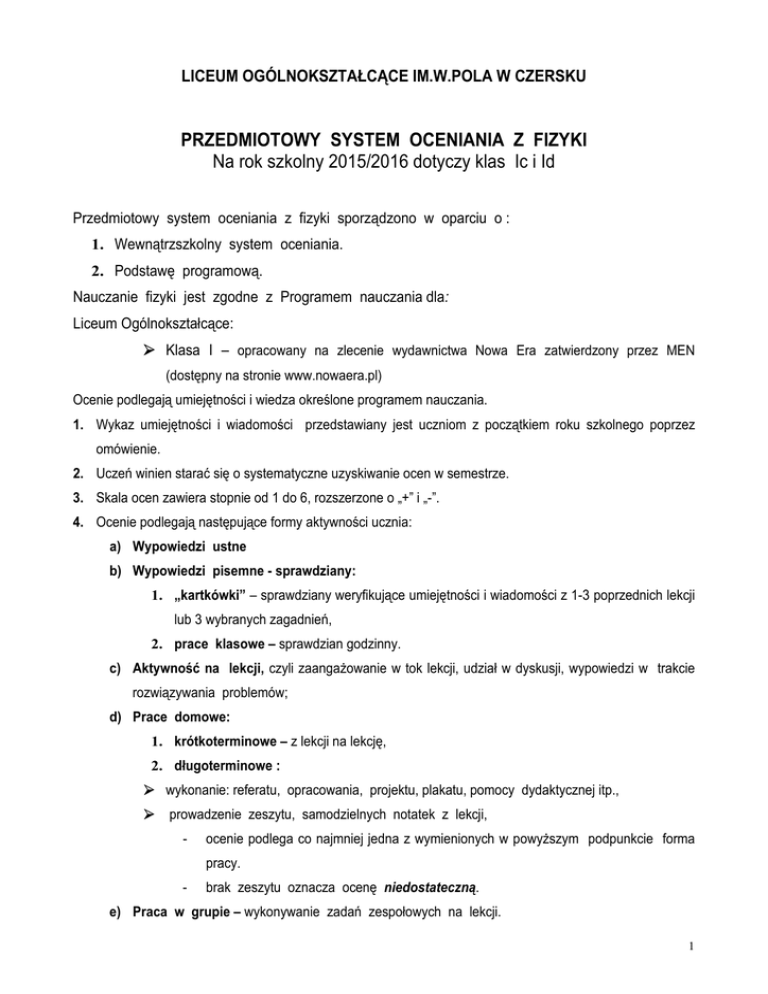 LICEUM OGÓLNOKSZTAŁCĄCE IM.W.POLA W CZERSKU PRZEDMIOTOWY SYSTEM OCENIANIA Z FIZYKI Na rok szkolny 2015/2016 dotyczy klas Ic i Id Przedmiotowy system oceniania z fizyki sporządzono w oparciu o : 1. Wewnątrzszkolny system oceniania. 2. Podstawę programową. Nauczanie fizyki jest zgodne z Programem nauczania dla: Liceum Ogólnokształcące: Klasa I – opracowany na zlecenie wydawnictwa Nowa Era zatwierdzony przez MEN (dostępny na stronie www.nowaera.pl) Ocenie podlegają umiejętności i wiedza określone programem nauczania. 1. Wykaz umiejętności i wiadomości przedstawiany jest uczniom z początkiem roku szkolnego poprzez omówienie. 2. Uczeń winien starać się o systematyczne uzyskiwanie ocen w semestrze. 3. Skala ocen zawiera stopnie od 1 do 6, rozszerzone o „+” i „-”. 4. Ocenie podlegają następujące formy aktywności ucznia: a) Wypowiedzi ustne b) Wypowiedzi pisemne - sprawdziany: 1. „kartkówki” – sprawdziany weryfikujące umiejętności i wiadomości z 1-3 poprzednich lekcji lub 3 wybranych zagadnień, 2. prace klasowe – sprawdzian godzinny. c) Aktywność na lekcji, czyli zaangażowanie w tok lekcji, udział w dyskusji, wypowiedzi w trakcie rozwiązywania problemów; d) Prace domowe: 1. krótkoterminowe – z lekcji na lekcję, 2. długoterminowe : wykonanie: referatu, opracowania, projektu, plakatu, pomocy dydaktycznej itp., prowadzenie zeszytu, samodzielnych notatek z lekcji, - ocenie podlega co najmniej jedna z wymienionych w powyższym podpunkcie forma pracy. - brak zeszytu oznacza ocenę niedostateczną. e) Praca w grupie – wykonywanie zadań zespołowych na lekcji. 1 5. Kryteria oceny umiejętności i wiadomości są następujące : Nie każda odpowiedź ucznia musi być oceniania. Odpowiedzi krótkie, uzupełniające czyjąś wypowiedź mogą być oceniane plusami. Czasami nieznajomość podstawowych praw, reguł, jednostek oraz przeszkadzanie w pracy innych uczniów jest oceniane minusami. a) Wypowiedź ustna : bezbłędna, samodzielna, wykraczająca poza program - stopień celujący, bezbłędna, samodzielna, wyczerpująca - stopień bardzo dobry, bezbłędna, samodzielna, niepełna - stopień dobry, z drobnymi błędami, samodzielna, niepełna - stopień dostateczny, z błędami, z pomocą nauczyciela, niepełna - stopień dopuszczający, nie udzielenie odpowiedzi mimo pomocy nauczyciela, bądź stwierdzenie niesamodzielności odpowiedzi - stopień niedostateczny. b) Wypowiedź pisemna – praca klasowa wg kryteriów określonych punktowo, co najmniej : 30% - stopień dopuszczający, 50% - stopień dostateczny, 70% - stopień dobry, 90% - stopień bardzo dobry, 96% - stopień celujący. Poza tym : stwierdzenie niesamodzielności pracy - stopień niedostateczny, nieobecność - uczeń zalicza pracę klasową w trybie określonym przez nauczyciela, w przypadku nie zgłoszenia się ucznia w wyznaczonym terminie nauczyciel ma prawo sprawdzić wiedzę i umiejętności z zakresu sprawdzianu na pierwszej lekcji, na której uczeń jest obecny. c) Aktywność punktowana „+” i „-”∗: 3 plusów - stopień bardzo dobry, 2 plusy - stopień dobry, 3 minusy - stopień niedostateczny, Za szczególną aktywność uczeń może otrzymać ocenę. d) Prace domowe wg kryteriów określonych w punkcie a), e) Praca grupy wg kryteriów określonych w punkcie a) i c), z uwzględnieniem wkładu pracy. 2 6. Praca klasowa jest zapowiadana, co najmniej z tygodniowym wyprzedzeniem. Natomiast „kartkówki” nie muszą być zapowiedziane. 7. Nauczyciel informuje uczniów o wynikach sprawdzianów w ciągu dwóch tygodni od daty przyjęcia pracy. 8. W przypadku gdy nauczyciel nie poinformuje o wynikach sprawdzianów w wyżej wymienionym terminie to wówczas tylko na prośbę ucznia ocena ta może być wpisana do dziennika. 9. Nauczyciel przechowuje wszystkie sprawdziany uczniów do końca danego roku szkolnego. 10. Warunki poprawy stopni; Uczeń, który z pracy pisemnej otrzymał ocenę niedostateczną ma prawo do jej poprawy w trybie określonym przez nauczyciela. W przypadku sprawdzianu poprawa musi nastąpić nie później niż w ciągu 14 dni a zapowiedzianej „kartkówki” w ciągu 7 dni od terminu oddania i omówienia pracy. Uczeń ma możliwość poprawienia ocen po upływie terminu jedynie za zgodą nauczyciela. a) uczeń może poprawić ocenę niedostateczną poprzez uzyskanie wyższego stopnia, b) ocena z poprawy jest wpisywana jako kolejna ocena cząstkowa. Uczeń, który przystępuje do sprawdzianu w drugim terminie nie ma możliwości poprawienia oceny. 11. Uczeń ma prawo zgłosić nieprzygotowanie do lekcji : a) raz w ciągu semestru, b) nie można zgłosić nieprzygotowania do lekcji powtórzeniowej, pracy klasowej lub zapowiedzianej „kartkówki”. 12. Uzyskane stopnie w poszczególnych formach aktywności ucznia stanowią podstawę stopnia semestralnego. Stopnie mają różne wagi. Ocena semestralna (końcoworoczna) nie jest średnią ocen cząstkowych. Przy ustalaniu oceny semestralnej i końcowej nauczyciel bierze pod uwagę stopnie ucznia z poszczególnych form działalności ucznia w następującej kolejności : a) Prace klasowe - (największy wpływ na kształt oceny semestralnej i końcowej); b) Sprawdziany („kartkówki”); c) Odpowiedź ustna; prezentacja (praca długoterminowa), praca w grupach (doświadczenia) d) Prace domowe, praca w grupach (z podręcznikiem) e) Aktywność na lekcji. 13. Ustalając ocenę semestralną lub końcową nauczyciel może obniżyć o 1 stopień ocenę jeżeli uczeń opuszczał zajęcia lub często nie uczestniczył w różnych formach sprawdzania wiedzy i umiejętności. Nauczyciel może również podwyższyć o 1 stopień ocenę semestralną lub końcową , jeżeli uczeń wykazywał się szczególną aktywnością na zajęciach. 14. W przypadku otrzymania oceny niedostatecznej za pierwszy semestr uczeń zobowiązany jest uzgodnić z nauczycielem sposób poprawy i zaliczyć w ustalonym terminie. 3 15.