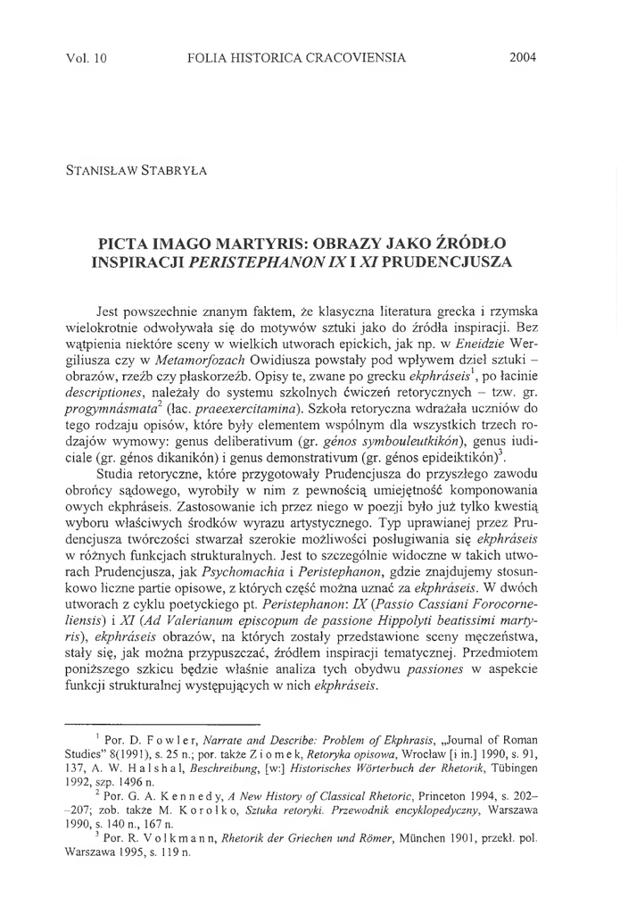 Vol. 10 FOLIA HISTORICA CRACOVIENSIA 2004 S t a n is ł a w S t a b r y ł a PICTA IMAGO MARTYRIS: OBRAZY JAKO ŹRÓDŁO INSPIRACJI PERISTEPHANONIXI X I PRUDENCJUSZA Jest powszechnie znanym faktem, że klasyczna literatura grecka i rzymska wielokrotnie odwoływała się do motywów sztuki jako do źródła inspiracji. Bez wątpienia niektóre sceny w wielkich utworach epickich, jak np. w Eneidzie Wergiliusza czy w Metamorfozach Owidiusza powstały pod wpływem dzieł sztuki obrazów, rzeźb czy płaskorzeźb. Opisy te, zwane po grecku ekphraseis\ po łacinie descriptiones, należały do systemu szkolnych ćwiczeń retorycznych - tzw. gr. progymnasmata2 (łac. praeexercitamina). Szkoła retoryczna wdrażała uczniów do tego rodzaju opisów, które były elementem wspólnym dla wszystkich trzech ro dzajów wymowy: genus deliberativum (gr. genos symbouleutkikón), genus iudiciale (gr. genos dikanikón) i genus demonstrativum (gr. genos epideiktikón)3. Studia retoryczne, które przygotowały Prudencjusza do przyszłego zawodu obrońcy sądowego, wyrobiły w nim z pewnością umiejętność komponowania owych ekphraseis. Zastosowanie ich przez niego w poezji było już tylko kwestią wyboru właściwych środków wyrazu artystycznego. Typ uprawianej przez Pru dencjusza twórczości stwarzał szerokie możliwości posługiwania się ekphraseis w różnych funkcjach strukturalnych. Jest to szczególnie widoczne w takich utwo rach Prudencjusza, jak Psychomachia i Peristephanon, gdzie znajdujemy stosun kowo liczne partie opisowe, z których część można uznać za ekphraseis. W dwóch utworach z cyklu poetyckiego pt. Peristephanon: IX (Passio Cassiani Forocorneliensis) i X I (Ad Yalerianum episcopum de passione Hippolyti beatissimi martyris), ekphraseis obrazów, na których zostały przedstawione sceny męczeństwa, stały się, jak można przypuszczać, źródłem inspiracji tematycznej. Przedmiotem poniższego szkicu będzie właśnie analiza tych obydwu passiones w aspekcie funkcji strukturalnej występujących w nich ekphraseis. 1 Por. D. F o w l e r , Narrate and Describe: Problem o f Ekphrasis, „Journal o f Roman Studies” 8(1991), s. 25 n.; por. także Z i o m e k , Retoryka opisowa, W rocław [i in.] 1990, s. 91, 137, A. W. H a l s h a l , Beschreibung, [w:] Historisches Wörterbuch der Rhetorik, Tübingen 1992, szp. 1496 n. 2 Por. G. A. K e n n e d y , ^ New History o f Classical Rhetoric, Princeton 1994, s. 2 0 2 -2 0 7 ; zob. także M. K o r o l k o , Sztuka retoryki. Przewodnik encyklopedyczny, W arszawa 1990, s. 140 n., 167 n. 3 Por. R. V o l k m a n n , Rhetorik der Griechen und Römer, München 1901, przekł. pol. W arszawa 1995, s. 119 n. 340 Stanisław Stabryła Zacznijmy od Peristephanon IX, którego tematem jest męczeństwo św. Kasjana w Forum Comelii4. Narrator utworu opowiada tu o swoim przybyciu do tego miasta w drodze do Rzymu i odwiedzeniu - prawdopodobnie w miejscowym ko ściele - grobu św. Kasjana, przy którym rozpamiętywał swoje grzechy i nieszczę ścia życiowe (mea vulnera et omnes/ vitae labores ac dolorum acumina, w. 7-8). W czasie owego rachunku sumienia i żalu za grzechy narrator spostrzegł wiszący w górze obraz (przypuszczalnie fresk) przedstawiający męczeństwo św. Kasjana: Erexi ad caeelum faciem, stetit obvia contra fucis coloram pieta imago martyris plaga mille gerens, totos lacerata per artus, ruptam minutis praeferens punctis cutem. Innumeri circum pueri (miserabile visu) confossa parvis membra figebant stilis unde pugillares soliti percurrere ceras scholare murmur adnotantes scripserant. (P e rist. IX 9-16)5 Opis owej sceny jest stosunkowo zwięzły, przynosi jedynie szkic czy zarys tragedii, jaka niegdyś rozegrała się w Forum Comelii. Nieznany malarz uwidocz nił tu w kolorach poznaczone mnóstwem ran ciało męczennika oraz otaczający tłum chłopców, którzy kłują je ostrymi rylcami używanymi zwykle do pisania na woskowych tabliczkach. Kolejny element kompozycyjny Peristephanon IX stanowi opowiadanie ko ścielnego (aedituus), który na prośbę narratora relacjonuje historię męczeństwa św. Kasjana (w. 17-98), nawiązując do znajdującego się nad grobowcem obrazu (fresku), który jego zdaniem odpowiada rzeczywistym wydarzeniom6: Quod prispicis, hospes, non est inanis aut anilis fabuła. Historiam pictura refert, quae tradita libris veram vetusti temporis monstrat fidem. (Perist. IX 17-20) Kościelny, który pełni w tym utworze funkcję dodatkowego narratora, po wołuje się w swoim opowiadaniu na „księgi” (libri) opisujące dzieje owego mę czeństwa. Idzie tu zapewne o nie zachowane do naszych czasów Acta martyrum, które rzekomo zawierały wiarygodne informacje na temat św. Kasjana (non est inanis aut anilis fabuła). Obraz ma więc być według kościelnego powtórzeniem zapisu w owych „księgach” (Historiam pictura refert, quae tradita libris), a jed 4 Obecnie Imola w środkowej Italii; imię Kasjana znajduje się w Martyrolgium Vetustissimum, PL 30,47; rozwój kultu św. Kasjana datuje się na poi. V wieku; zob. także M. L a v a r e n n e , Passion de saint Cassien de Forum Comelii, [w:] Prudence. Le livre de couronnes, Paris 1963, s. 109-111; J. D u c h n i e w s k i , Kasjan, [w:] Encyklopedia katolicka, t. VIII, Lu blin 2000, szp. 245 n. 5 Wszystkie cytaty z Peristephanon wg wydania Aurelii Prudentii Clementis Carmina, ed. M. P. Cunningham, Turnholt 1966. 6 A.-M. P a l m e r , Prudentius on the Martyrs, Oxford 1989, s. 113 dostrzega w tym utworze, podobnie jak w Peristephanon XI, wpływ tendencji aitilogicznej zbliżonej do Fasti Owidiusza. Pieta imago martyris. 341 nocześnie ukazywać prawdę o owych odległych wydarzeniach (yercim vetusti temporis monstrat fidem ). N a zakończenie swego opowiadania kościelny dodaje na stępujący komentarz odnoszący się do obrazu: Haec sunt quae liąuidis expressa coloribus, hospes (w. 93). Wyjaśniene to wraz z uwagami na temat obrazu w wierszach 17-20 twor