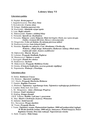 Lektury klasy VI Literatura polska B. Hejduk: Kwiat paproci I. Jurgielewiczowa: Ten obcy; Inna S. Kowalewski: Czarne okna M. Krüger: Godzina pąsowej róży M. Kuczyński: Atlantyda wyspa ognia S. Lem: Bajki robotów K. Makuszyński: Szatan z siódmej klasy E. Niziurski: Sposób na Alcybiadesa E. Nowacka: Małgosia contra Małgosia; Biały koń bogów; Dzień, noc i pora niczyja; Emilia z kwiatem lilii leśne; Burza w zlewozmywaku H. Ożogowska: Ucho od śledzia; Za minutę pierwsza miłość M. Rodziewiczówna: Lato leśnych ludzi K. Siesicka: Zapałka na zakręcie; Czas Abrahama; Chwileczkę Walerio...;Moja droga Aleksandro; Bethoven i dżinsy; Obok mnie; Ludzie jak wiatr; Jezioro osobliwości M. Dąbrowska: Marcin Kozera B. Leśmian: Przygody Sindbada Żeglarza M. Musierowicz: Opium w rosole J. Szczygieł: Ziemia bez słońca H. Sienkiewicz: Sachem W. Makowiecki: Przygody Meliklesa Greka H. Górska: O księciu Gotfrydzie, rycerzu gwiazdy wigilijnej K. Nepomucka: Wakacje z Penelopą Literatura obca D. Defoe: Robinson Cruzoe Ch. Dickens : Opowieść wigilijna A.C. Doyle: Przygody Sherlocka Holmesa T. Gautier: Kapitan Fracasse A. Hitchock: Tajemnica wypchanego kota; Tajemnica wędrującego jaskiniowca J. London: Biały kieł; Zew krwi L. M. Motgomery: Ania z Zielonego Wzgórza E. Kästner: Emil i detektywi R. Kipling: Księga dżungli J.R.R. Tolkien: Hobbit, czyli tam i z powrotem K. May: Skarb w Srebrnym Jeziorze; Winnetou R. Sabatini: Sokół morski R.L. Stevenson: Wyspa skarbów M. Twain: Przygody Hucka J. Verne: Tajemnicz wyspa; Piętnastoletni kapitan; 2000 mil podmorskiej żeglugi; W 80 dni dookoła świata; 2000 mil po Amazonce; Wokół księżyca; Dzieci Kapitana Granta; Dwa lata wakacji; Napowietrzna wioska A. Saint- Exupéry: Mały książę