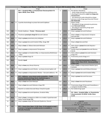 "Frangens non flectes" (Zegniesz, nie złamiesz) - Brevet 200 Grodzisk Wlkp. 13-08-2016r. Droga PK-1 – Grodzisk Wlkp. ul. Powstaoców Chocieszyoskich 76 Open: 08:00, Close: 09:00 2 114,0 S Droga Na odcinku obwodnicy - jazda drogą wewnętrzną asfaltową przez całą długośd obwodnicy zjazd na drogę przy skrzyżowaniu - dla odważnych jazda obwodnicą mijając pierwsze rondo drugi zjazd kierunek Poznao NIE POLECAM Zjazd z ronda - dla jadących drogą wewnętrzną pierwszy zjazd kierunek Poznao - dla jadących obwodnicą drugi zjazd kierunek Poznao Skręt w prawo kierunek Kozłowo 0,0 P Z punktu kontrolnego w prawo kierunek Grąblewo 5 119,0 0,9 0,9 S Rondo Grąblewo – Prosto – Pierwszy zjazd 3 122,0 P 4,55 5,45 S Ptaszkowo przecięcie drogi 32 kierunek Cykowo 5 127,0 L 7,45 12,9 P Skręt w prawo przecinamy tory kolejowe 4 131,0 P Skręt w lewo w miejscowości Uścięcice kierunek Buk Skręt w prawo kierunek Dobieżyn 0,6 13,5 P Skręt w prawo kierunek Grodzisk Wlkp. droga 308 2 133,0 L Skręt w lewo kierunek Buk 0,5 14,0 L Skręt w lewo ul. Główna kierunek Wolsztyn 3 136,0 P 4 18,0 P Skręt w prawo w miejscowości Parzęczewo 13 149,0 S 6,1 24,1 P 8 157,0 P 10,9 35,0 P Skręt w prawo na Grodzisk Wlkp. za miejscowością Wielichowo – Wieś Skręt w prawo droga 32 5 162,0 S Ostry skręt w prawo kierunek Stęszew – droga 306 Rondo drugi zjazd prosto kierunek Mosina, Kórnik Ostry zakręt w prawo kierunek Granowo droga 431 Przecinamy prosto drogę nr 5 0,3 35,3 Rondo 3 zjazd 3,5 165,5 0,3 35,6 L Skręt w lewo przy Straży Pożarnej 0,5 166,0 L 0,4 36 P Skręt w prawo kierunek Wioska – po lewej stronie będzie Lidl 1 167,0 P PK 3 – przy stacji benzynowej w Modrzu Open: 13:30, Close 19:10 – boczny parking wzdłuż ulicy Skręt w lewo w miejscowości Modrze (przy Kościele) Skręt w prawo kierunek Maksymilianowo 9,5 45,5 P Skręt w prawo w miejscowości Wioska – kierunek Jabłonna - PK 9 176,0 P Skręt w prawo kierunek Grodzisk Wlkp. 3,2 48,7 S 6 182 P Skręt w prawo kierunek Karczewo 0,5 49,2 L PK 2 - Jabłonna – przy starym wozie strażackim – Punkt Kasowy Nadobrzaoskiego Banku Spółdzielczego w Rakoniewicach Open: 09:45, Close 11:30 Skręt w lewo kierunek Wolsztyn 0,5 182,5 L Skręt w lewo kierunek Ptaszkowo 8,2 57,4 L Skręt w lewo kierunek Wolsztyn droga 305 7,5 190,0 S 4,1 61,5 Nawrót na rondzie kierunek Nowy Tomyśl (4 zjazd) 5 195,0 S Przecinamy drogę 32 kierunek Snowidowo a następnie Grodzisk Wlkp. Na rondzie drugi zjazd 17,1 78,6 P Skręt w prawo kierunek Kąkolewo, Grodzisk Wlkp. 1 196,0 14,4 93,0 L 11 104 P Skręt w lewo a następnie za 500 m na rondzie 3 zjazd kierunek Nowy Tomyśl droga 308 Skręt w prawo droga 307 kierunek Opalenica, Poznao 8 112 S PK 3 – Stacja Orlen Open: 11:30, Close: 15:10 wyjazd ze stacji w prawo a następnie na rondzie prosto na wiadukt w kierunku Poznania PK – Meta – Grodzisk Wlkp. ul. Powstaoców Chocieszyoskich 76 OPEN: 14:40, Close: 21:30 Legenda: P – prawo, S - prosto L – lewo, PK – punkt kontrolny Kontakt Maciej Kucharczak – 536 860 276 – trasa, organizacja Beata Kucharczak – 784 030 353 – organizacja Tel. alarmowy 112