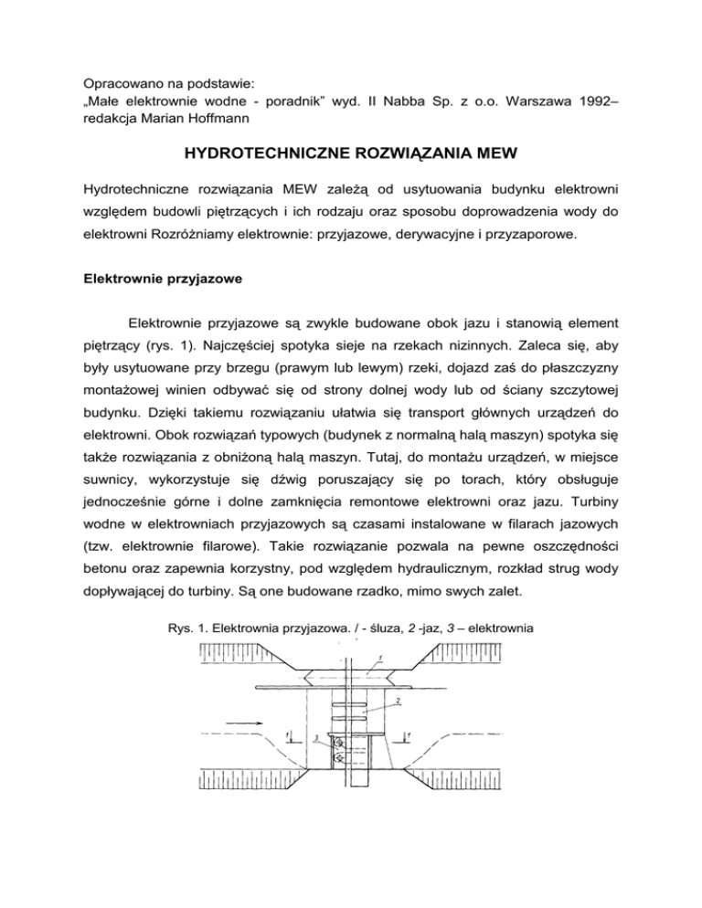 Opracowano na podstawie: „Małe elektrownie wodne - poradnik” wyd. II Nabba Sp. z o.o. Warszawa 1992– redakcja Marian Hoffmann HYDROTECHNICZNE ROZWIĄZANIA MEW Hydrotechniczne rozwiązania MEW zaleŜą od usytuowania budynku elektrowni względem budowli piętrzących i ich rodzaju oraz sposobu doprowadzenia wody do elektrowni RozróŜniamy elektrownie: przyjazowe, derywacyjne i przyzaporowe. Elektrownie przyjazowe Elektrownie przyjazowe są zwykle budowane obok jazu i stanowią element piętrzący (rys. 1). Najczęściej spotyka sieje na rzekach nizinnych. Zaleca się, aby były usytuowane przy brzegu (prawym lub lewym) rzeki, dojazd zaś do płaszczyzny montaŜowej winien odbywać się od strony dolnej wody lub od ściany szczytowej budynku. Dzięki takiemu rozwiązaniu ułatwia się transport głównych urządzeń do elektrowni. Obok rozwiązań typowych (budynek z normalną halą maszyn) spotyka się takŜe rozwiązania z obniŜoną halą maszyn. Tutaj, do montaŜu urządzeń, w miejsce suwnicy, wykorzystuje się dźwig poruszający się po torach, który obsługuje jednocześnie górne i dolne zamknięcia remontowe elektrowni oraz jazu. Turbiny wodne w elektrowniach przyjazowych są czasami instalowane w filarach jazowych (tzw. elektrownie filarowe). Takie rozwiązanie pozwala na pewne oszczędności betonu oraz zapewnia korzystny, pod względem hydraulicznym, rozkład strug wody dopływającej do turbiny. Są one budowane rzadko, mimo swych zalet. Rys. 1. Elektrownia przyjazowa. / - śluza, 2 -jaz, 3 – elektrownia Zasadniczą wadą tego typu elektrowni jest rozdzielenie turbozespołów na poszczególne filary jazowe powodujące uciąŜliwości w eksploatacji. Z innych rozwiązań naleŜy wymienić elektrownie wbudowane w konstrukcję jazu - wówczas instalowane są turbozespoły rurowe o osi poziomej. Taki układ technologiczny został przyjęty w MEW na zbiorniku Sulejów na rzece Pilicy (moc instalowana - 2 x 1,8 MW). Urządzenia elektryczne związane z eksploatacją turbozespołów są umieszczone w prawym przyczółku jazu, z wyjątkiem transformatorów, które znajdują się na terenie rozdzielni napowietrznej 15 kV. Wyprowadzenie mocy z generatorów do transformatorów rozwiązano przy . uŜyciu kabli. Powoduje to duŜe trudności oraz znaczne koszty wynikające z długości tras kablowych i mostów szynowych. Elektrownie z derywacją kanałową Rozwiązania z derywacją kanałową są stosowane na tych odcinkach rzeki, na których występują zakola. Wówczas budowa kanału skraca naturalny bieg rzeki, pozwalając na uzyskanie większego spadu niŜ wynosi spiętrzenie na jazie. W odróŜnieniu od elektrowni przyjazowej, w skład układu technologicznego wchodzą tutaj, prócz budynku elektrowni, kanał dopływowy górny z ujęciem wody i kanał odpływowy odprowadzający wodę z elektrowni do koryta rzeki. Ujęcie wody stanowi początkową budowlę derywacji kanałowej. UmoŜliwia ono pobór wody ze zbiornika i skierowanie jej do derywacji (kanału). W celu niedopuszczenia do przenikania większych ilości rumowiska w obszar ujęcia stosuje się często urządzenia do jego zatrzymania i usuwania, np.: - progi zatrzymujące rumowisko wleczone, - urządzenia płuczące (kanały płuczące z zamknięciami). Ochronę przed pływającymi zanieczyszczeniami stanowi krata rzadka, do zatrzymania napływu lodu słuŜy zaś ściana fartuchowa, zagłębiona poniŜej minimalnego poziomu wody. Schemat układu technologicznego elektrowni z derywacją kanałową przedstawiono na rys. 2. Rys. 2. Elektrownia wodna z derywacją kanałową, l - wlot do kanału, 2 -jaz piętrzący, 3 kraty rzadkie, 4 - kanał płuczący, 5 - zasuwa na wlocie do kanału, 6 - upust płuczący, 7 kanał derywacyjny, 8 - budynek elektrowni, 9 - kraty gęste, 10 - zasuwy na wlocie do turbin, 11 -zasuwa na upuście ulgi, 12 -kanały odpływowe, 13 - wylot kanału do rzeki, vt,v0 prędkości w kanale dopływowym i odpływowym, H - spad statyczny, ∆ h - straty hydrauliczne w kanale Elektrownie z derywacją rurociągową Elektrownie z rurociągami ciśnieniowymi są stosowane wówczas, gdy spad przekracza 20 — 30 m i gdy budynek elektrowni jest oddalony od ujęcia wody. Istotny wpływ na układ technologiczny tego rozwiązania mają warunki regulacji turbozespołów. Ograniczają one bowiem długość rurociągu. Wstępnie moŜna przyjąć, Ŝe warunek regulacji jest spełniony wówczas, gdy suma iloczynów długości i prędkości przepływu wody w rurociągach, spirali i rurze ssącej jest mniejsza lub równa dwudziesto-pięciokrotnej wartości spadu (H) elektrowni wg zaleŜności Σ LV< 25 H W skład układu technologicznego wchodzą: • ujęcie wody ze zbiornika lub kanału, • rurociąg ciśnieniowy, • budynek elektrowni, • kanał odpływowy. Usytuowanie elektrowni z derywacją rurociągową przyjmuje się zwykle prostopadle do trasy rurociągu. W elektrowniach z rurociągami wysokociśnieniowymi umieszcza się je równolegle do trasy ze względu na ochronę przed zniszczeniem budynku w przypadku awarii (pęknięcia) rurociągu, w wyjątkowych zaś przypadkach lokalizuje się budynek na drugim brzegu rzeki. Doprowadzenie wody do elektrowni moŜe odbywać się do kaŜdego turbozespołu osobnym rurociągiem lub jednym rurociągiem z rozgałęzieniem do kaŜdej turbiny, rys. 3. Indywidualne doprowadzenie wody jest korzystne ze względów eksploatacyjnych, gdyŜ zmniejsza to moŜliwość przestoju elektrowni w przypadku remontu lub awarii rurociągu. Rys. 3. Doprowadzania rurociągów do turbin: a) czołowe indywidualne, b) z rozgałęzieniem, c) boczne z rozgałęzieniem Elektrownie z derywacją mieszaną kanałowo-rurociągową Układ elektrowni kanałowo-rurociągowej jest stosowany wówczas, gdy trasa derywacji jest bardzo długa, a warunki terenowe pozwalają na częściowe jej wykonanie w postaci kanału otwartego, rys. 6.4. Kanał otwarty doprowadza wodę do ujęcia wody skąd, dalej, rurociągi