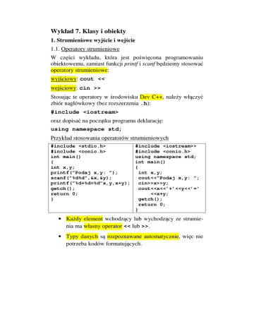 obiektowemu, zamiast funkcji printf i scanf będziemy stosować