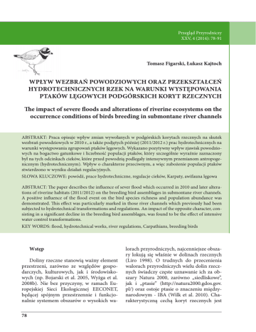 Przegląd Przyrodniczy XXV, 4 (2014): 78-91 Tomasz Figarski, Łukasz Kajtoch Wpływ wezbrań powodziowych oraz przekształceń hydrotechnicznych rzek na warunki występowania ptaków lęgowych podgórskich koryt rzecznych The impact of severe floods and alterations of riverine ecosystems on the occurrence conditions of birds breeding in submontane river channels ABSTRAKT: Praca opisuje wpływ zmian wywołanych w podgórskich korytach rzecznych na skutek wezbrań powodziowych w 2010 r., a także podjętych później (2011/2012 r.) prac hydrotechnicznych na warunki występowania zgrupowań ptaków lęgowych. Wykazano pozytywny wpływ zjawisk powodziowych na bogactwo gatunkowe i liczebność populacji ptaków, który szczególnie wyraźnie zaznaczony był na tych odcinkach cieków, które przed powodzią podlegały intensywnym przemianom antropogenicznym (hydrotechnicznym). Wpływ o charakterze przeciwnym, a więc zubożenie populacji ptaków stwierdzono w wyniku działań regulacyjnych. SŁOWA KLUCZOWE: powódź, prace hydrotechniczne, regulacje cieków, Karpaty, awifauna lęgowa ABSTRACT: The paper describes the influence of sever flood which occurred in 2010 and later alterations of riverine habitats (2011/2012) on the breeding bird assemblages in submontane river channels. A positive influence of the flood event on the bird species richness and population abundance was demonstrated. This effect was particularly marked in those river channels which previously had been subjected to hydrotechnical transformations and regulations. An impact of the opposite character, consisting in a significant decline in the breeding bird assemblages, was found to be the effect of intensive water control transformations. KEY WORDS: flood, hydrotechnical works, river regulations, Carpathians, breeding birds Wstęp Doliny rzeczne stanowią ważny element przestrzeni, zarówno ze względów gospodarczych, kulturowych, jak i środowiskowych (np. Bojarski et al. 2005, Wyżga et al. 2008b). Nie bez przyczyny, w ramach Europejskiej Sieci Ekologicznej EECONET, będącej spójnym przestrzennie i funkcjonalnie systemem obszarów o wysokich wa78 lorach przyrodniczych, najcenniejsze obszary lokują się właśnie w dolinach rzecznych (Liro 1998). O trudnych do przecenienia walorach przyrodniczych wielu dolin rzecznych świadczy częste uznawanie ich za obszary Natura 2000, zarówno „siedliskowe”, jak i „ptasie” (http://natura2000.gdos.gov. pl/) oraz ostoje ptasie o znaczeniu międzynarodowym - IBA (Wilk et al. 2010). Charakterystyczną cechą koryt rzecznych jest Figarski T., Kajtoch Ł. – Wpływ wezbrań powodziowych oraz przekształceń hydrotechnicznych ... ich zmienność czasowa i przestrzenna oraz podleganie intensywnym przemianom środowiskowym. Naturalnie przemiany takie są skutkiem intensywnych wezbrań i powodzi, które okresowo doprowadzają do gwałtownych przekształceń morfologii koryt i dolin rzecznych, przez co stwarzają warunki do dynamicznego utrzymywania się dużej heterogenności siedlisk rzecznych i nadrzecznych, wykorzystywanych przez bogate zespoły organizmów (np. Sparks 1995, Reeves et al. 1996). W przypadku rzek karpackich istotne przemiany morfologiczne zaszły ostatnio w wyniku dużych wezbrań w 2010 r. (Wiejaczka i Bochenek 2013). Gatunki rzeczne i nadrzeczne ewolucyjnie i ekologicznie przystosowane są do takich, często pozornie „katastrofalnych”, przemian hydromorfologicznych. Naturalne siedliska koryt rzecznych nie bez powodu określane są jako pionierskie, ponieważ dynamiczny wpływ wezbrań wymusza ich okresowe „odradzanie się” i „odmładzanie”. Analogicznie populacje organizmów rzecznych są zaadaptowane do fluktuacji zasięgu i liczebności, gatunki takie potrafią szybko „regenerować” swoje populacje (Poff et al. 1997, Hart i Finelli 1999). Oprócz zjawisk naturalnych, na koryta i doliny rzeczne oddziałują również przekształcenia antropogeniczne, będące czynnikiem stosunkowo nowym, drastycznie zmieniającym charakter koryt rzecznych oraz (co być może istotniejsze) poprzez ujarzmienie wody - niwelującym naturalne dynamiczne zmiany siedliskowe. Zjawisko regulacji rzek karpackich przybrało nasilone rozmiary w XX wieku (Wyżga 2007). Efektem regulacji jest zazwyczaj przekształcenie koryt z wielonurtowych w jednonurtowe, ich skrócenie, wyprostowanie i zwężenie oraz pogłębienie, w efekcie czego następuje zwiększenie spadku i prędkości przepływu wody, a w konsekwencji wzmożony proces erozji wgłębnej (Korpak 2007, 2008). W efekcie budowy infrastruktury hydrotechnicznej usuwane są naturalne elementy koryt rzecznych (aluwia, skarpy, wykroty i rumosz drzewny), a brzegi i dno są umacniane i/lub przegra- dzane. Powoduje to zanik lokalnych siedlisk charakterystycznych dla koryt rzecznych i jednocześnie może prowadzić do ekspansji gatunków nierodzimych dla tego typu środowisk oraz zubożenia bazy pokarmowej wielu organizmów. Po regulacjach rodzime gatunki mają więc ograniczoną możliwość występowania i rozrodu. Zaburzenia w naturalnym przepływie wód (m.in. poprzez budowę i funkcjonowanie infrastruktury hydrotechnicznej) są uznawane za jedno z najpoważniejszych zagrożeń dla środowiska i przyrody (Naiman et al. 1995, Sparks 1995, Ward et al. 1999). Wpływ regulacji i przegradzania rzek na przyrodnicze elementy dolin rzecznych był przedmiotem stosunkowo licznych opracowań (rewizje w Nilsson i Dynessius 1994, Knutson i Klass 1997, Nilsson i Berggren 2000), przy czym większość z nich dotyczyła siedlisk lub gatunków terenów zalewowych (mokradeł, lasów łęgowych) (np. Kingsford i Thomas 2004, DesGranges et al. 2006) lub sztucznych zbiorników (np. Dyrcz et al. 1998, Szlama i Majewski 1998, Gwiazda 2000, Wiehle et al. 2002), a w literaturze prawie brak było przykładów analogicznych badań nad gatunkami zasiedlającymi koryta rzeczne. Ponadto badania wpływu przemian hydrotechnicznych na ogół odnosiły si