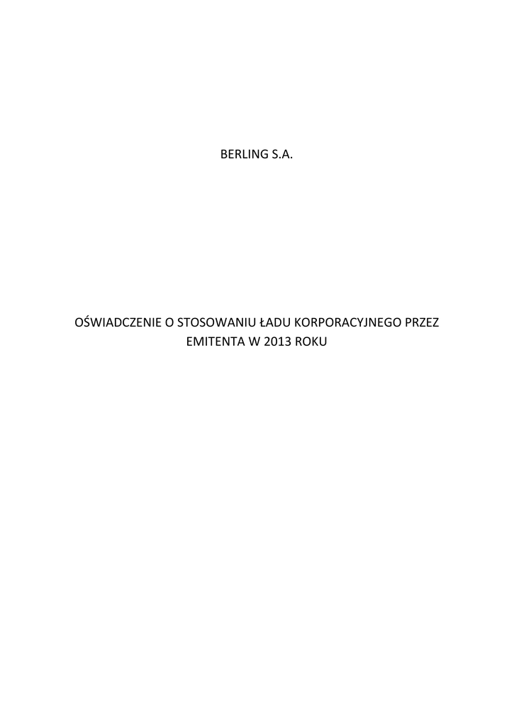 BERLING S.A. OŚWIADCZENIE O STOSOWANIU ŁADU KORPORACYJNEGO PRZEZ EMITENTA W 2013 ROKU Zbiór Zasad Ładu Korporacyjnego, któremu podlega Emitent, oraz miejsce, gdzie tekst zbioru jest publicznie dostępny Zarząd BERLING S.A. z siedzibą w Warszawie w związku z § 29 pkt 2 podlega Regulaminowi Giełdy Papierów Wartościowych zbiorowi zasad ładu korporacyjnego uchwalonego przez Radę Giełdy Tekst zbioru zasad ładu korporacyjnego jest dostępny na stronie z poniższym adresem: www.corp-gov.gpw.pl/assets/library/polish/regulacje/dobre_praktyki_16_11_2012.pdf Zakres, w jakim emitent odstąpił od postanowień zasad ładu korporacyjnego. Emitent w roku 2013 odstąpił od stosowania następujących zasad „Dobrych Praktyk Spółek Notowanych na Giełdzie Papierów Wartościowych: I Rekomendacje dotyczące dobrych praktyk spółek giełdowych: Zasada I.5 Spółka powinna posiadać politykę wynagrodzeń oraz zasady jej ustalania. Polityka wynagrodzeń powinna w szczególności określać formę, strukturę i poziom wynagrodzeń członków organów nadzorujących i zarządzających. Przy określaniu polityki wynagrodzeń członków organów nadzorujących i zarządzających spółki powinno mieć zastosowanie zalecenie Komisji Europejskiej z 14 grudnia 2004 r. w sprawie wspierania odpowiedniego systemu wynagrodzeń dyrektorów spółek notowanych na giełdzie (2004/913/WE), uzupełnione o zalecenie KE z 30 kwietnia 2009 r. (2009/385/WE). Emitent jeszcze nie posiada polityki wynagradzania. Wynagrodzenie zarządu określa Rada Nadzorcza i jest to stałe wynagrodzenie miesięczne, Rada Nadzorcza może dodatkowo przyznać premię, Członkowie Rady Nadzorczej są wynagradzani za posiedzenie, z wyjątkiem Przewodniczącego Rady, który otrzymuje stałe comiesięczne wynagrodzenie. Spółka zamierza w niedalekiej przyszłości wdrożyć ww. rekomendacje Zasada I.12 Spółka powinna zapewnić akcjonariuszom możliwość wykonywania osobiście lub przez pełnomocnika prawa głosu w toku walnego zgromadzenia, poza miejscem odbywania walnego zgromadzenia, przy wykorzystaniu środków komunikacji elektronicznej. Ze względu na koszty i skomplikowanie tego procesu, Spółka odstąpiła od stosowania ww. rekomendacji w całości: II Dobre praktyki realizowane przez zarządy spółek giełdowych: Zasada II.1 Spółka prowadzi korporacyjną stronę internetową i zamieszcza na niej , oprócz informacji wymaganych przez przepisy prawa: 2a) corocznie, w czwartym kwartale – informacje o udziale kobiet i mężczyzn odpowiednio w zarządzie i w radzie nadzorczej spółki w okresie dwóch lat, Spółka odstąpiła od stosowania ww. dobrej praktyki realizowanej przez zarządy spółek giełdowych Spółka zamierza zamieścić takie informacje od czwartego kwartału 2014r. 9a) zapis przebiegu obrad walnego zgromadzenia, w formie audio lub wideo Ze względu na koszty i skomplikowanie tego procesu, Spółka odstąpiła od stosowania ww. rekomendacji w całości: 14) informację o treści obowiązującej w spółce reguły dotyczącej zmienienia podmiotu uprawnionego do badania sprawozdań finansowych lub informację o braku takiej reguły Obecnie brak takiej reguły w Spółce. Spółka nie widzi takiej potrzeby, gdyż o wyborze podmiotu do badania sprawozdań finansowych decyduje co roku Rada Nadzorcza i zawsze wybiera optymalną ofertę. Spółka rozważy w przyszłości wdrożenie takiej reguły. Spółka rozważy w przyszłości wdrożenie takiej reguły. Zasada II.2 Spółka zapewnia funkcjonowanie swojej strony internetowej również w języku angielskim, przynajmniej w zakresie wskazanym w części II. pkt 1. Ze względu na koszty tłumaczenia, Zarząd zdecydował o niestosowaniu powyższej zasady. Spółka rozważy w przyszłości zamieszczanie w języku angielskim wymaganych informacji. IV Dobre praktyki stosowane przez akcjonariuszy: Zasada IV.1 Dzień ustalenia praw do dywidendy oraz dzień wypłaty dywidendy powinny być tak ustalone, aby czas przypadający pomiędzy nimi był możliwie najkrótszy, a w każdym przypadku nie dłuższy niż 15 dni roboczych. Ustalenie dłuższego okresu pomiędzy tymi terminami wymaga szczegółowego uzasadnienia. Akcjonariusze niestosują powyższej zasady. Zasada IV.10 Spółka powinna zapewnić akcjonariuszom możliwość udziału w walnym zgromadzeniu przy wykorzystaniu środków komunikacji elektronicznej, polegającej na: 1) transmisji obrad walnego zgromadzenia w czasie rzeczywistym 2) dwustronnej komunikacji w czasie rzeczywistym, w ramach której akcjonariusze mogą wypowiadać się w toku obrad walnego zgromadzenia przebywając w miejscu innym niż miejsce obrad Ze względu na koszty i skomplikowanie tego procesu, Spółka odstąpiła od stosowania ww. rekomendacji w całości: Opis głównych cech stosowanych w przedsiębiorstwie emitenta systemów kontroli wewnętrznej i zarządzania ryzykiem w odniesieniu do procesu sporządzania sprawozdań finansowych i skonsolidowanych sprawozdań finansowych. W spółce za nadzór nad całym procesem sporządzania sprawozdań finansowych i skonsolidowanych sprawozdań finansowych jest odpowiedzialna specjalnie do tego wydzielona komórka organizacyjna, która również odpowiada za terminowość przekazywania raportów bieżących i okresowych. Do podstawowych regulacji w zakresie sporządzania sprawozdań finansowych należą zasady polityki rachunkowości stosowane u emitenta, jak i w grupie kapitałowej. Ponadto ocena rzetelności i prawidłowości sprawozdania finansowego oraz skonsolidowanego sprawozdania finansowego jest dokonywana przez niezależnego Biegłego Rewidenta Opis zasad dotyczących powoływania i odwoływania osób zarządzających oraz ich uprawnień Za powoływanie i odwoływanie Członków Zarządu jest odpowiedzialna Rada Nadzorcza, zgodnie ze statutem firmy, który określa uprawnienia członków zarządu Opis zasad zmiany statutu Zmiany statutu spółki może dokonać Walne Zgromadzenie Akcj