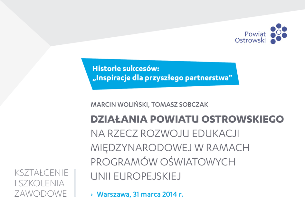 Historie sukcesów: „Inspiracje dla przyszłego partnerstwa” Marcin Woliński, Tomasz Sobczak KSZTAŁCENIE I SZKOLENIA ZAWODOWE Działania Powiatu Ostrowskiego na rzecz rozwoju edukacji międzynarodowej w ramach programów oświatowych Unii Europejskiej ›› Warszawa, 31 marca 2014 r. Powiat Ostrowski wspierał realizację międzynarodowych projektów w ramach programu „Uczenie się przez całe życie” ze względu na: ›› możliwość zdobycia przez uczestników projektów (zarówno młodzież jak i kadrę nauczycielską) cennych nowych, cennych doświadczeń zawodowych, ›› wspieranie rozwoju osobistego oraz zawodowego młodzieży oraz kadry nauczycielskiej, ›› wzrost kompetencji językowych i kulturowych młodzieży i kadry nauczycielskiej, ›› wspieranie innowacyjnego podejścia do edukacji i doskonalenia zawodowego. Historie sukcesów: „Inspiracje dla przyszłego partnerstwa” Powiat Ostrowski wspierał realizację międzynarodowych projektów w ramach programu „Uczenie się przez całe życie” ze względu na: ›› ›› ›› ›› wzrost jakości i zwiększenie atrakcyjności szkolnictwa zawodowego, wspieranie nowoczesnych metod zarządzania oświatą, rozwój partnerstwa międzynarodowego, możliwość kształtowania wrażliwości kulturowej. Historie sukcesów: „Inspiracje dla przyszłego partnerstwa” Powiat Ostrowski wspierał swoje placówki oświatowe w przygotowaniu i realizacji projektów w ramach programu „Uczenie się przez całe życie” poprzez: ›› ›› ›› ›› pomoc w pozyskaniu odpowiedniego partnera projektu, utworzenie tzw. grupy roboczej do prac nad projektem w danej placówce oświatowej, przygotowanie tzw. wizyty roboczej (np. w ramach wizyty przygotowawczej), pomoc w przygotowaniu wniosku aplikacyjnego (negocjacje z partnerem, uzgodnienie planu realizacji projektu, program stażu/wymiany). Historie sukcesów: „Inspiracje dla przyszłego partnerstwa” Powiat Ostrowski wspierał swoje placówki oświatowe w przygotowaniu i realizacji projektów w ramach programu „Uczenie się przez całe życie” poprzez: ›› pomoc w przygotowaniu umowy na realizację projektu z właściwą instytucją (np. FRSE) oraz z uczestnikami projektu, ›› wsparcie w realizacji projektu, ›› pomoc w promocji, właściwym raportowaniu i rozliczeniu projektu. Historie sukcesów: „Inspiracje dla przyszłego partnerstwa” Efekty naszej współpracy: ›› ›› ›› ›› kilkadziesiąt zrealizowanych projektów staży i wymian międzynarodowych, ponad 1000 uczestników projektów, wdrożenie innowacyjnych metod w kształceniu zawodowym, nabycie przez uczestników kompetencji zawodowych, językowych i społecznych. Historie sukcesów: „Inspiracje dla przyszłego partnerstwa” Efekty naszej współpracy: ›› rozwój osobisty i zawodowy uczestników, ›› zwiększenie szans na zatrudnienie, ›› zrozumienie znaczenia uczenia się przez całe życie. Historie sukcesów: „Inspiracje dla przyszłego partnerstwa” Efekty naszej współpracy: ›› internacjonalizacja placówek oświatowych, ›› modyfikacja oferty edukacyjnej szkół, ›› możliwość realizacji praktyk zawodowych za granicą. Historie sukcesów: „Inspiracje dla przyszłego partnerstwa” Efekty naszej współpracy: ›› wzmocnienie więzi pomiędzy światem pracy (przedsiębiorstwa) i światem nauki (szkoły zawodowe), ›› wzmocnienie marki oraz poprawa wizerunku szkół i ich perspektyw rozwoju, ›› zwiększenie wymiaru europejskiego instytucji. Historie sukcesów: „Inspiracje dla przyszłego partnerstwa” Efekty naszej współpracy: ›› dziesięcioletnia współpraca kilkunastu placówek oświatowych ze swoim organem prowadzącym, ›› powstanie tzw. zespołu projektowego w każdej placówce oświatowej, ›› owocna współpraca Powiatu Ostrowskiego z instytucjami partnerskimi z Niemiec, Wielkiej Brytanii, Francji, Włoch, Finlandii i Węgier. Historie sukcesów: „Inspiracje dla przyszłego partnerstwa” Efekty naszej współpracy: ›› zdobycie przez Powiat Ostrowski renomy na terenie państw partnerów zagranicznych oraz w regionie południowej Wielkopolski, ›› działalność projektowa Powiatu Ostrowskiego inspiracją dla sąsiednich samorządów i ich placówek oświatowych. Historie sukcesów: „Inspiracje dla przyszłego partnerstwa” Historie sukcesów: „Inspiracje dla przyszłego partnerstwa” Historie sukcesów: „Inspiracje dla przyszłego partnerstwa” Historie sukcesów: „Inspiracje dla przyszłego partnerstwa” Historie sukcesów: „Inspiracje dla przyszłego partnerstwa” Dziękujemy za uwagę! Marcin Woliński Tomasz Sobczak Referat Pozyskiwania Środków Zewnętrznych Starostwa Powiatowego w Ostrowie Wielkopolskim [email protected] www.powiat-ostrowski.pl