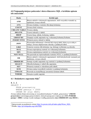 4.0 Najpopularniejsze polecenia i słowa kluczowe SQL z krótkim opisem