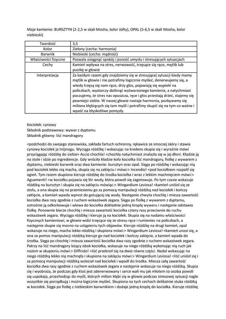 Moje kamienie: BURSZTYN (2-2,5 w skali Mosha, kolor żółty), OPAL (5-6,5 w skali Mosha, kolor niebieski) Twardość Kolor Barwnik Właściwości fizyczne Cechy Interpretacja 3,5 Zielony (cecha: harmonia) Niebieski (cecha: mądrość) Pozwala osiągnąć spokój i jasność umysłu i stresujących sytuacjach Kamień wpływa na stres, nerwowość, trzęsące się ręce, mętlik lub pustkę w głowie Za każdym razem gdy znajdziemy się w stresującej sytuacji kiedy mamy mętlik w głowie i nie potrafimy logicznie myśleć, denerwujemy się, a wtedy trzęsą się nam ręce, drży głos, pojawiają się wypieki na policzkach, wystarczy dotknąć wytworzonego kamienia, a natychmiast poczujemy, że stres nas opuszcza, ręce i głos przestają drżeć, stajemy się pewniejsi siebie. W naszej głowie nastaje harmonia, pozbywamy się miliona kłębiących się tam myśli i potrafimy skupić się na tym co ważne i wpaść na błyskotliwe pomysły. Kociołek: cynowy Składnik podstawowy: wywar z dyptamu Składnik główny: liść mandragory <podchodzi do swojego stanowiska, zakłada fartuch ochronny, rękawice ze smoczej skóry i stawia cynowy kociołek ja trójnogu. Wyciąga różdżkę i wskazując na kredens skupia się i wyraźnie mówi przyciągając różdżkę do siebie> Accio chochla! <chochla natychmiast znalazła się w jej dłoni. Kładzie ją na stole i idzie po ingrediencje. Gdy wróciła kładzie koło kociołka liść mandragory, fiolkę z wywarem z dyptamu, niebieski barwnik oraz dwa kamienie: bursztyn oraz opal. Sięga po różdżkę i wskazując nią pod kociołek lekko nią macha, skupia się na zaklęciu i mówi:> Incendio! <pod kociołkiem rozpalił się ogień. Tym razem skupiona kieruje różdżkę do środka kociołka i wraz z lekkim machnięciem mówi:> Aguamenti! <w kociołku pojawia się litr wody, która powoli się zagotowuje. Po tym czasie wskazuje różdżką na bursztyn i skupia się na zaklęciu mówiąc:> Wingardium Leviosa! <kamień uniósł się ze stołu, a ona skupia się na przeniesieniu go za pomocą manipulacji różdżką nad kociołek i kończy zaklęcie, a kamień wpada wprost do gotującej się wody. Następnie chwyta chochlę i miesza zawartość kociołka dwa razy zgodnie z ruchem wskazówek zegara. Sięga po fiolkę z wywarem z dyptamu, ostrożnie ją odkorkowuje i wlewa do kociołka dokładnie jedną kroplę wywaru i następnie odstawia fiolkę. Ponownie bierze chochlę i miesza zawartość kociołka cztery razy przeciwnie do ruchu wskazówek zegara. Wyciąga różdżkę i kieruje ją na kociołek. Skupia się na nadaniu właściwości fizycznych kamieniowi, w głowie widzi trzęsące się ze stresu ręce i rumieniec na policzkach, a następnie skupie się mocno na ustąpieniu tych objawów. Kieruje różdżkę na drugi kamień, opal wskazuje na niego, macha lekko różdżką i skupiona mówi:> Wingardium Leviosa! <kamień unosi się, a ona za pomoc manipulacji różdżką kieruje go nad kociołek i kończy zaklęcie, a kamień wpada do środka. Sięga po chochlę i miesza zawartość kociołka dwa razy zgodnie z ruchem wskazówek zegara. Patrzy na liść mandragory leżący obok kociołka, wskazuje na niego różdżką wykonując nią ruch jak nożem w skupieniu mówi:> Diffindo! <liść przekroił się na dwie równe części. Nadal wskazując na niego różdżką lekko nią machnęła i skupiona na zaklęciu mówi:> Wingardium Leviosa! <liść uniósł się i za pomocą manipulacji różdżką wzleciał nad kociołek i wpadł do środka. Miesza całą zawartość kociołka dwa razy zgodnie z ruchem wskazówek zegara a następnie wskazuje na niego różdżką. Skupia się i wyobraża, że podczas gdy ktoś jest zdenerwowany i serce wali mu jak młotem to osoba powoli się uspokaja, przechodząc do myśli, których milion kłębi się w głowie podczas stresowej sytuacji nagle wszystkie się porządkują i można logicznie myśleć. Skupiona na tych cechach delikatnie stuka różdżką w kociołek. Sięga po fiolkę z niebieskim barwnikiem i dodaje jedną kroplę do kociołka. Kieruje różdżkę na pozostawione na stole niezużyte do końca ingrediencje delikatnie nią w nie stuka i skupiona mówi:> Evanesco! <wszystkie niepotrzebne fiolki zniknęły, a ona mając posprzątane stanowisko dogląda swojego kociołka. Widząc, że ogień lekko przygasa wskazuje różdżką na palenisko, skupia się i lekko nią macha mówiąc:> Incendio! <ogień pod kociołkiem nieco się zwiększył. Po około godzinie zauważa dym unoszący się z kociołka. Kieruje różdżkę na palenisko, macha nią w jego kierunku, skupia się na zaklęciu i mówi:> Aguamenti! <strumieniem wody wydobywającym się z różdżki gasi ogień pod kociołkiem, a następnie wskazuje różdżką kamień na jego dnia, macha różdżką w swoim kierunku i skupiona mówi:> Accio kamień! <kamień wzleciał prostu do jej dłoni, a ona przyjrzała mu się dokładnie i pomyślała, że nazwie go OPTYN. Następnie skierowała różdżkę na kociołek i w skupieniu powiedziała:> Chłoszczyść! <kociołek błyskawicznie się wyczyścił>